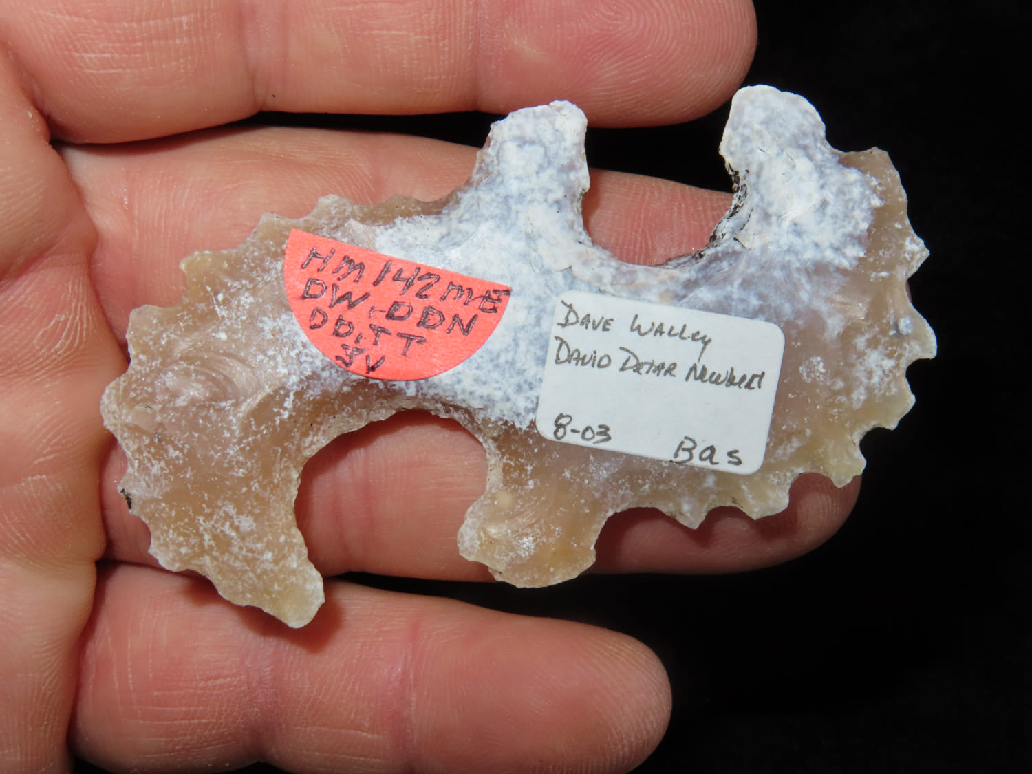 2 3/4″ Heavily Serrated Eccentric Flint Effigy, semi trranslucent chert, Mayan found in Belize EX. Herb Mangold / Tim Terwelp collection