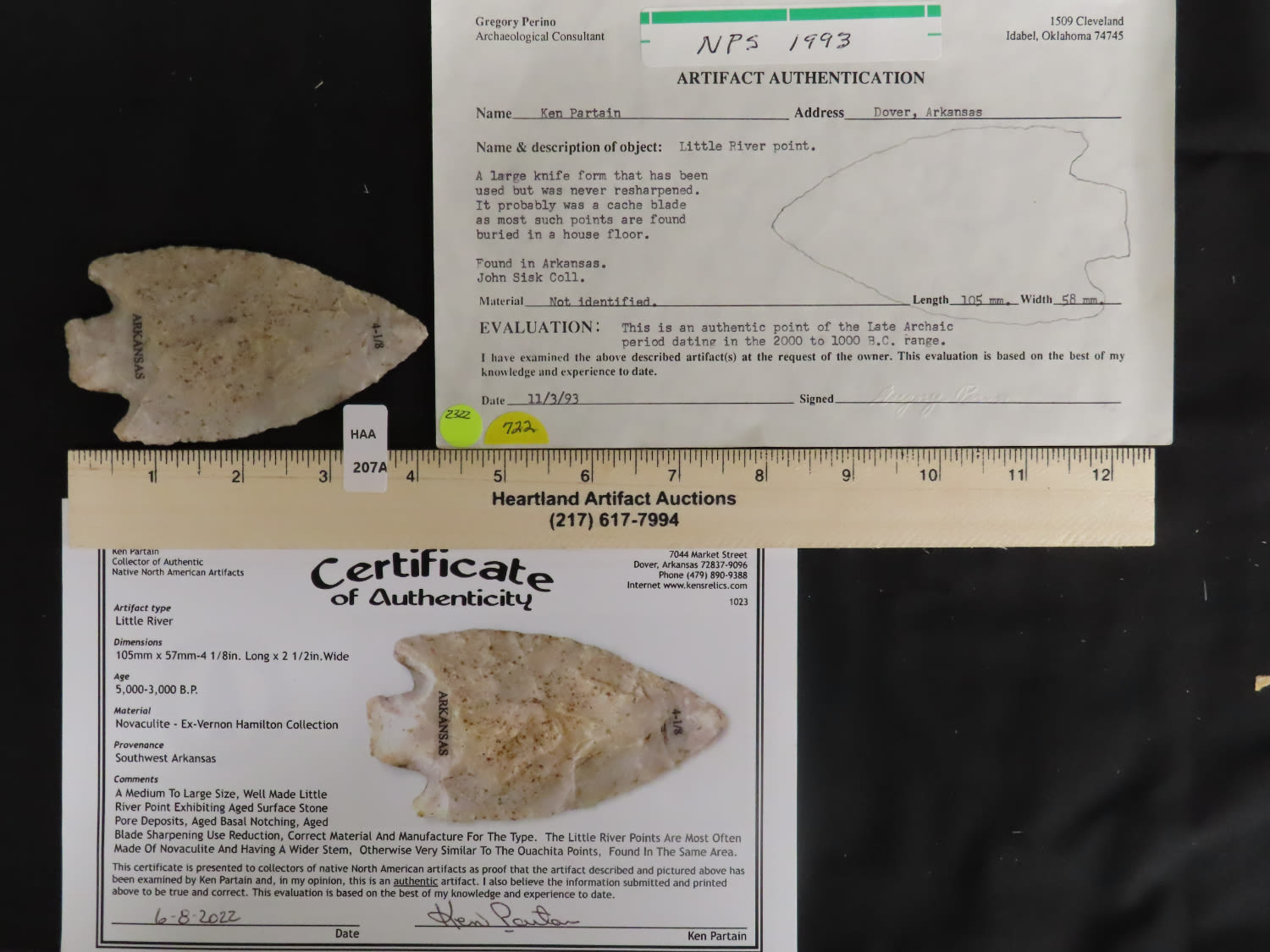 4 1/8″ Little River Point from the Arcaic Period (5000-3000 BC), Partian COA, Found in Arkansas; Made of Novaculite. Ex- Vernon Hamilton Collection, Previous John Sisk Collection
