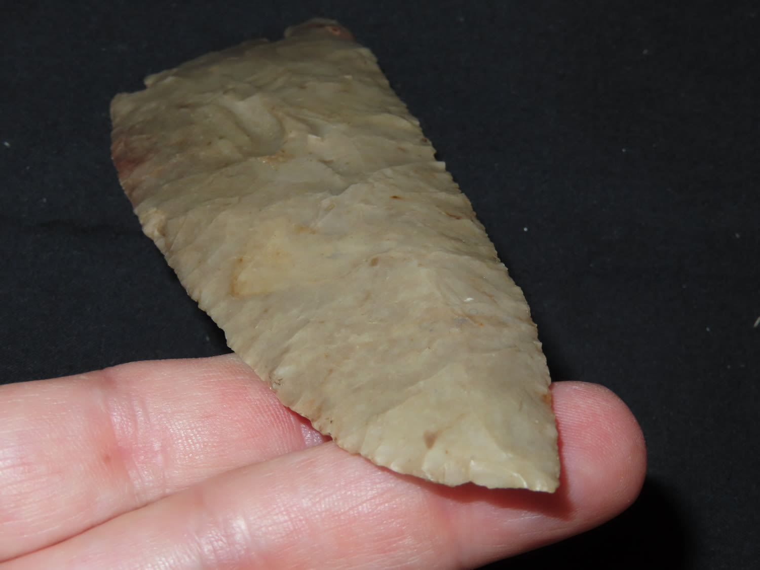 4 5/8″ Ancient Base Tang Knife, Dwain Rogers COA, Very nice brown and tan colored Chert; Blade is percussion flaked with pressure flake sharpening on one side.