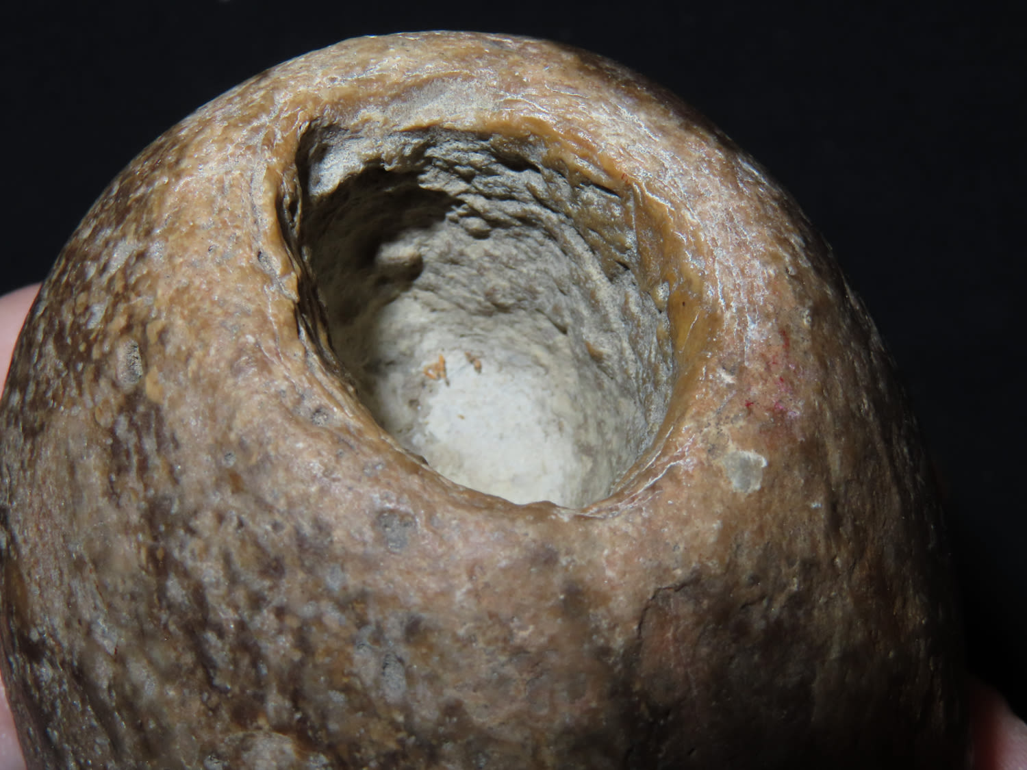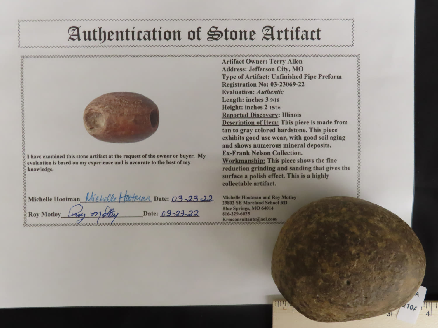 3 9/16″ Unfinished Pipe Preform, Motley COA, Found in Illinois; Made from tan to gray colored hardstone. Ex- Frank Nelson Collection.