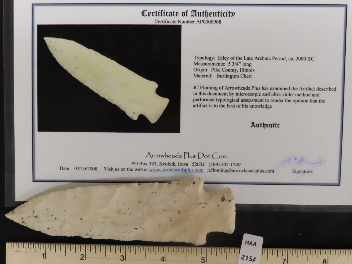 5 3/4″ Etley from the Arcaic Period (ca. 2000 BC), JC Floming COA, Found in Pike County, Illinois