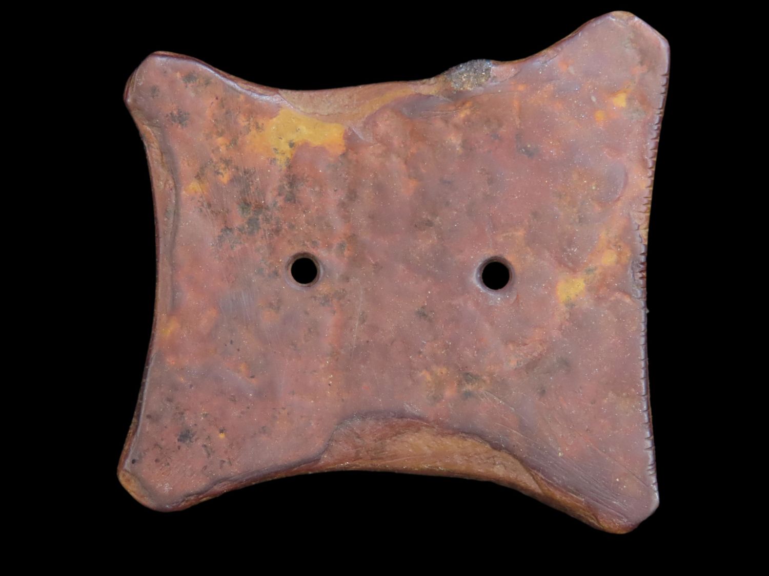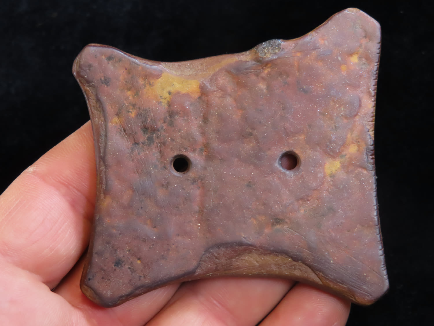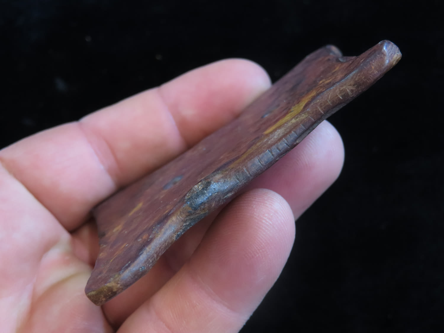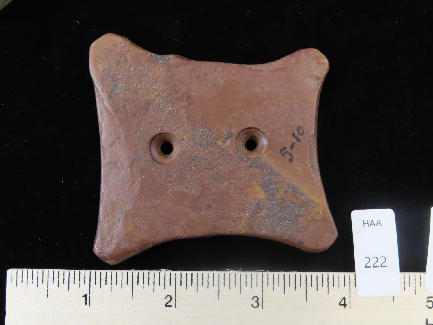 2 3/4″ Hematite Reel Gorget, Ex William Gehlken Collection, Illinois City, Illinois-Pictured in Who’s Who in Indian Relics #8, multiple tally marks around the edges
