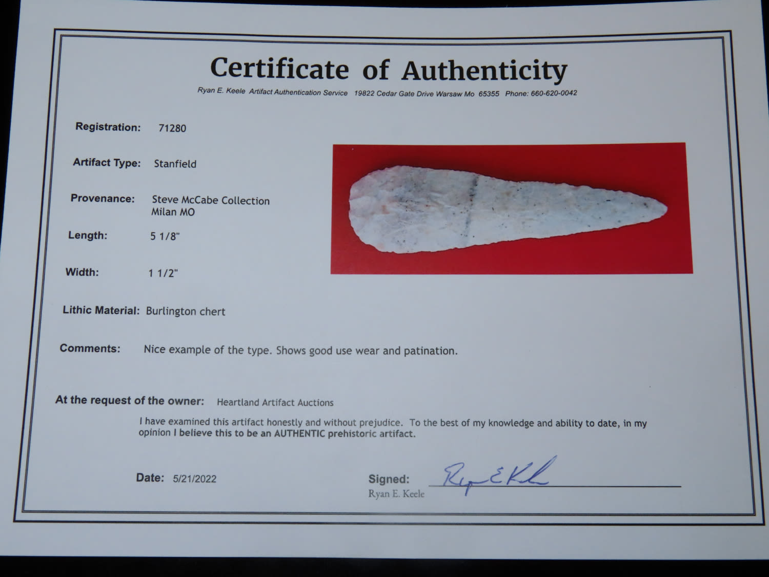 5 1/8″ Stanfield, Keele COA, From the Steve McCabe Collection, Milan, Sullivan County Missouri