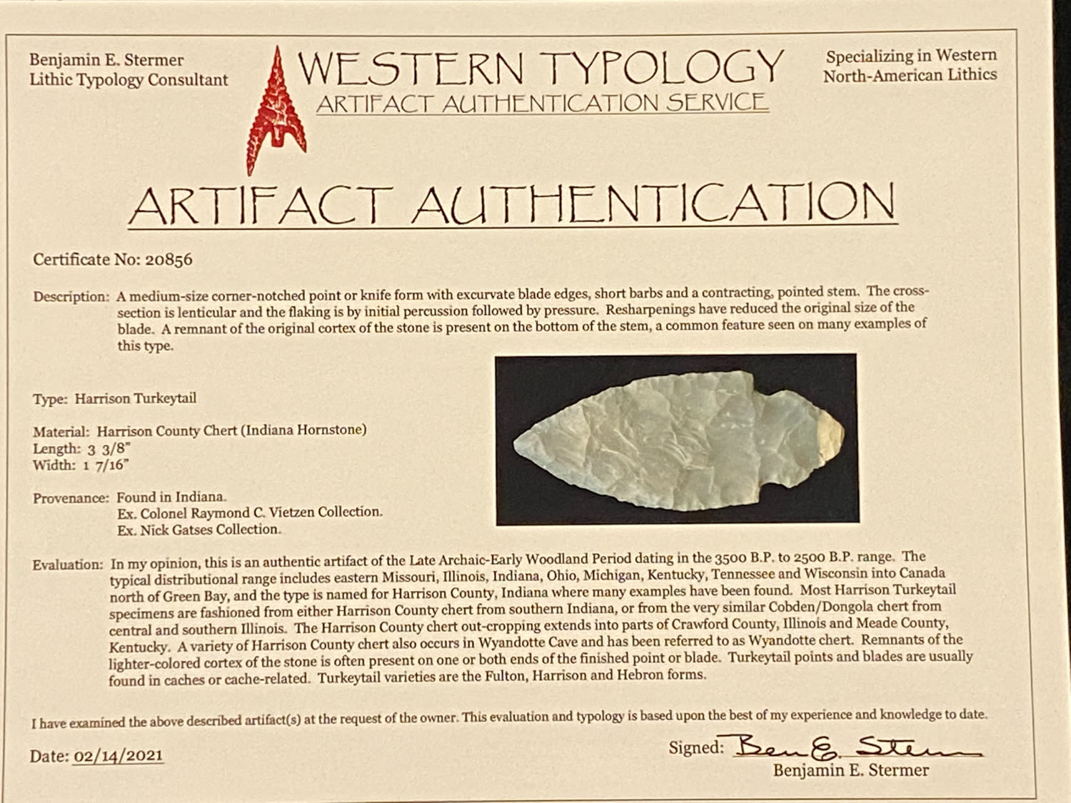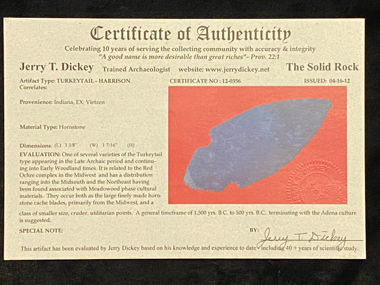 3 3/8″ Harrison Turkey Tail made of Hornstone, Ex Colonel Vietzen, Indiana, Jerry Dickey COA and Ben Stermer COA