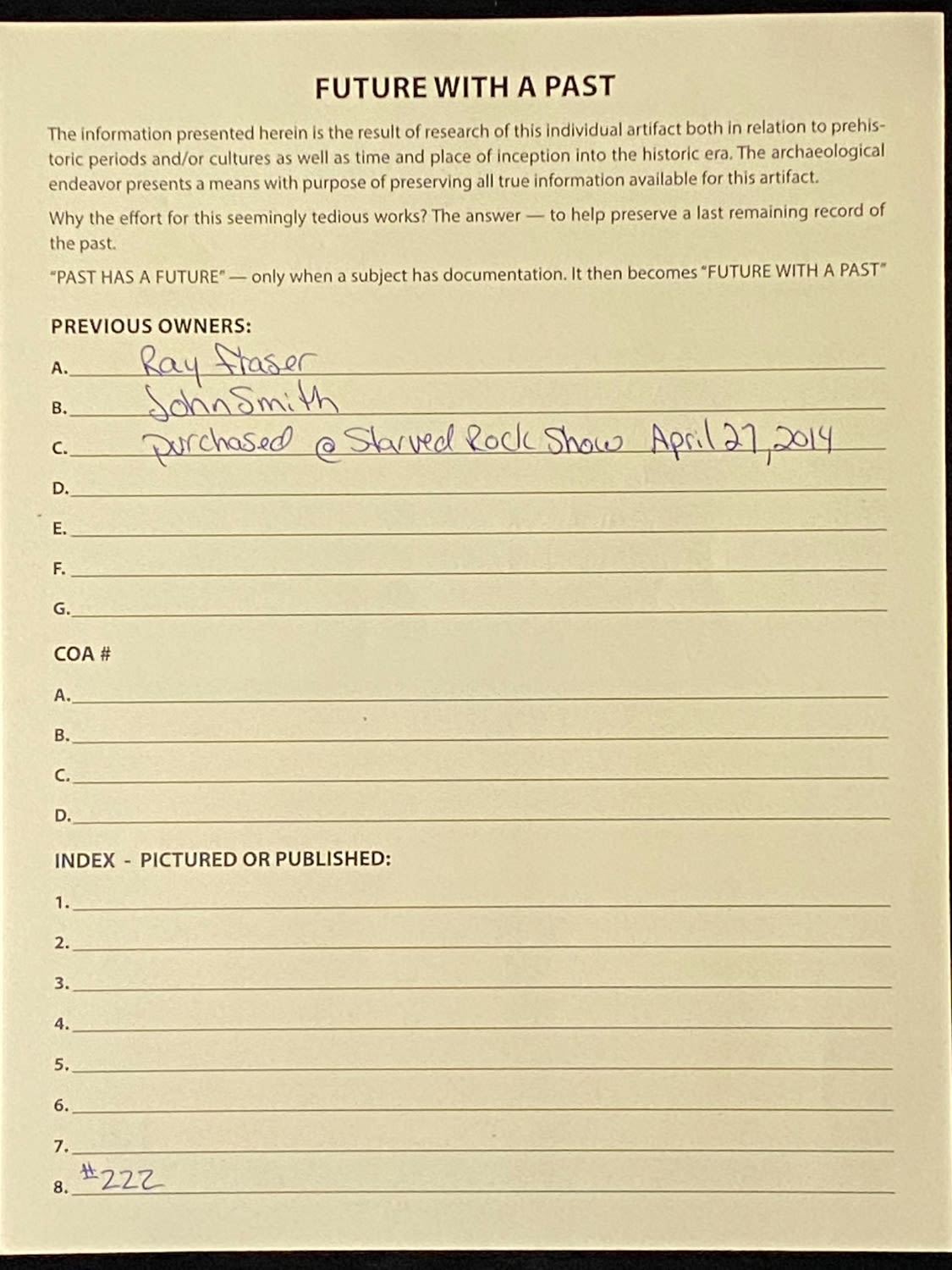 2 5/8″ Miniature banded slate Celt, Indiana, Ex Steve Gobeli Ex Ray Fraser Ex John Smith, Comes with Certificate of Origin