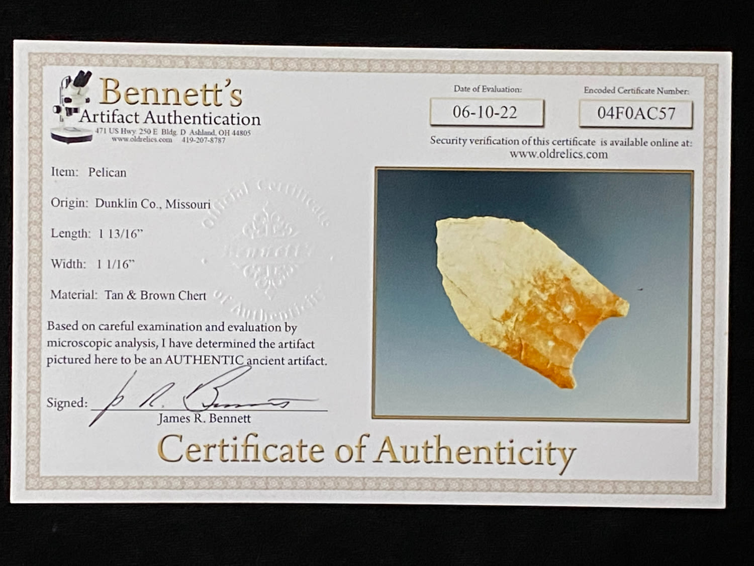 1 13/16″ Pelican, Dunklin Co, Missouri, Jim Bennett COA