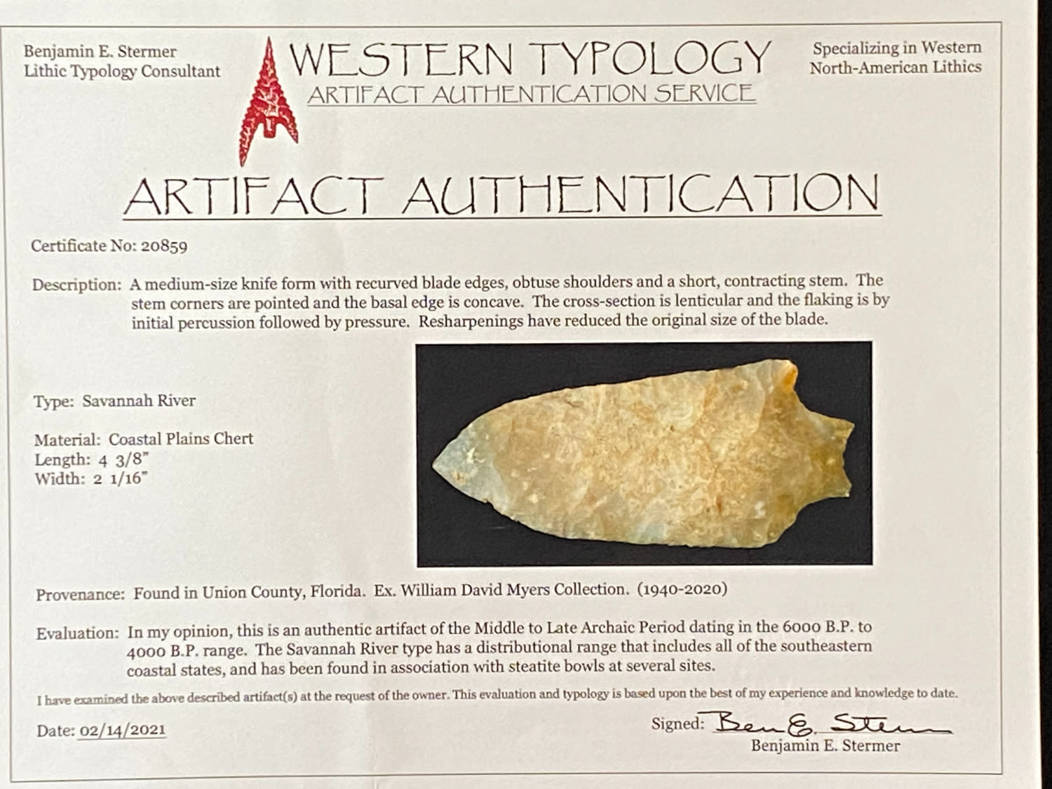 4 3/8″ Savannah River from Union Co, Florida, Ex William Myers, Stermer COA