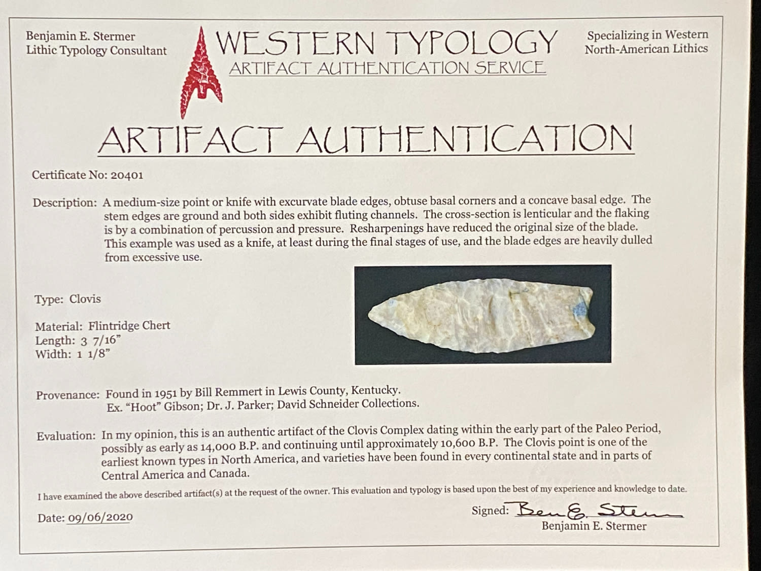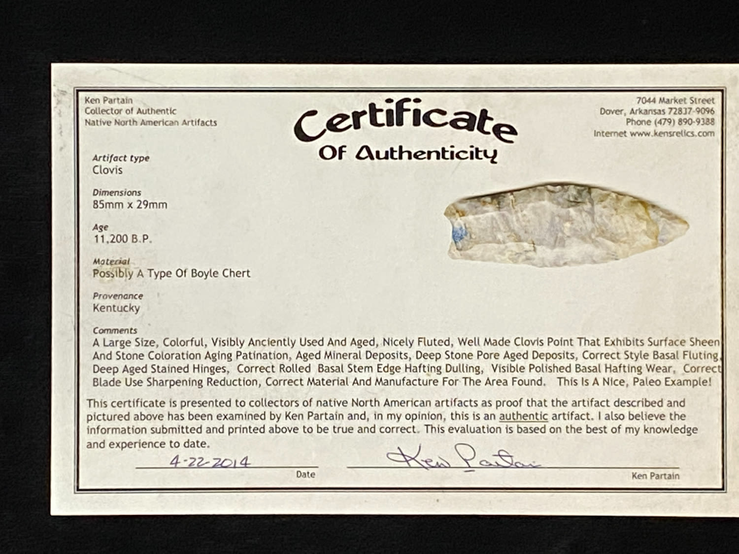 3 7/16" Fluted Clovis - Flintridge- Found in 1951 By Bill Remmert- Lewis Co Kentucky- Stermer and Partain COA - Ex Bart Roraff