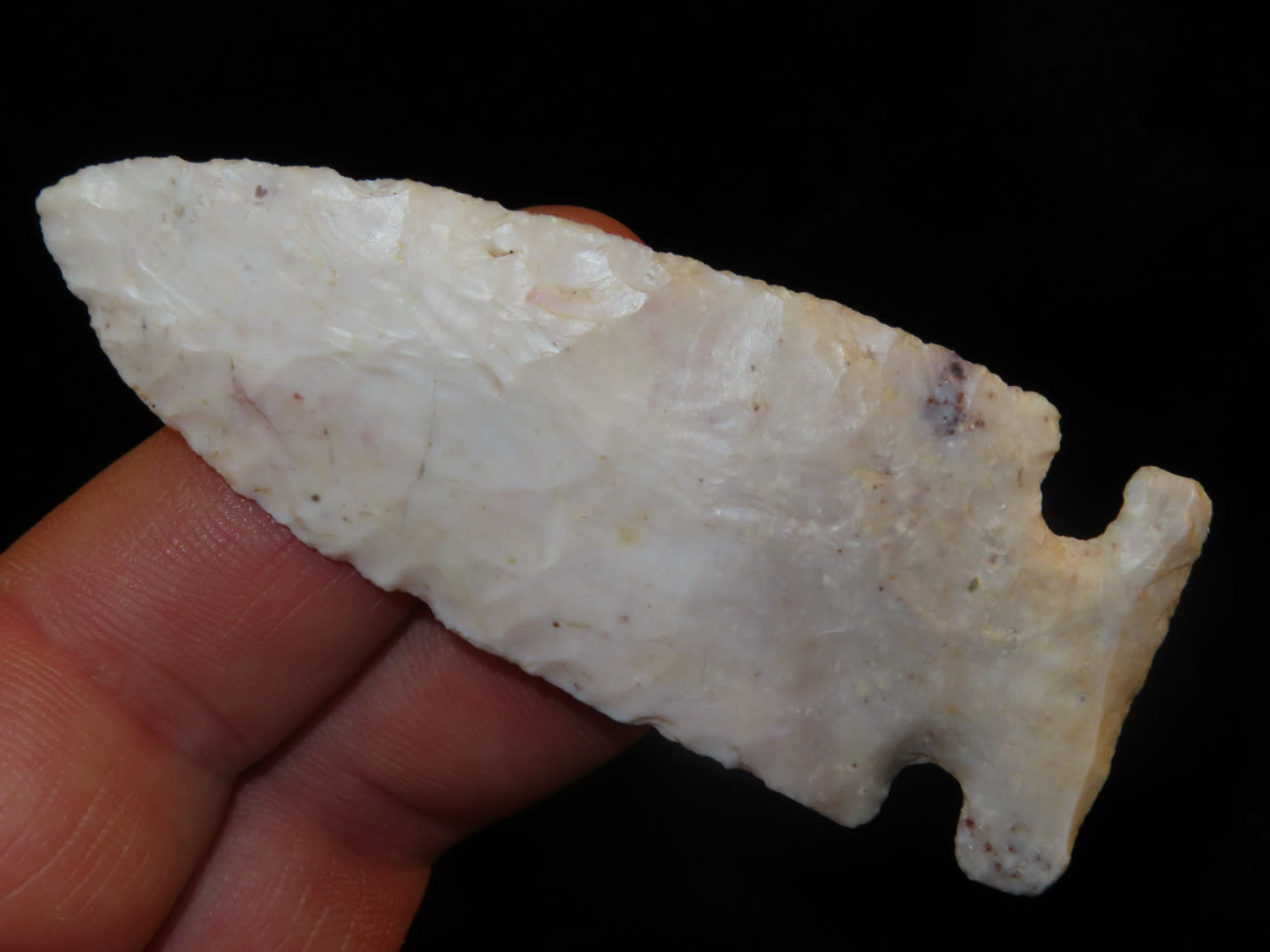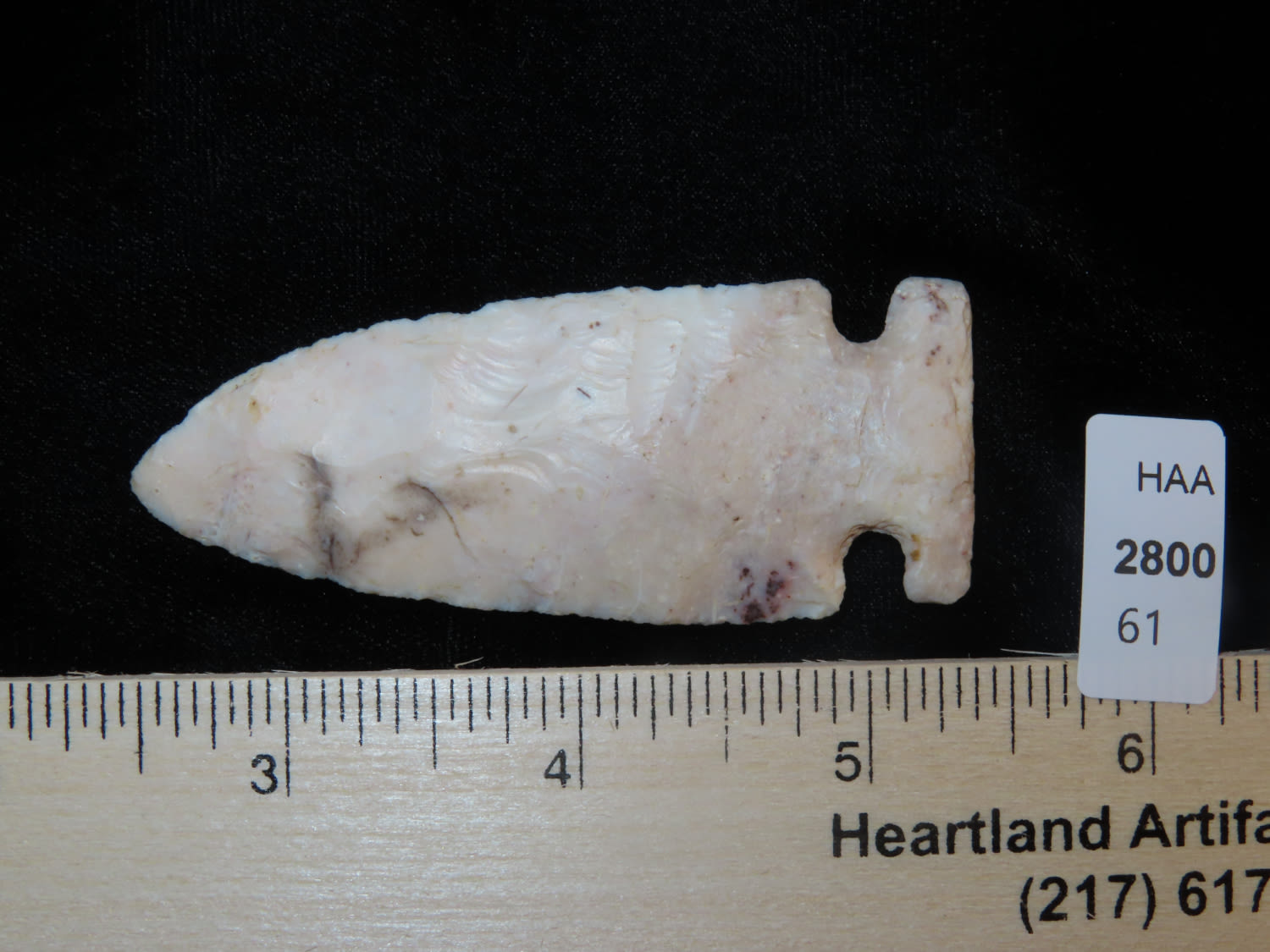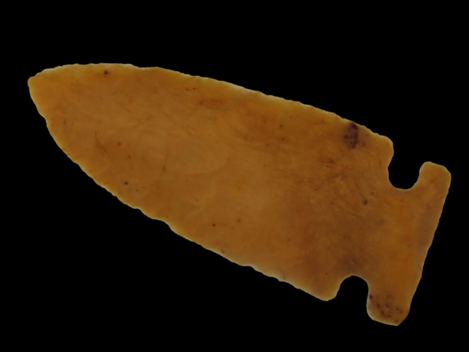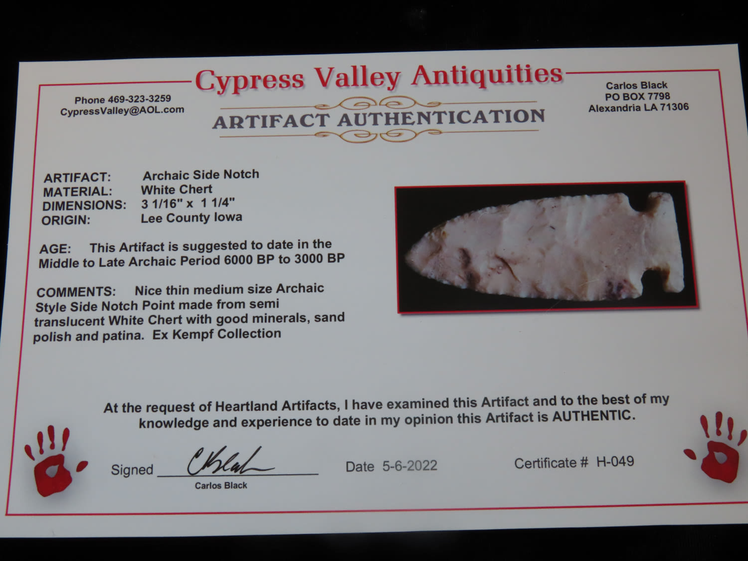 3 1/16″ Archaic Side Notch, Black COA, made of semi translucent chert, found in Lee County Iowa, Ex Ralph Kempf Collection