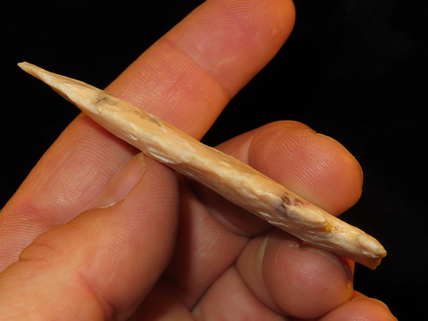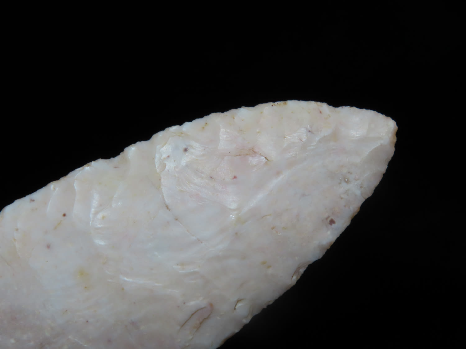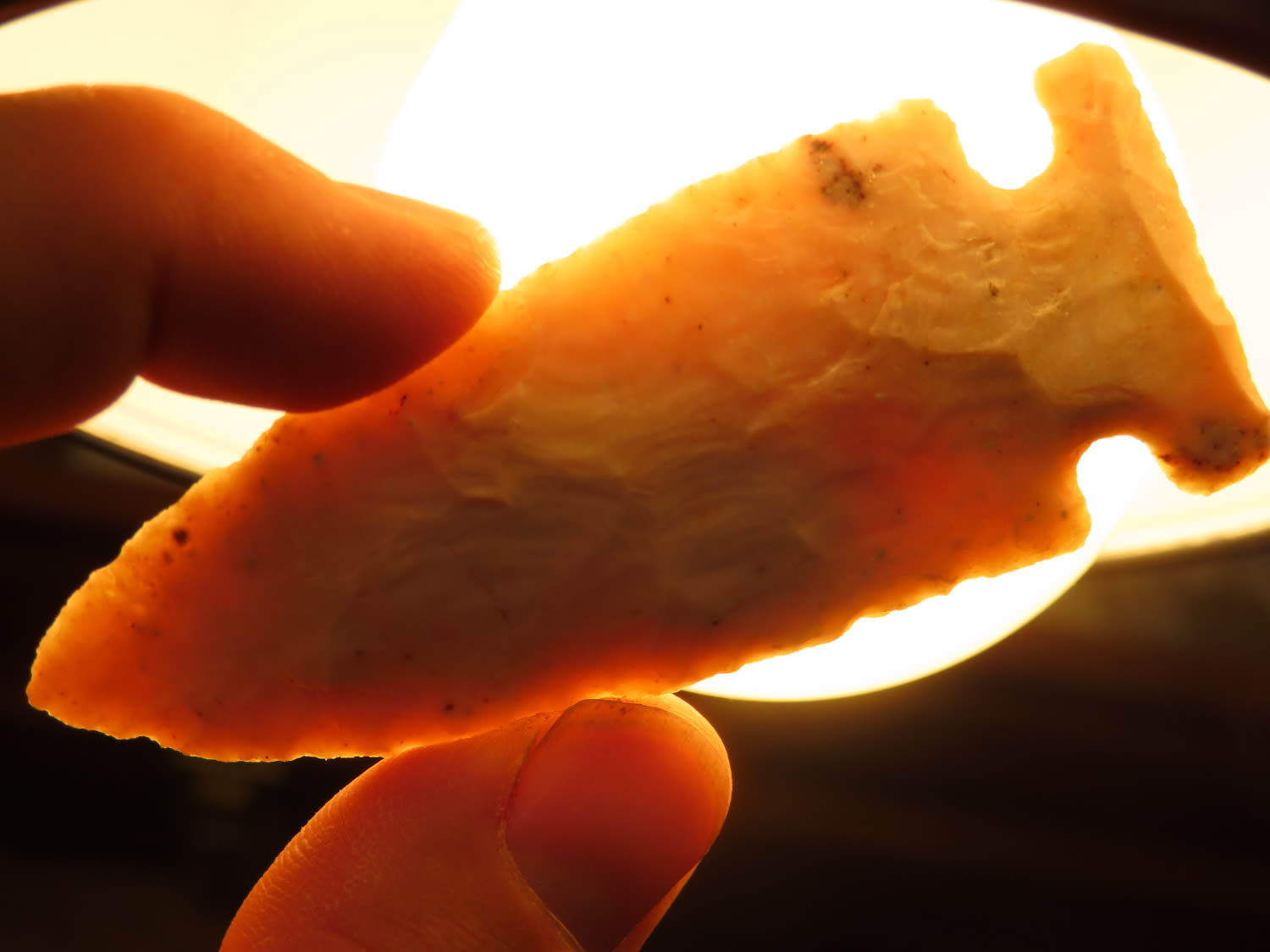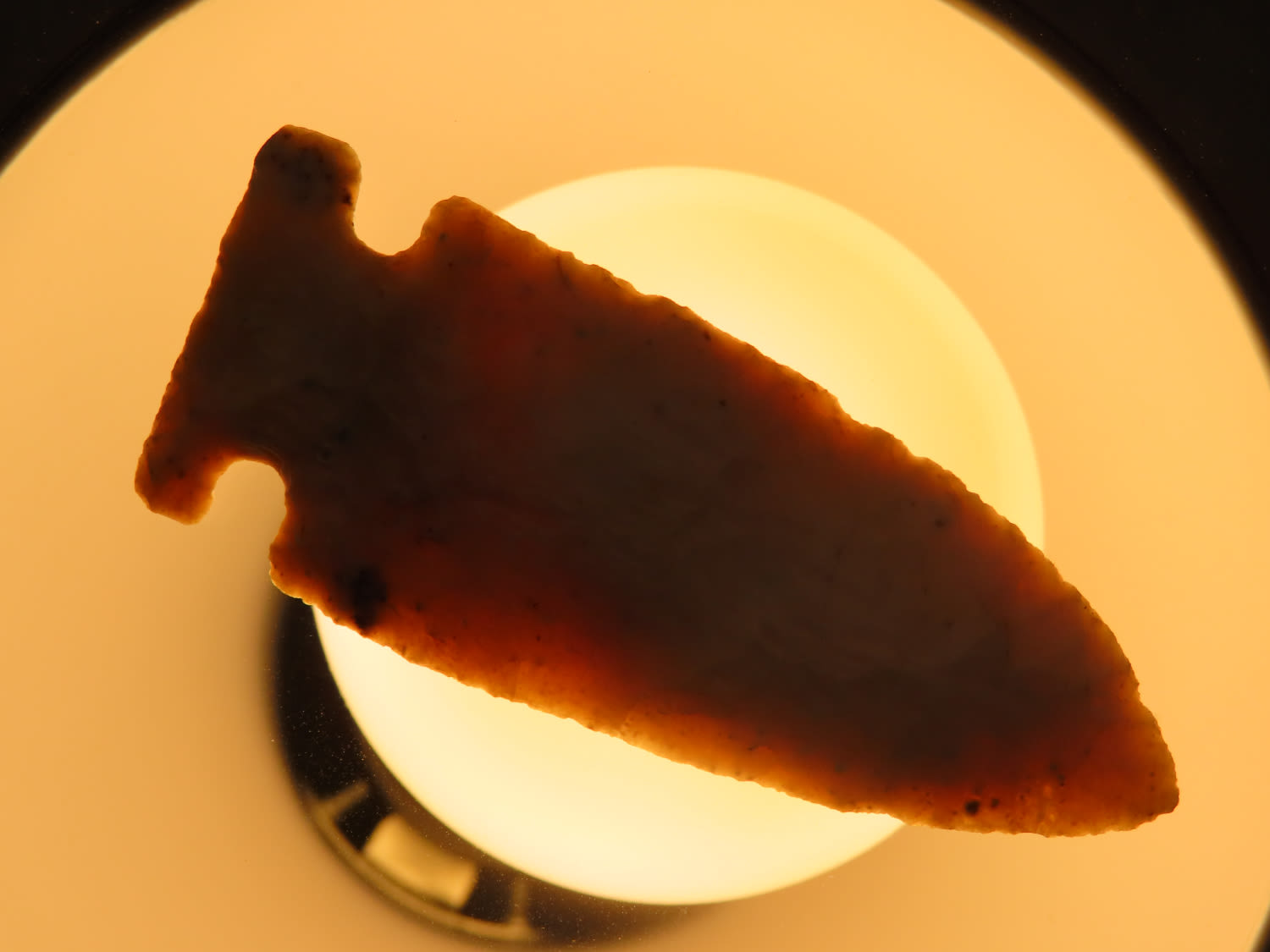 3 1/16″ Archaic Side Notch, Black COA, made of semi translucent chert, found in Lee County Iowa, Ex Ralph Kempf Collection