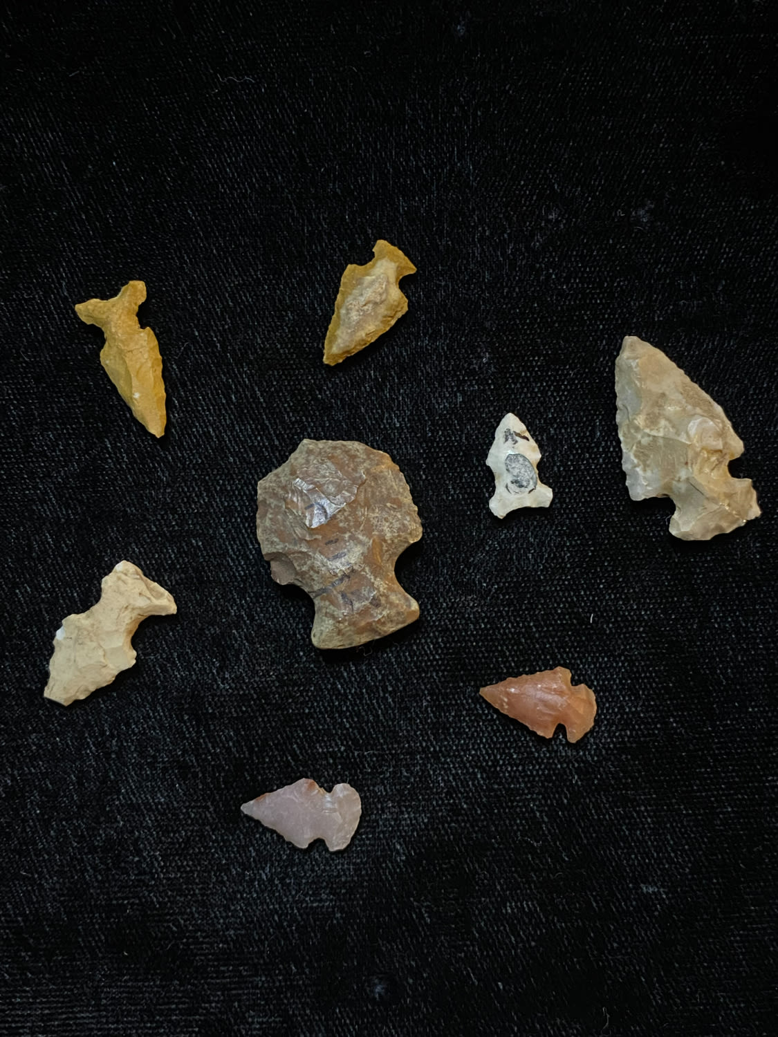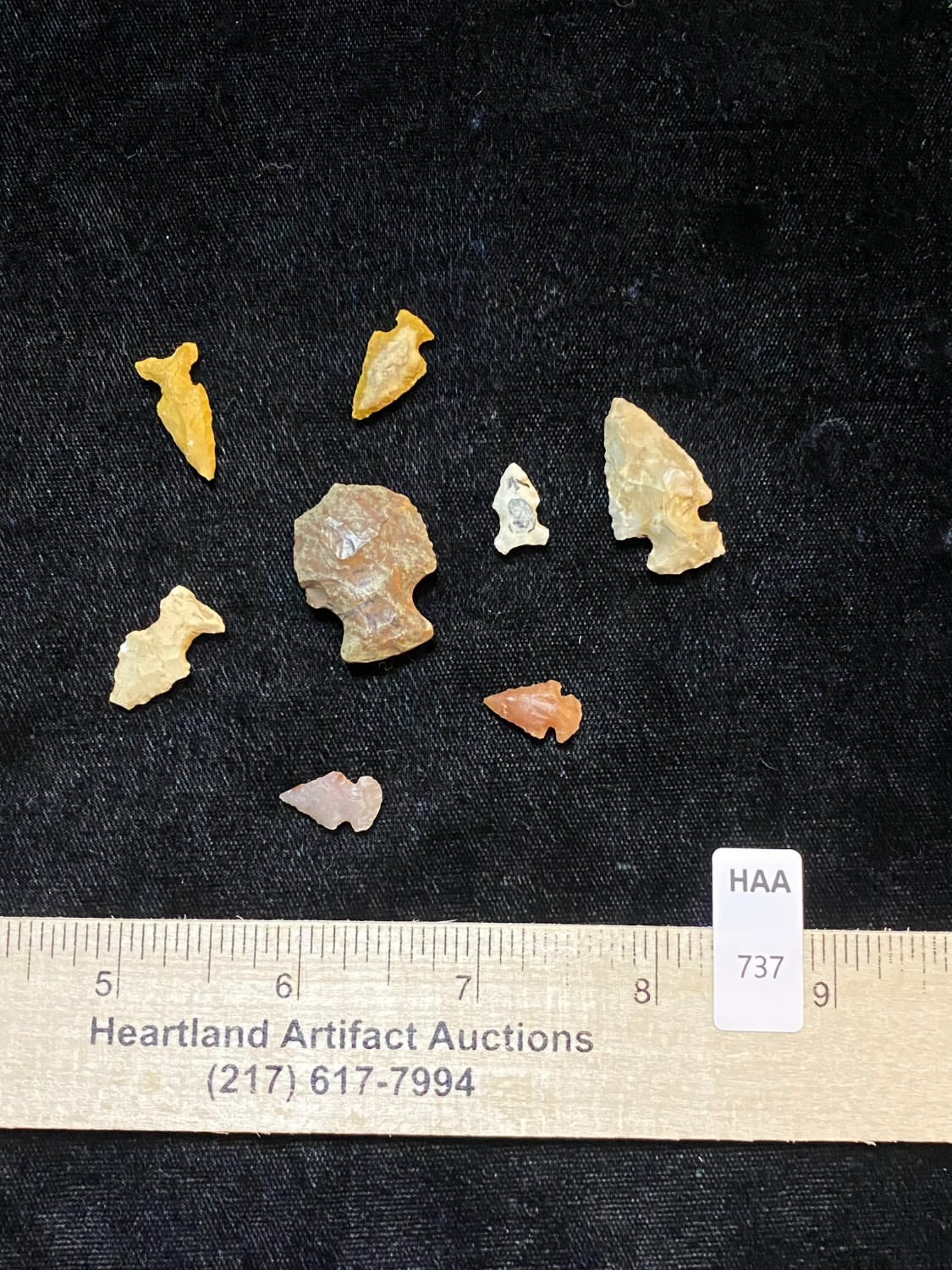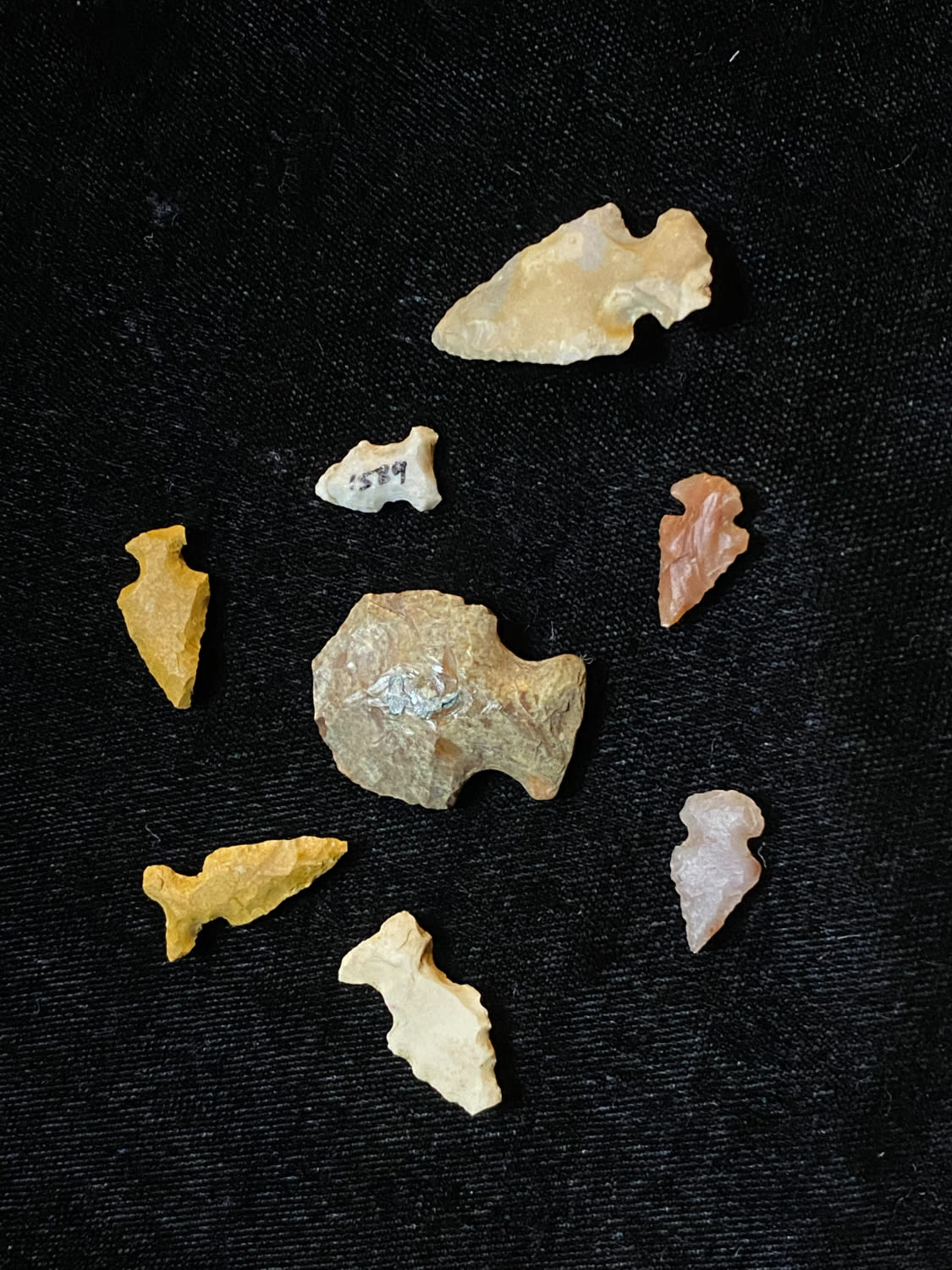 Grouping of Bird Points and small Scraper- Ex. Gerald Waters Collection Payson Illinois, in storage since 1980’s