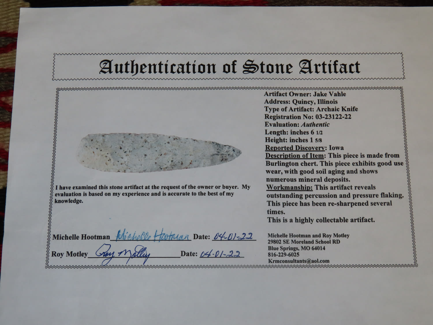 6 1/2″ Archaic Knife, Motley COA, made of Burlington Chert