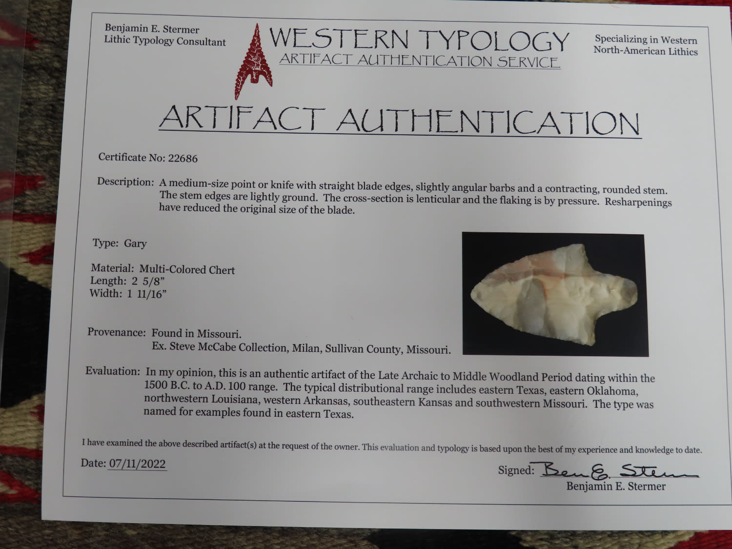 2 5/8″ Gary Stermer COA, made of Creek Stained Burlington Chert found in Sullivan County Missouri, ex Steve McCabe