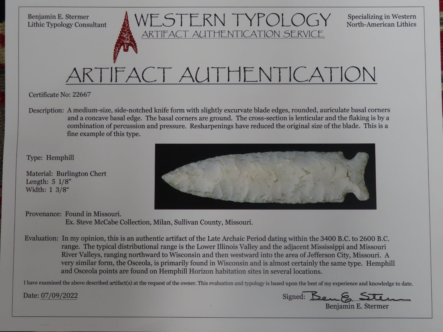 5 1/8″ Hemphill Stermer COA, made of Creek Stained Burlington Chert found in Sullivan County Missouri, ex Steve McCabe