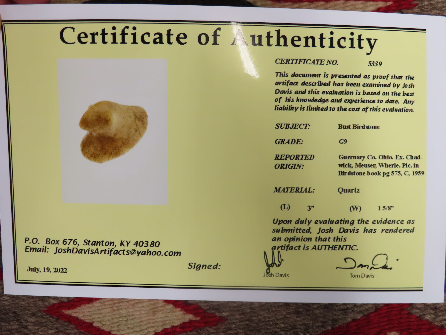 3″ Quartz Bust Birdstone, Pictured in Birdstones of the Native American Indian by Earl Townsend, Page 575, Found in Guernsey County Ohio, Ex Chadwick, Meuser, Wherle, Graded G9, Josh Davis COA