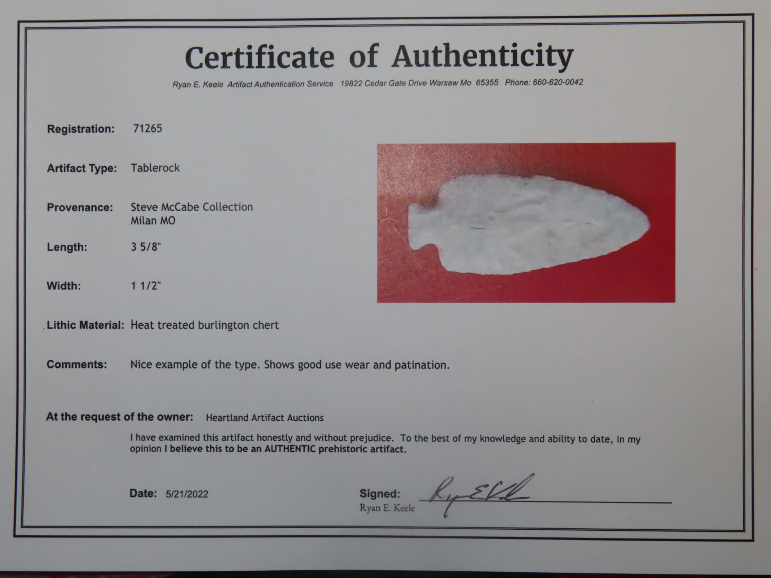 3 5/8″ High Quality Tablerock, Keele COA, made of Creek Stained Burlington Chert found in Sullivan County Missouri, ex Steve McCabe