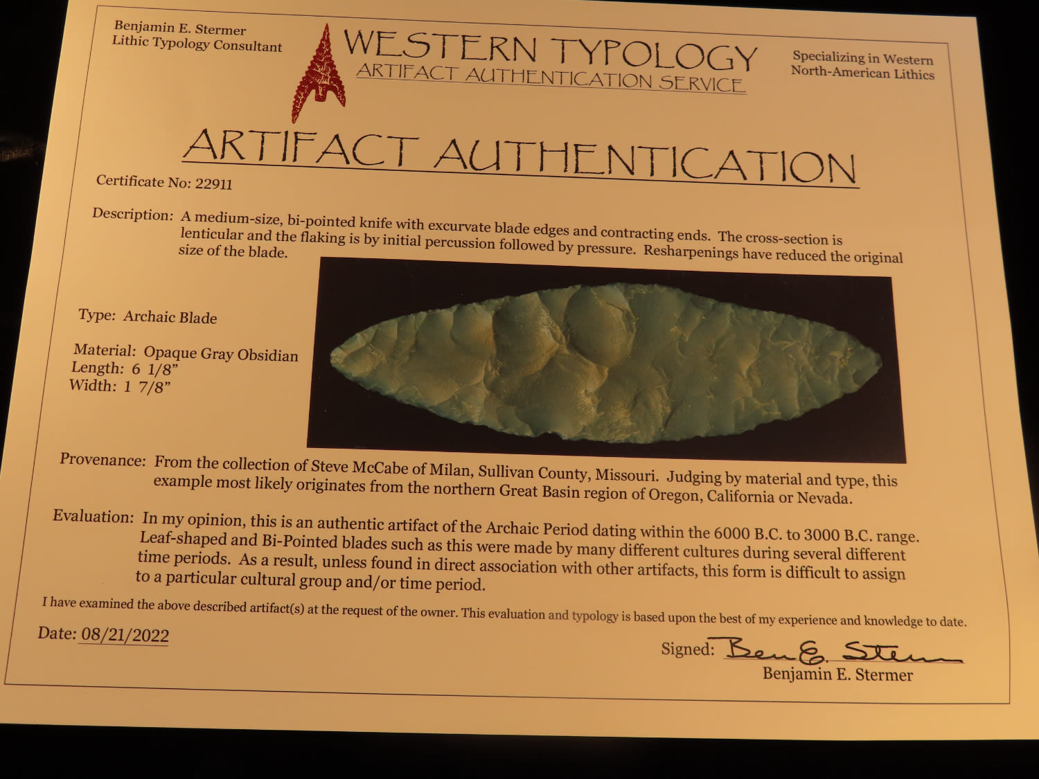 6 1/8″ Obsidian Archaic Blade, Stermer COA, West Coast