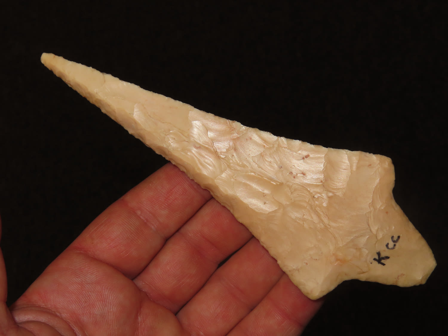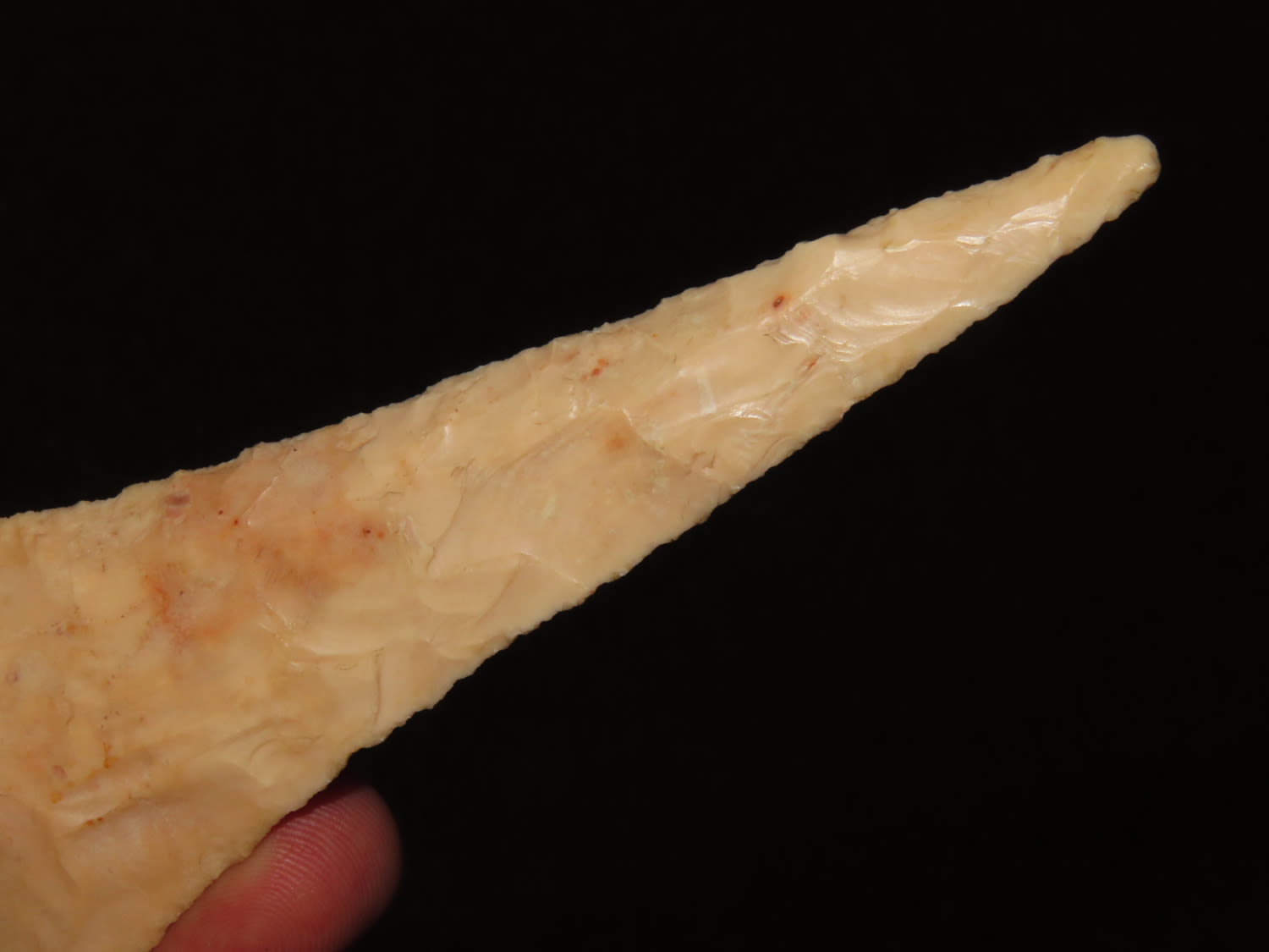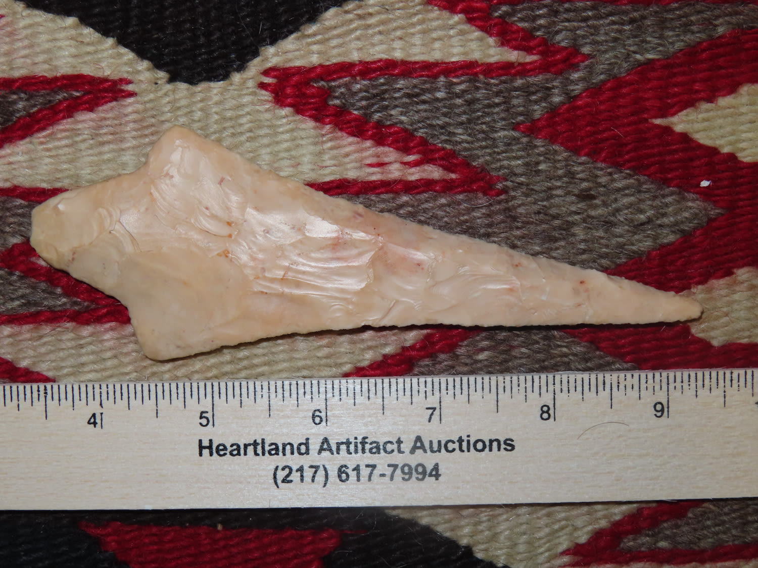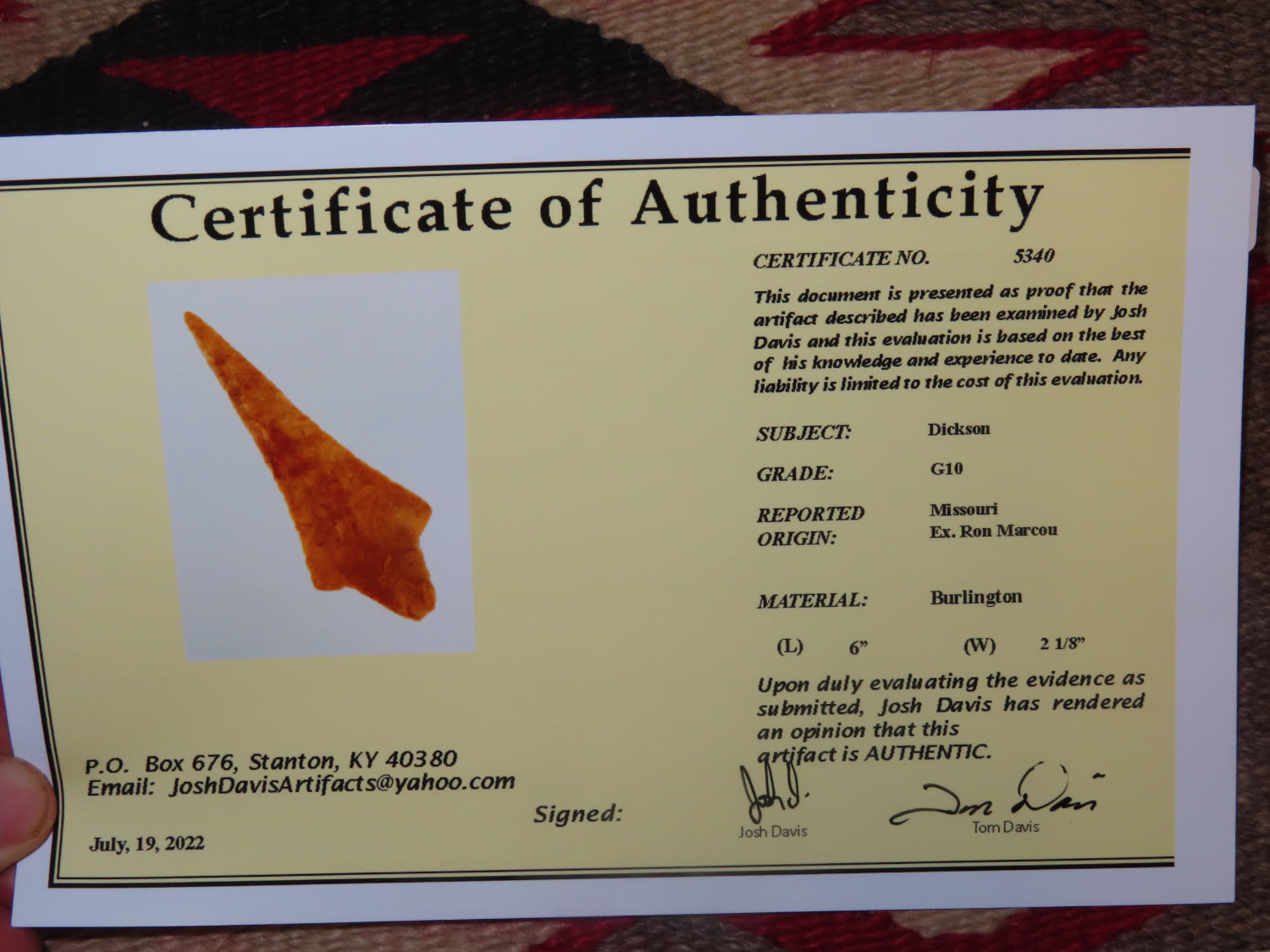 6″ Dickson, Recovered in Missouri, Josh Davis G10 COA, Ex Ron Marcou, Colorful Heat Treated Burlington. Nicely beveled and decently flared ears giving it a unique bit of style.
