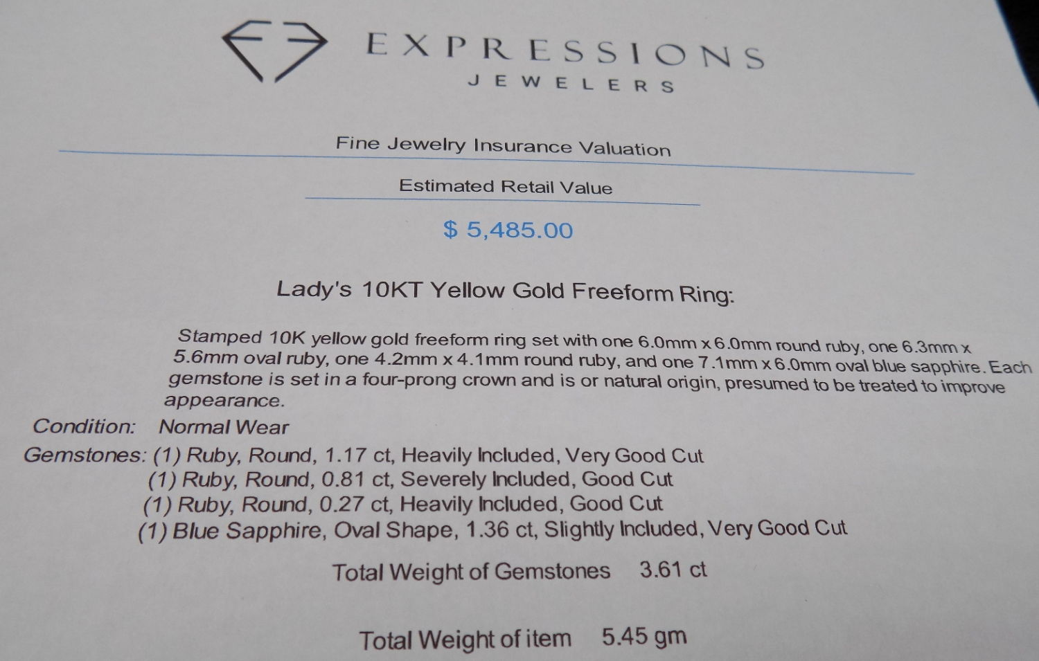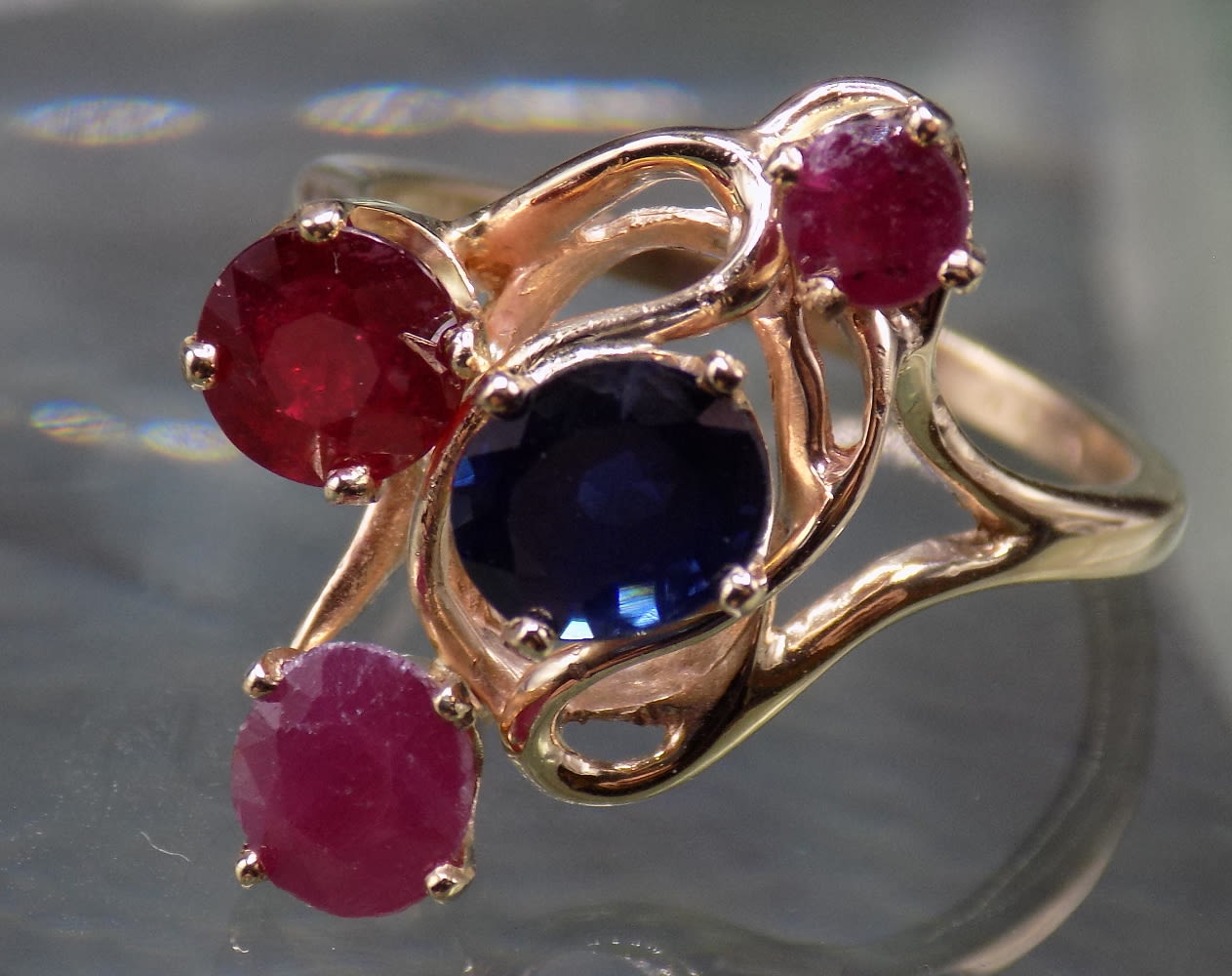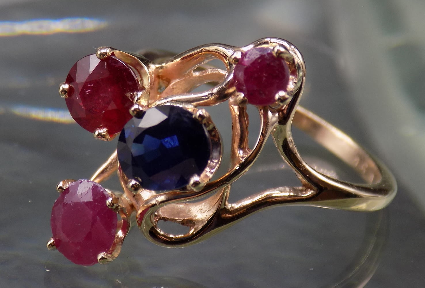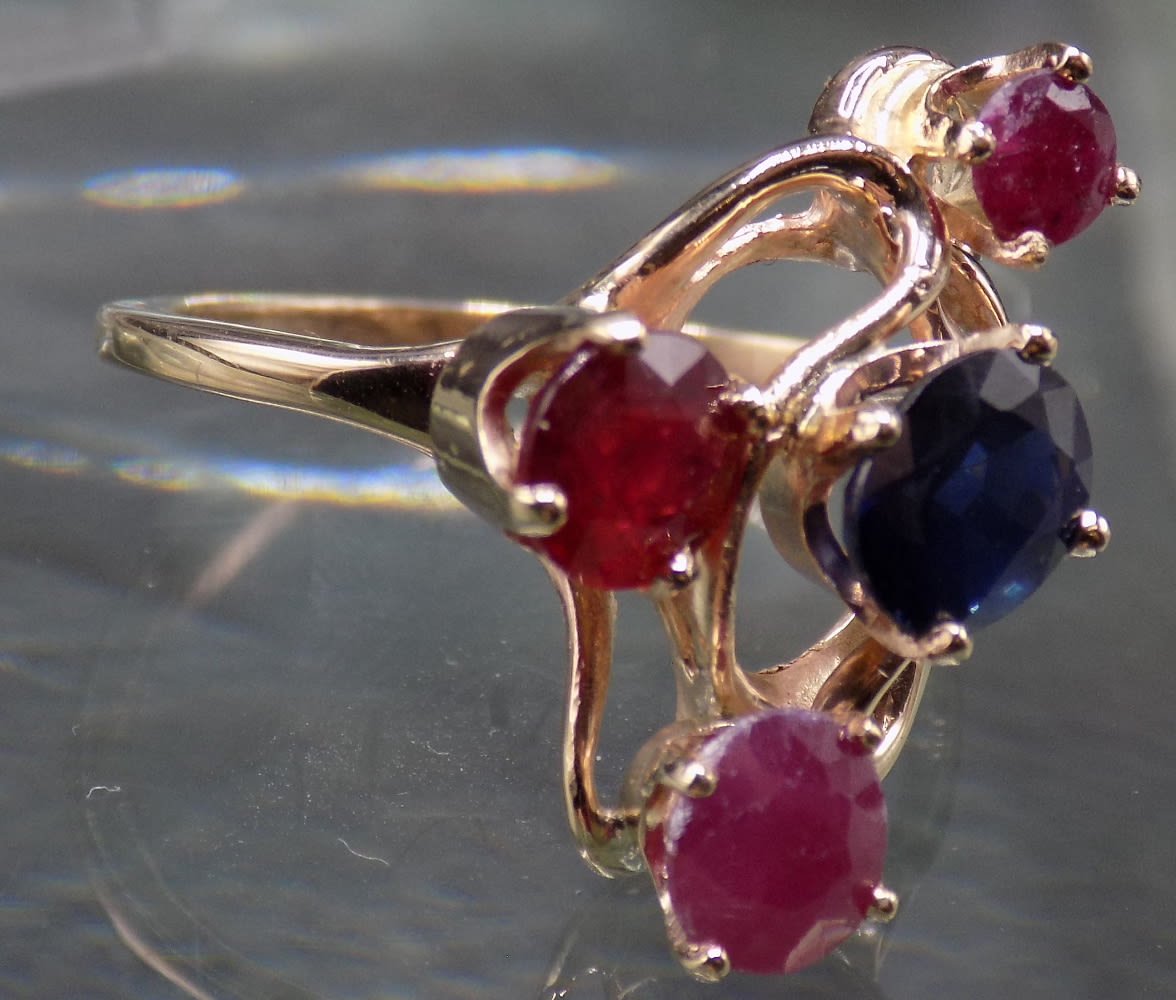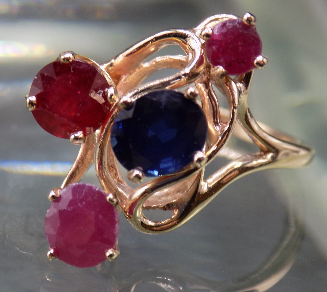 A super unique, absolute one of a kind ring, set with 3 Rubies, and a perfect, deep blue oval Sapphire! Due to the appearance of the rubies, they are possibly extremely vintage, most likely salvaged from an heirloom piece, and this stunning ring was created to showcase them along with the stunning Sapphire.