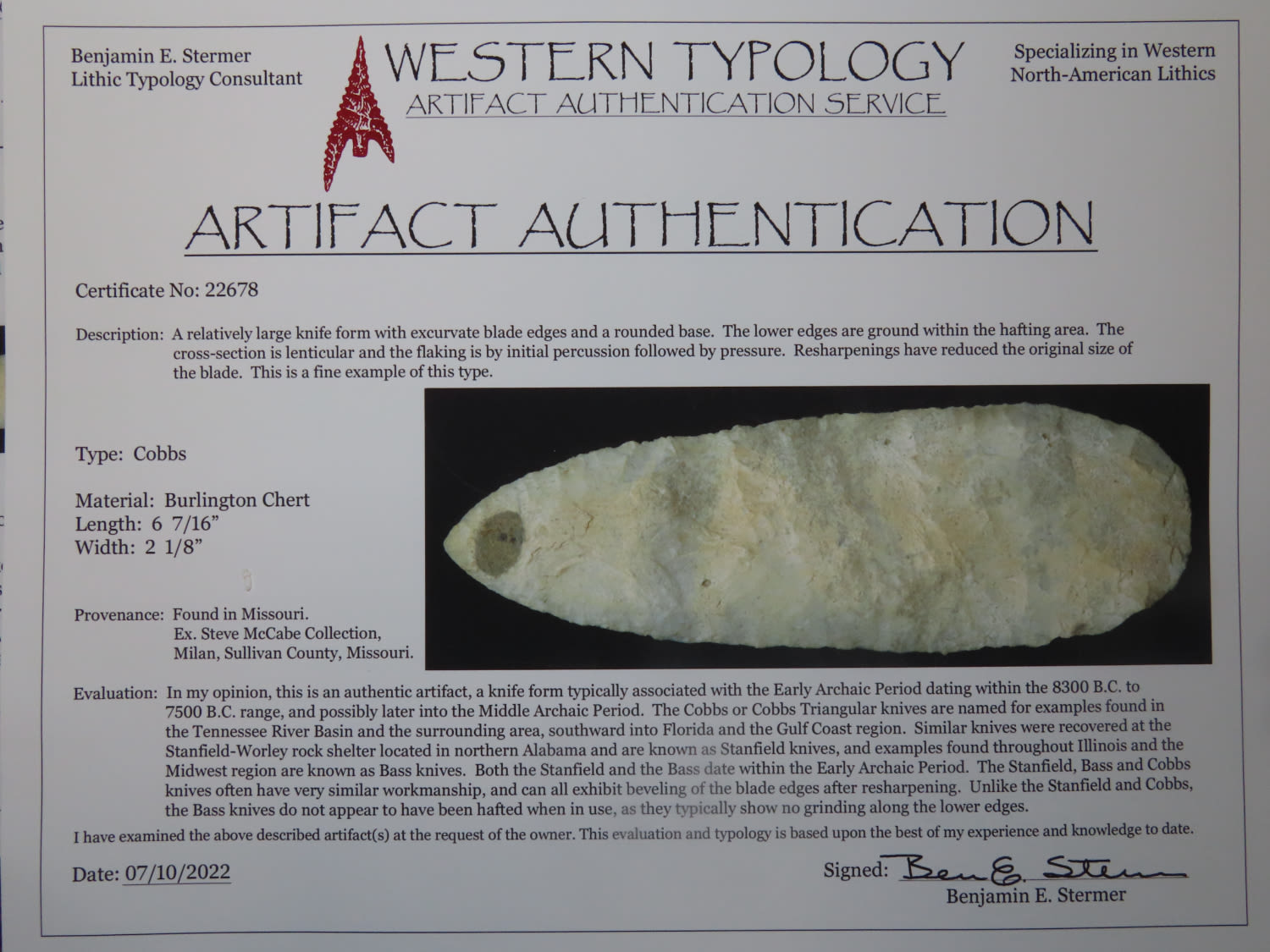 6 7/16″ Cobbs Blade, Stermer COA, Ex. Steve McCabe Collection, Milan, Sullivan County Missouri. Mr. McCabe collected from 1984 until 2022.