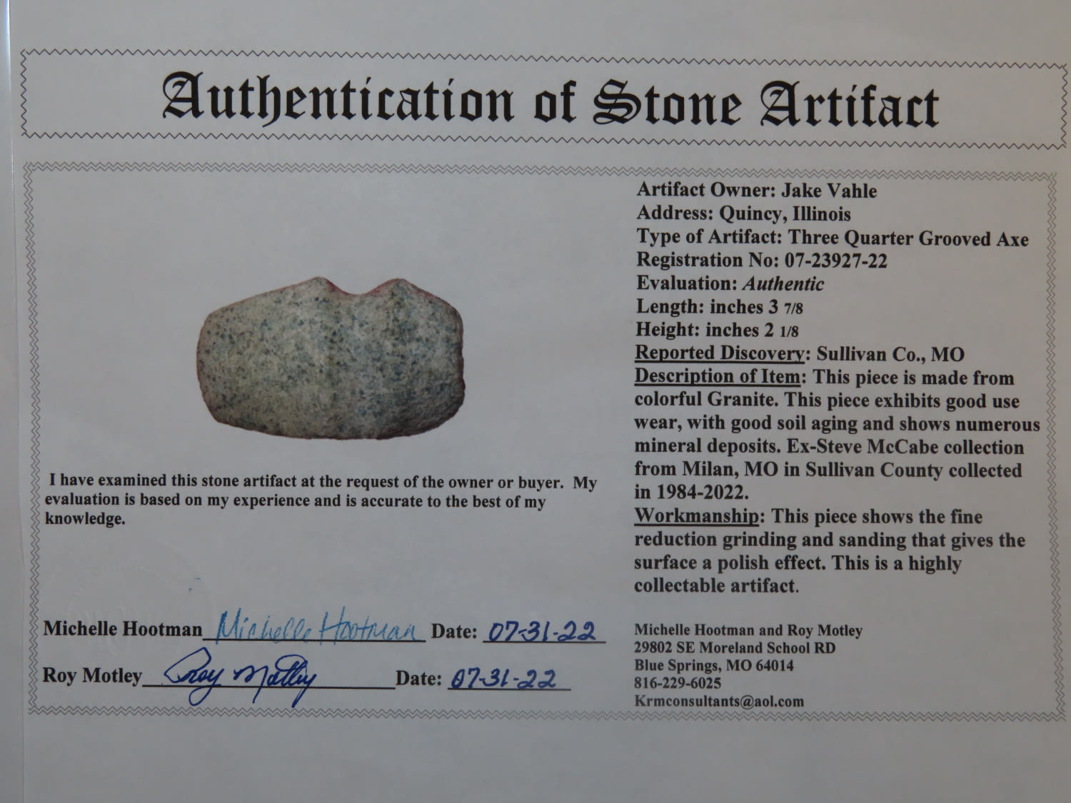 3 7/8″ 3/4 Groove Axe, Motley COA, Ex. Steve McCabe Collection, Milan, Sullivan County Missouri. Mr. McCabe collected from 1984 until 2022.