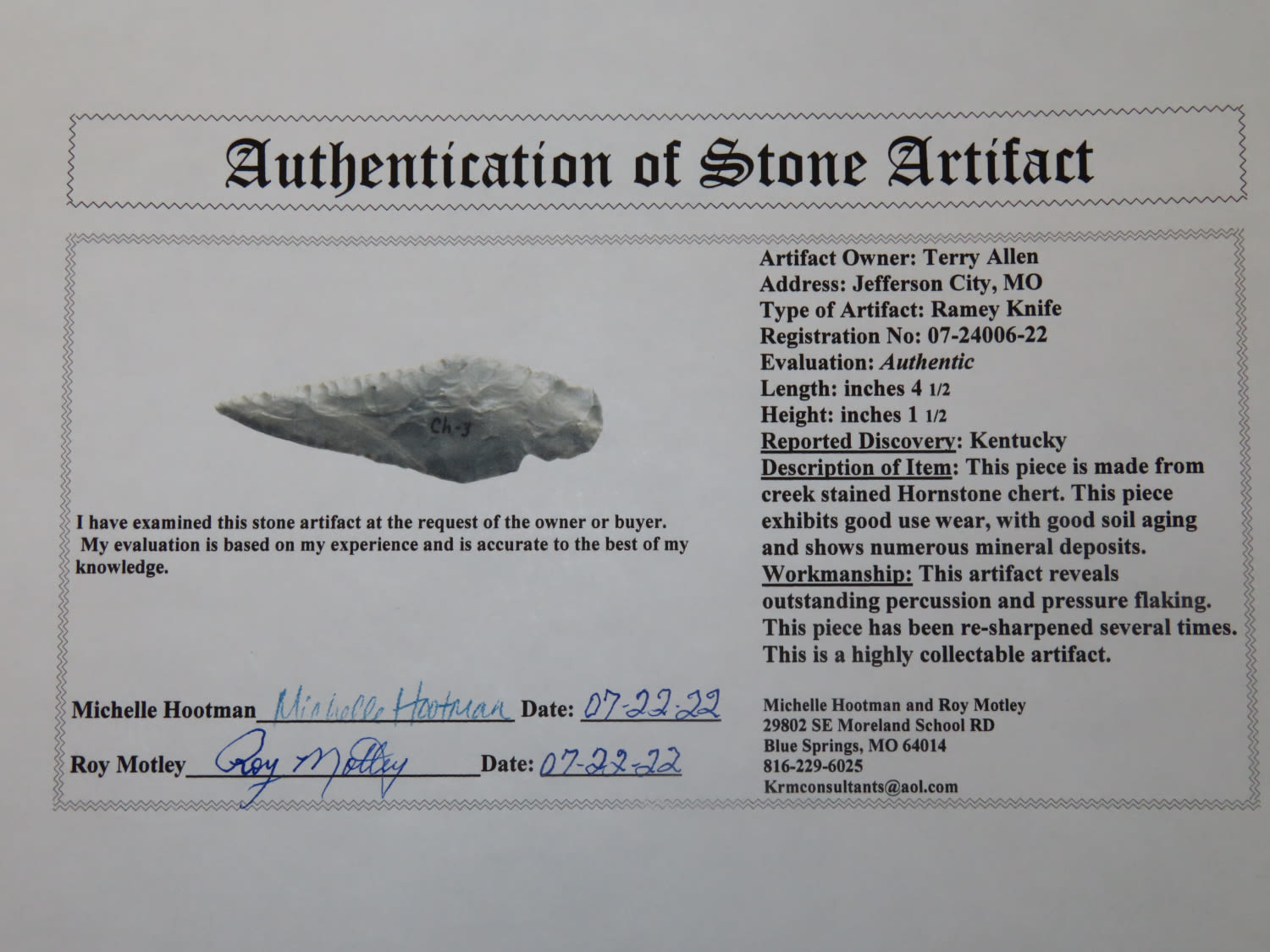 4 1/2″ Hornstone Ramey Knife, Motley COA, found in Kentucky