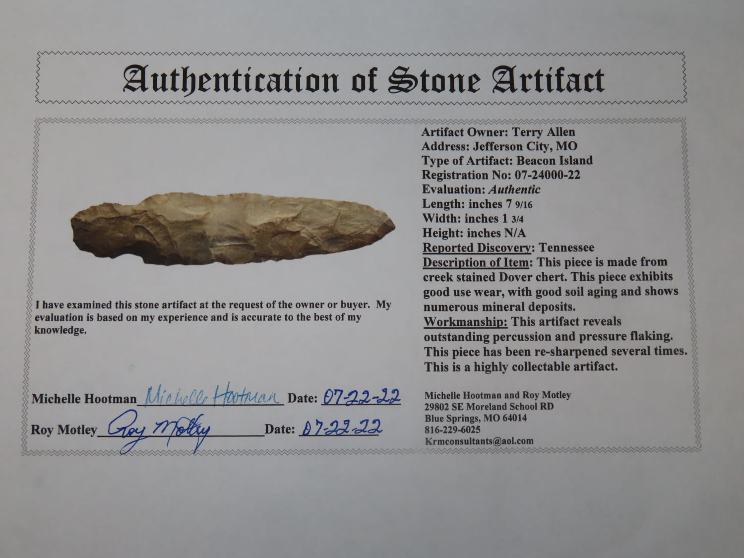 7 9/16″ Beacon Island, Motley COA, found in Tennessee
