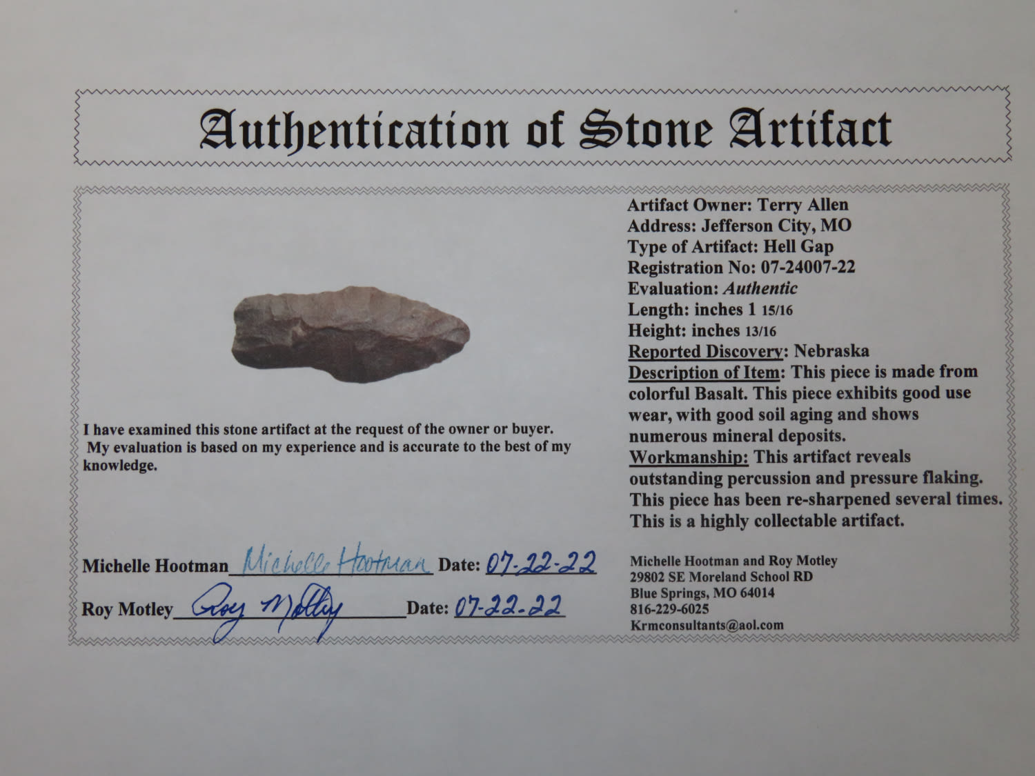 1 15/16″ Hell Gap, Motley COA, found in Nebraska