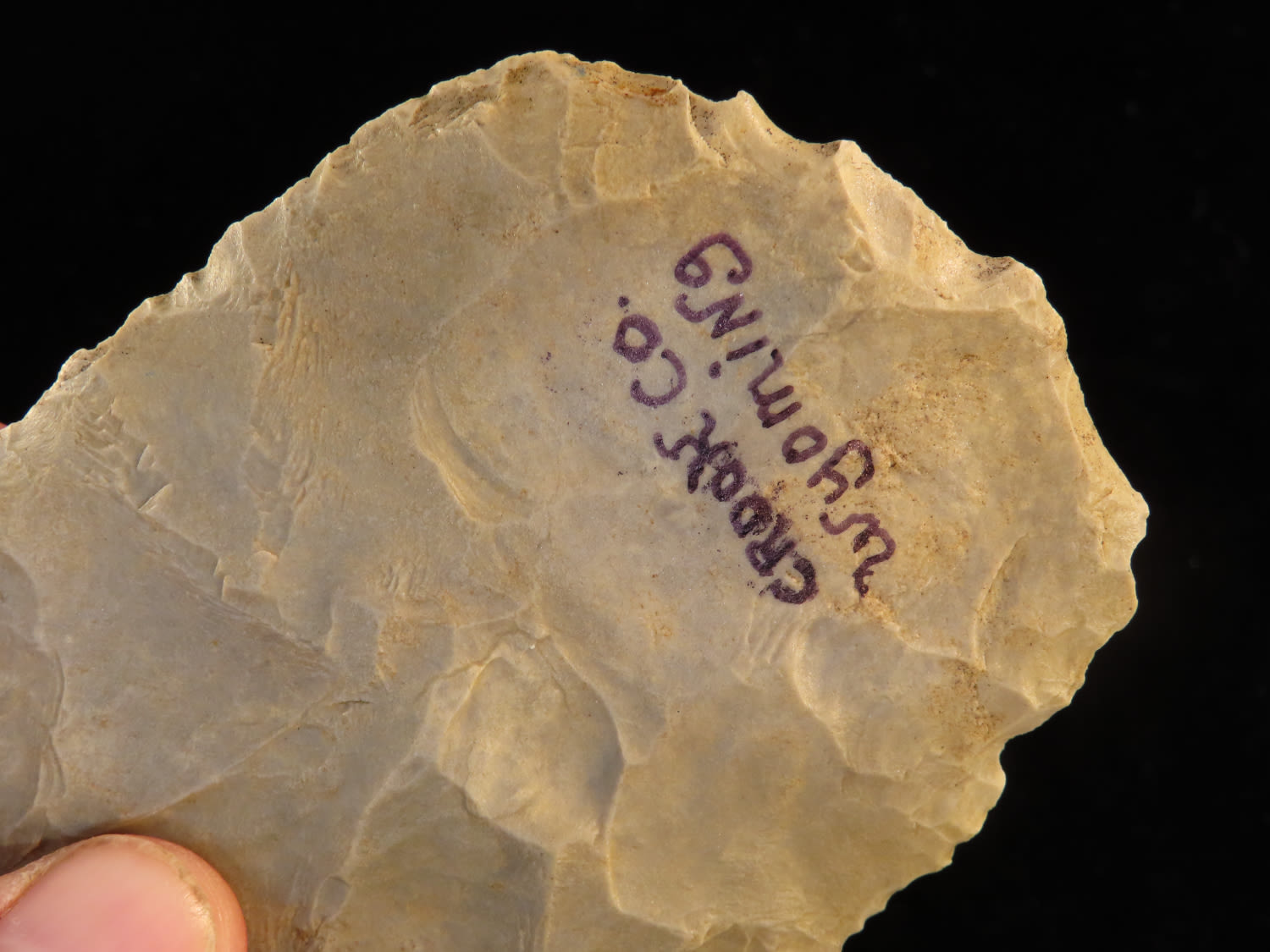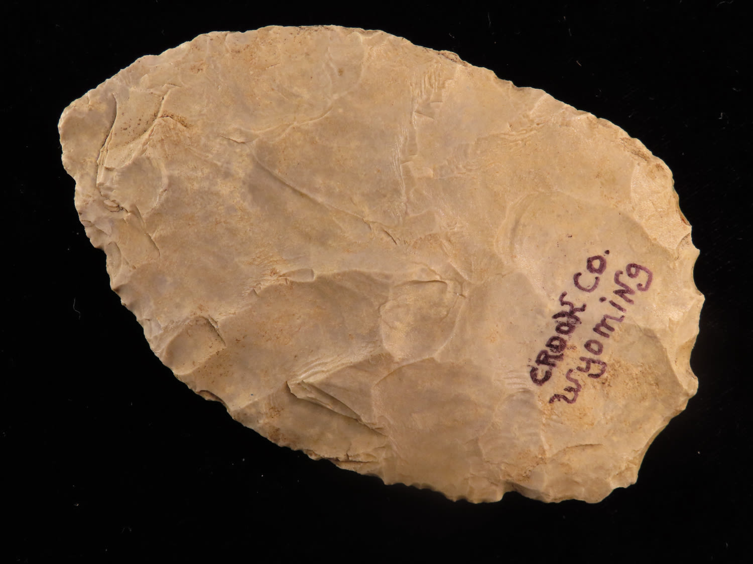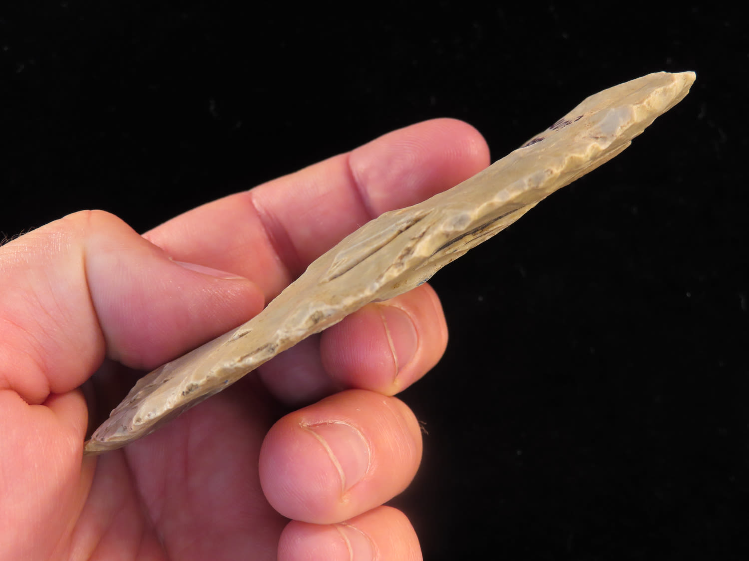 4 7/16″ Paleo Blade, Motley COA, discovered Crook Co, Wyoming-Nicely made, with large over shot flaking, excellent thickness to width ratio