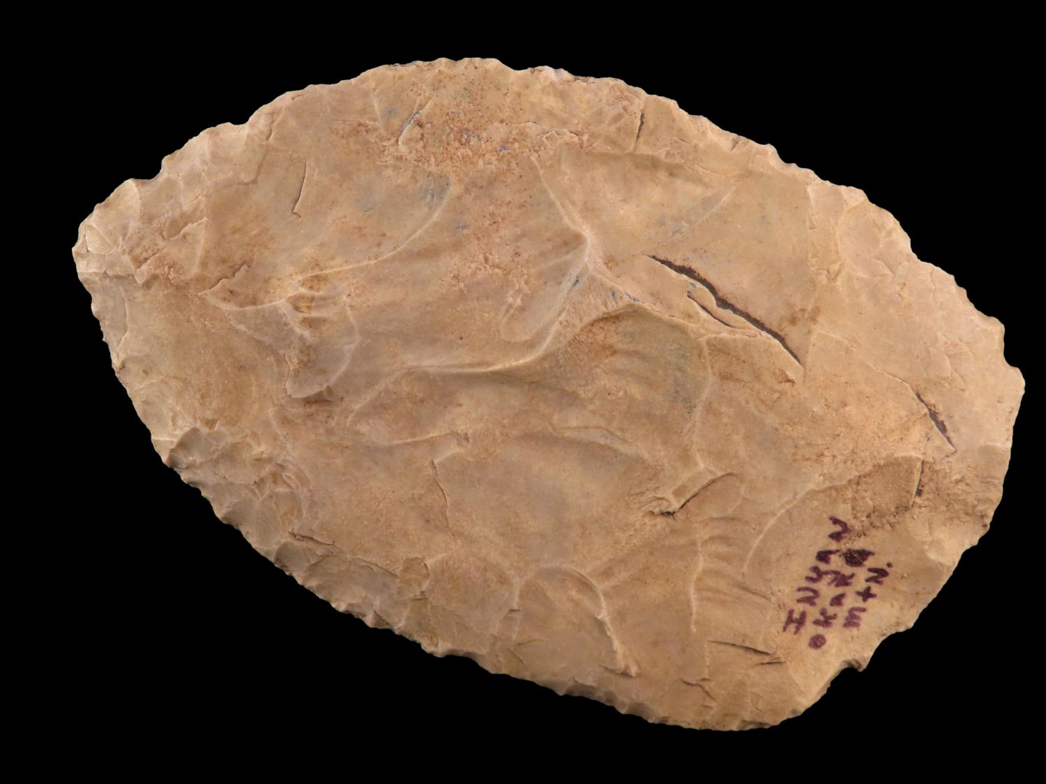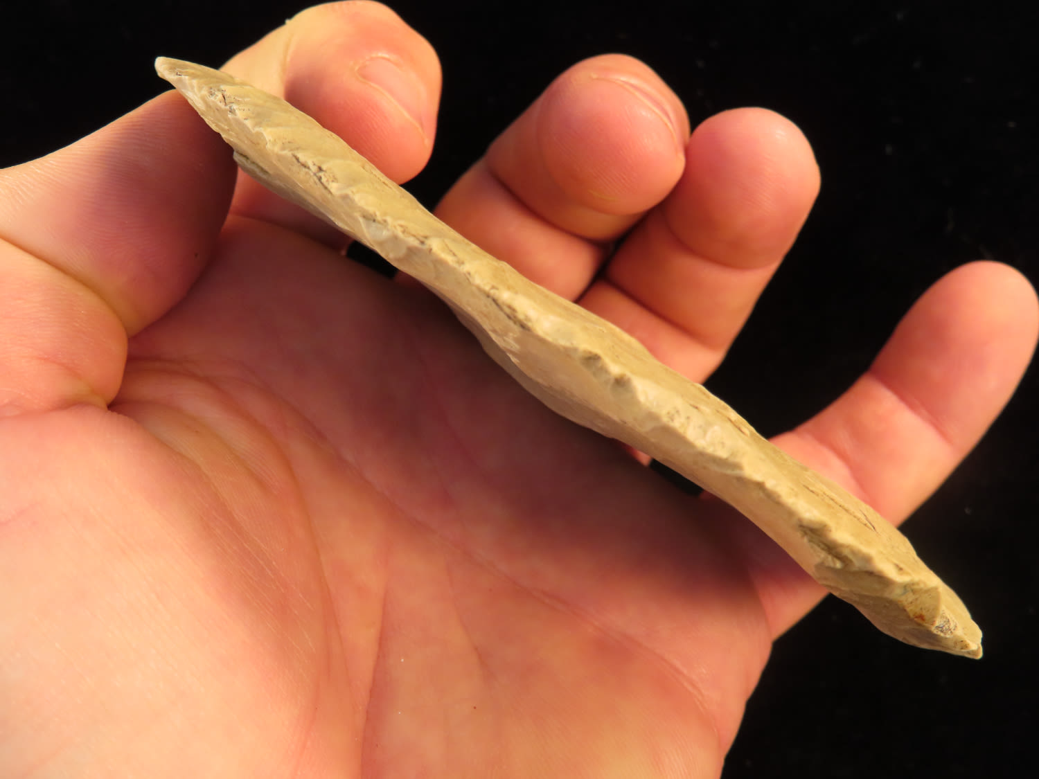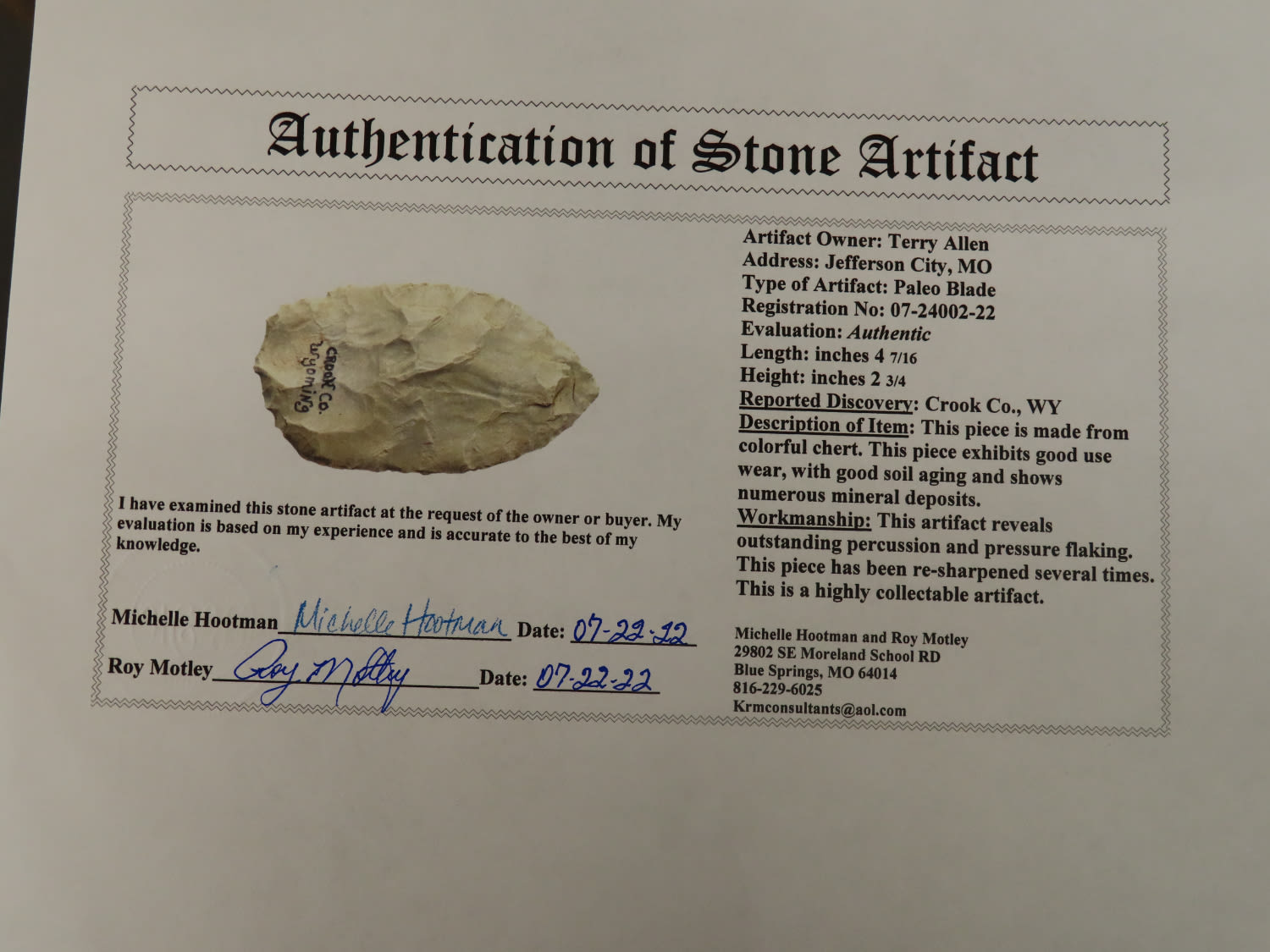 4 7/16″ Paleo Blade, Motley COA, discovered Crook Co, Wyoming-Nicely made, with large over shot flaking, excellent thickness to width ratio