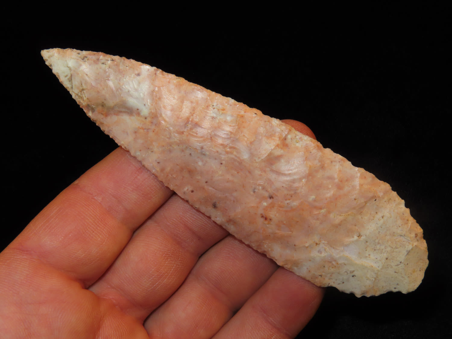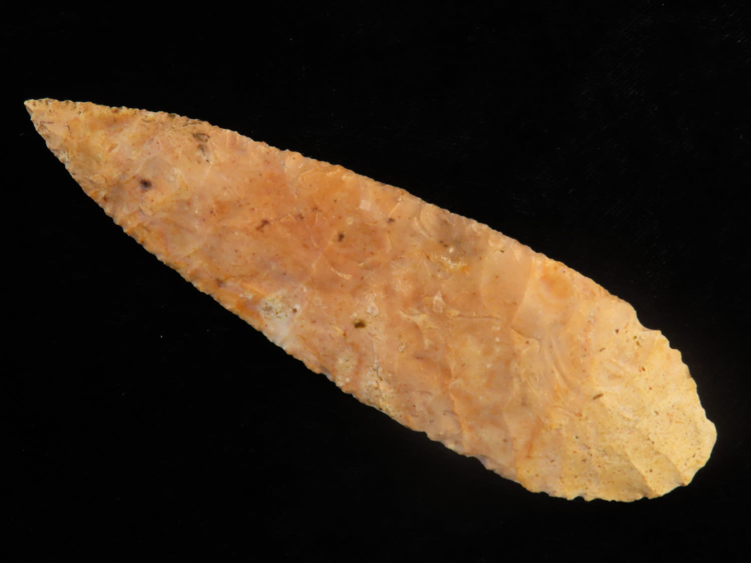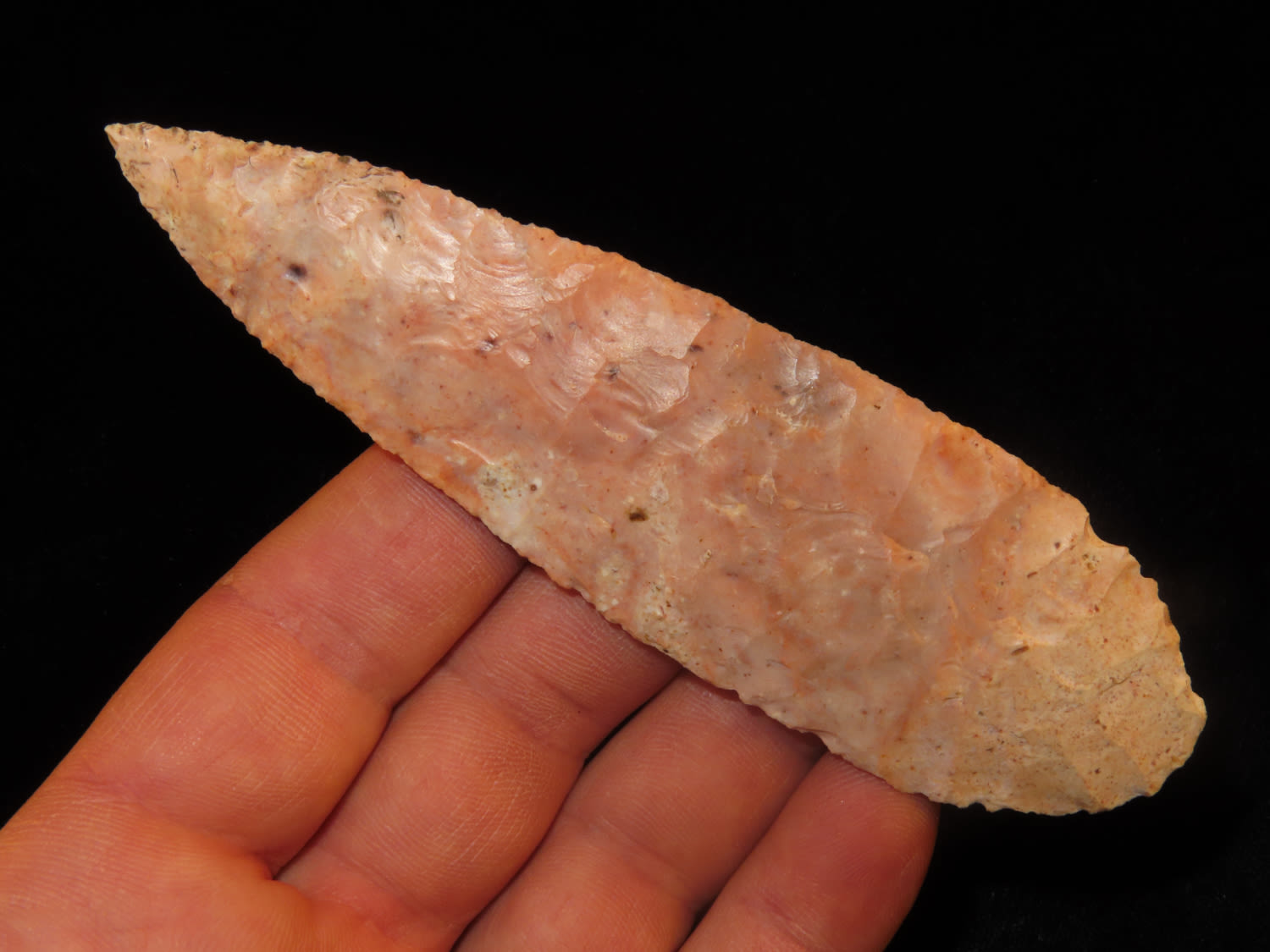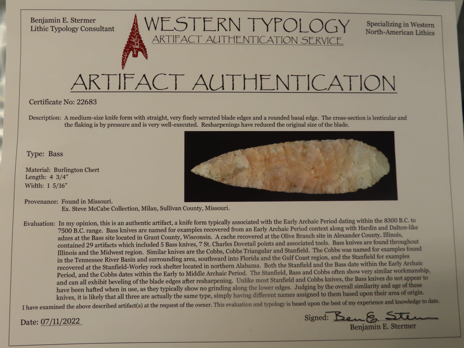 4 3/4″ Bass Blade, Stermer CO-Very thin and well flaked, Ex. Steve McCabe Collection, Milan, Sullivan County Missouri. Mr. McCabe collected from 1984 until 2022.