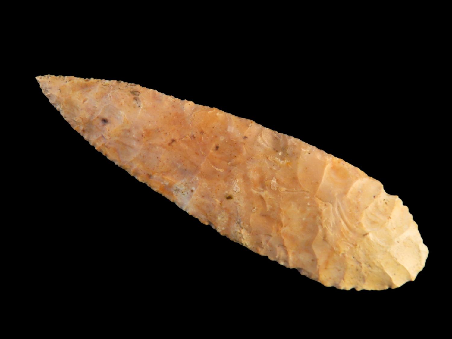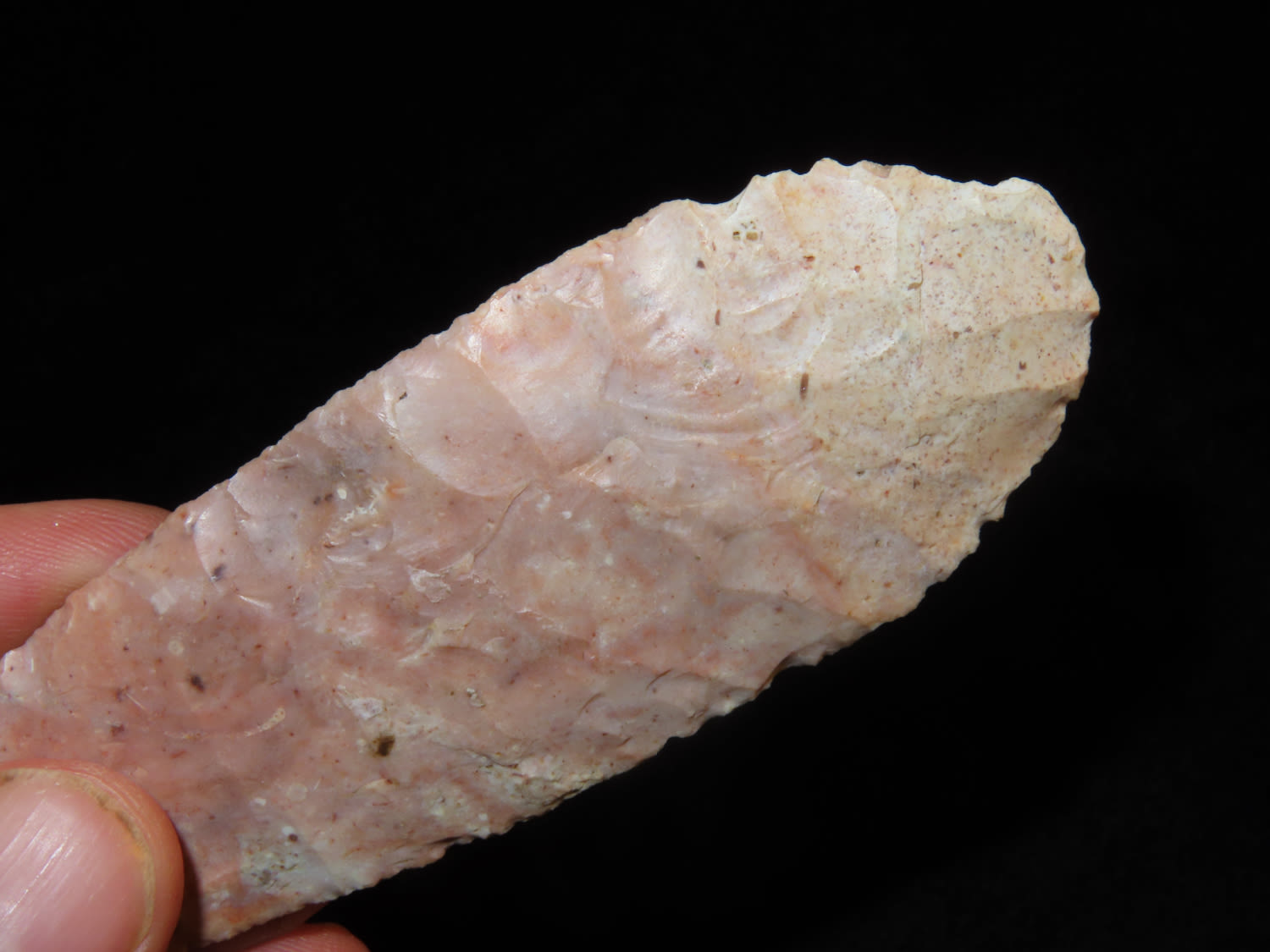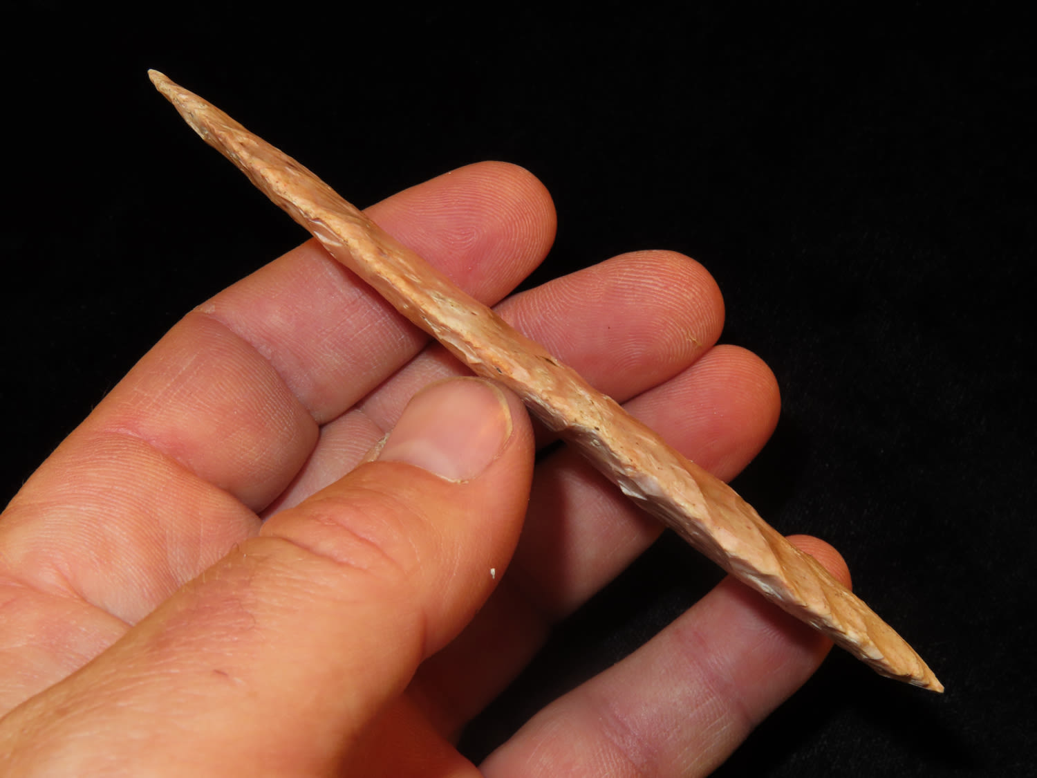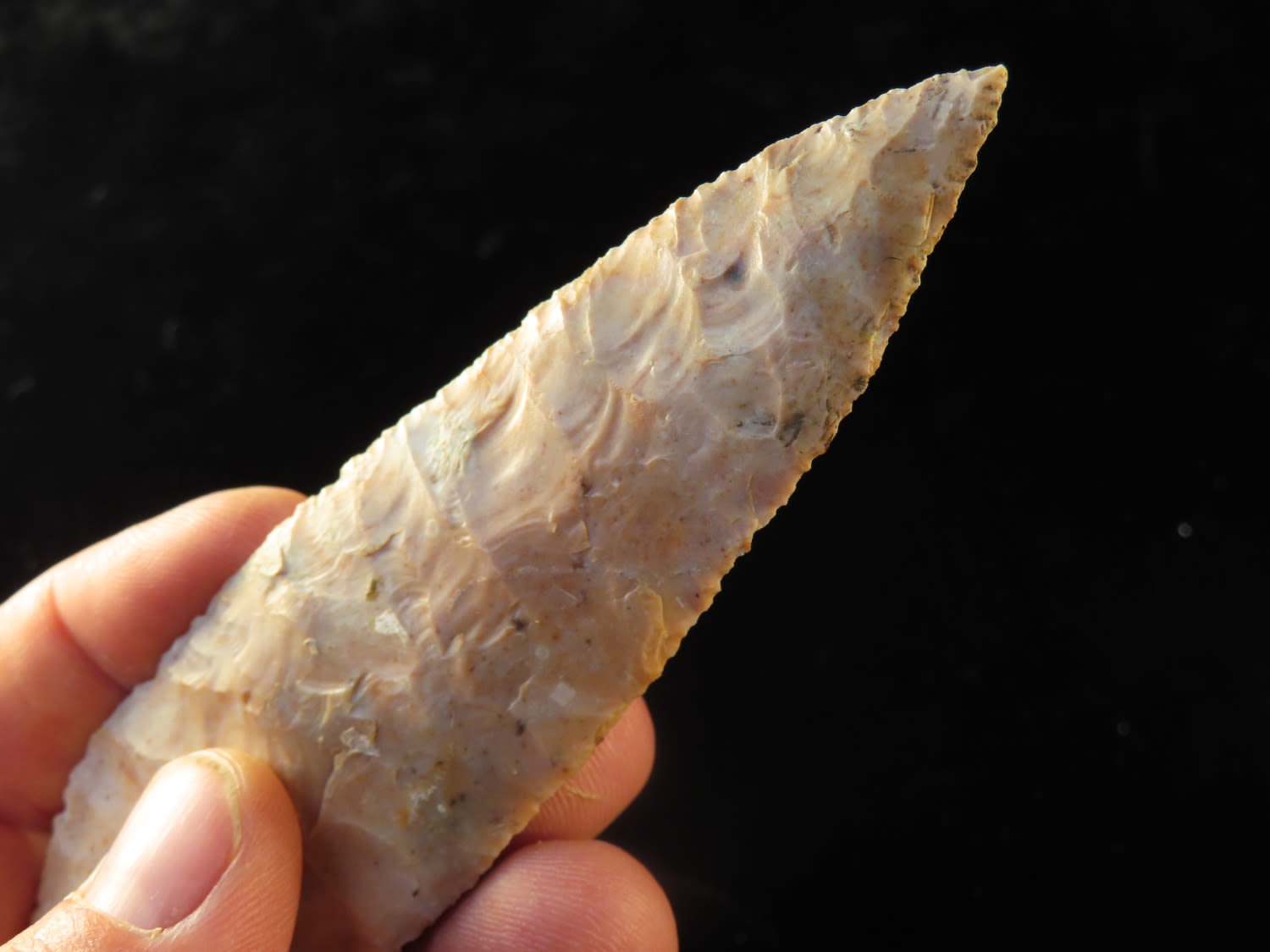 4 3/4″ Bass Blade, Stermer CO-Very thin and well flaked, Ex. Steve McCabe Collection, Milan, Sullivan County Missouri. Mr. McCabe collected from 1984 until 2022.