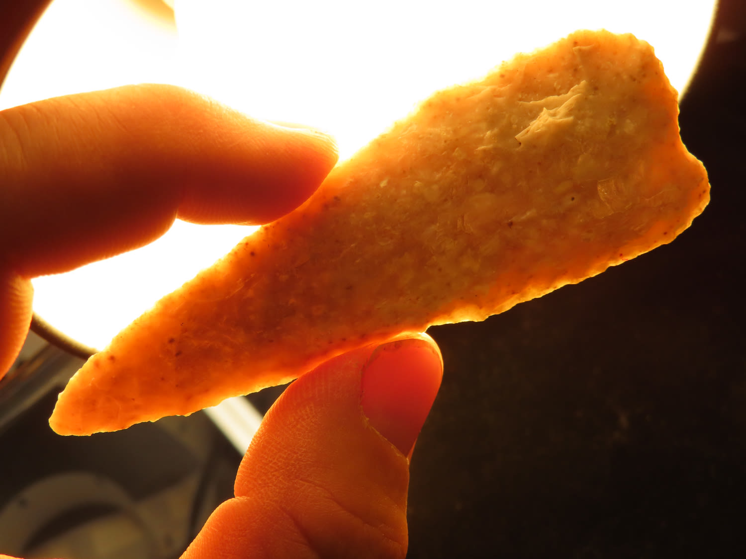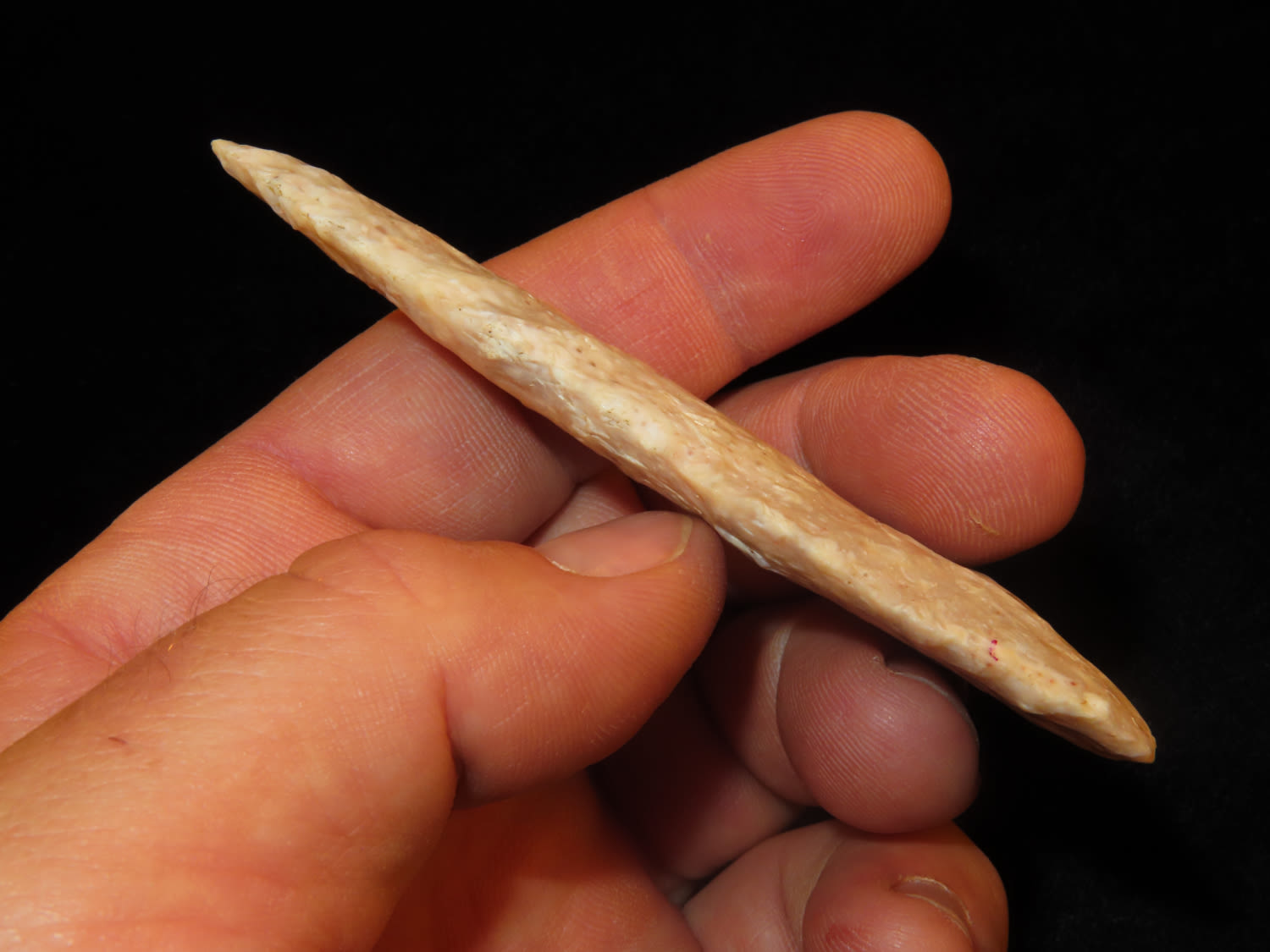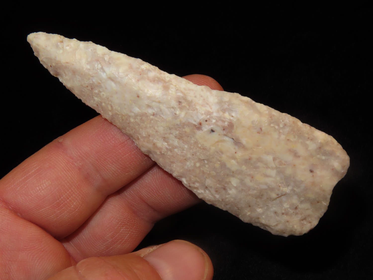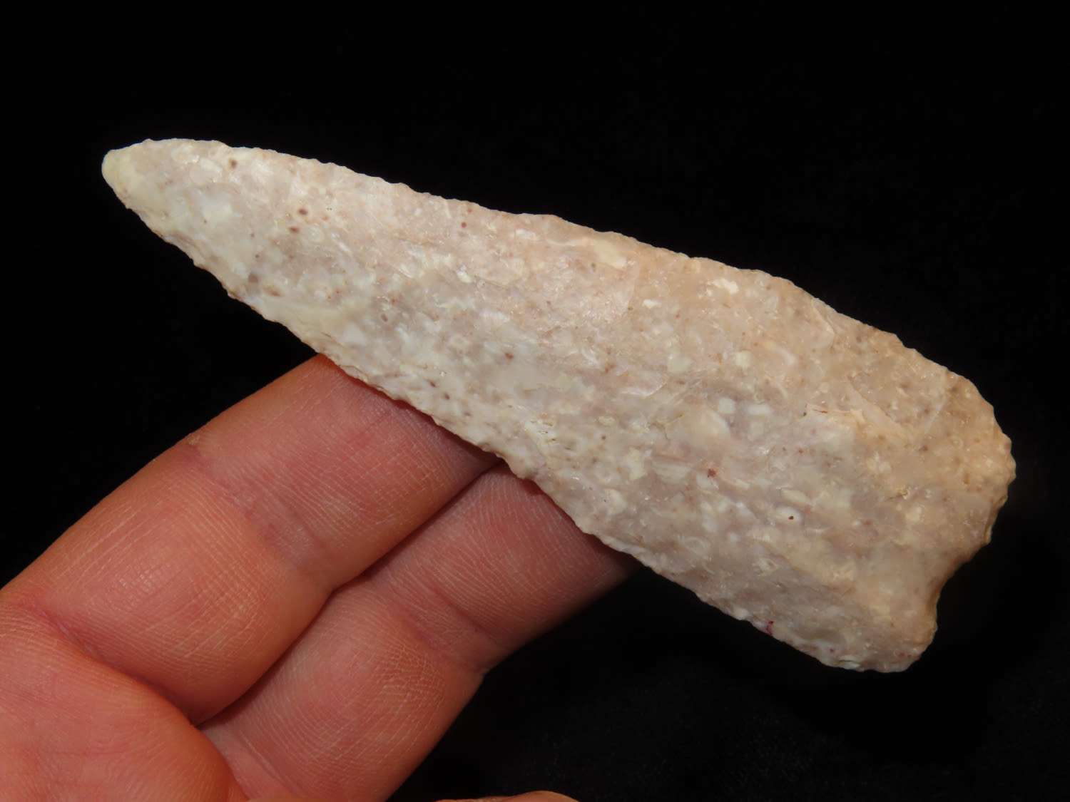 3 5/8″ Early Archaic Knife, Made from Creek Stained Fossilized Burlington Chert, Ex. Steve McCabe Collection, Milan, Sullivan County Missouri. Mr. McCabe collected from 1984 until 2022.