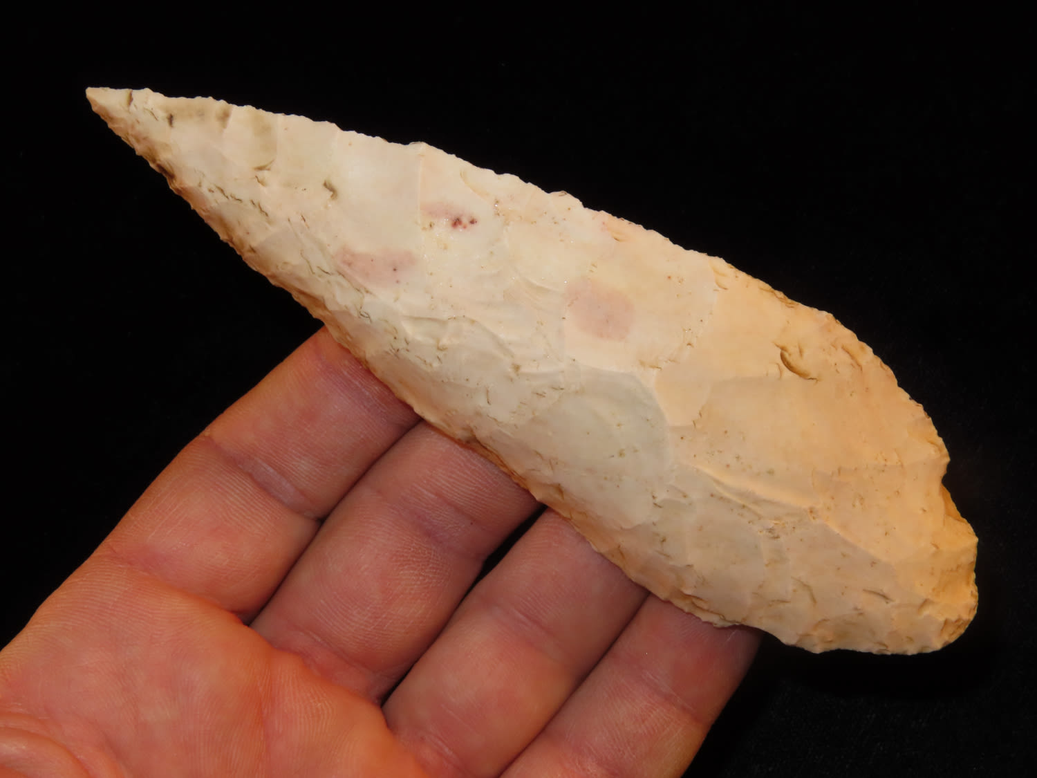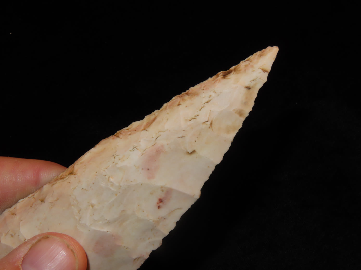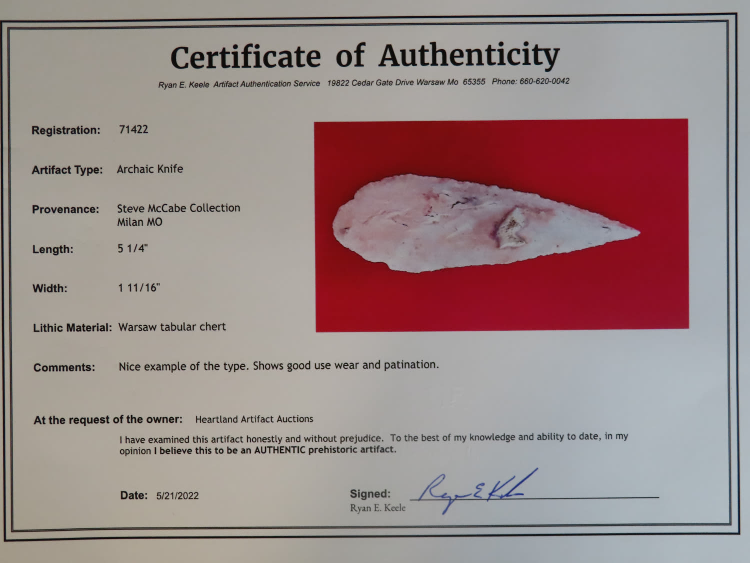 5 1/4″ Warsaw Tabular, Heavily Beveled Archaic Knife, Keele COA, Ex. Steve McCabe Collection, Milan, Sullivan County Missouri. Mr. McCabe collected from 1984 until 2022.