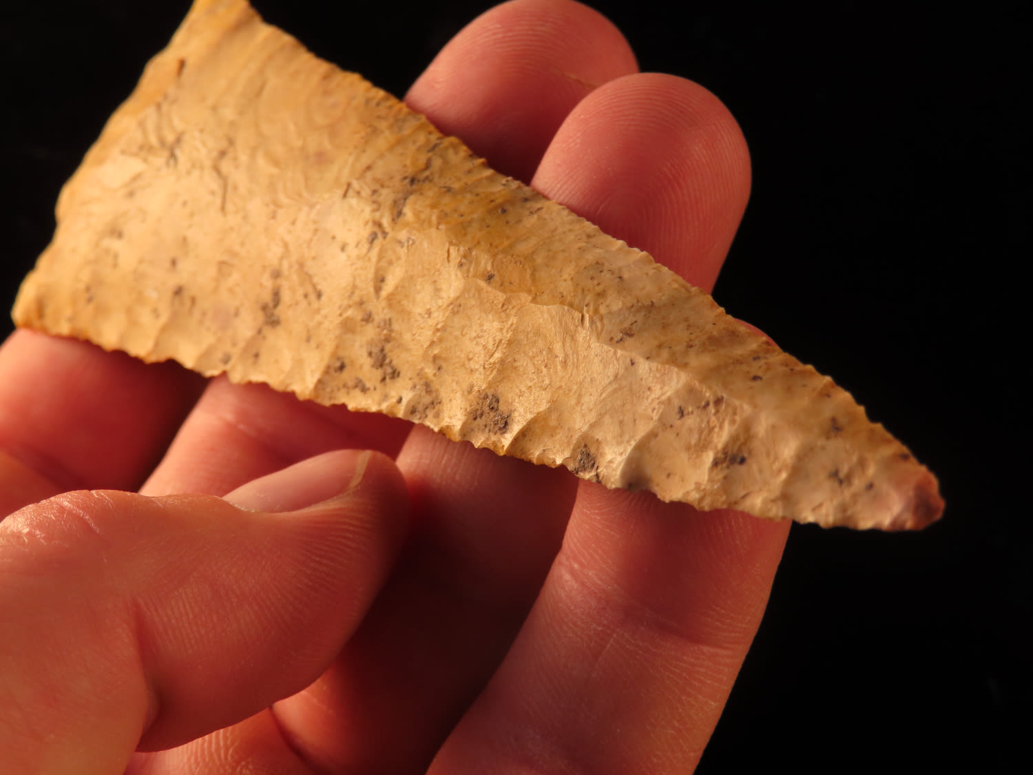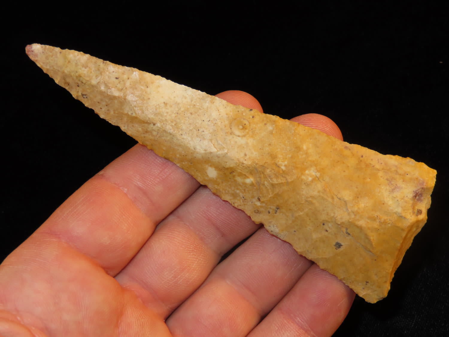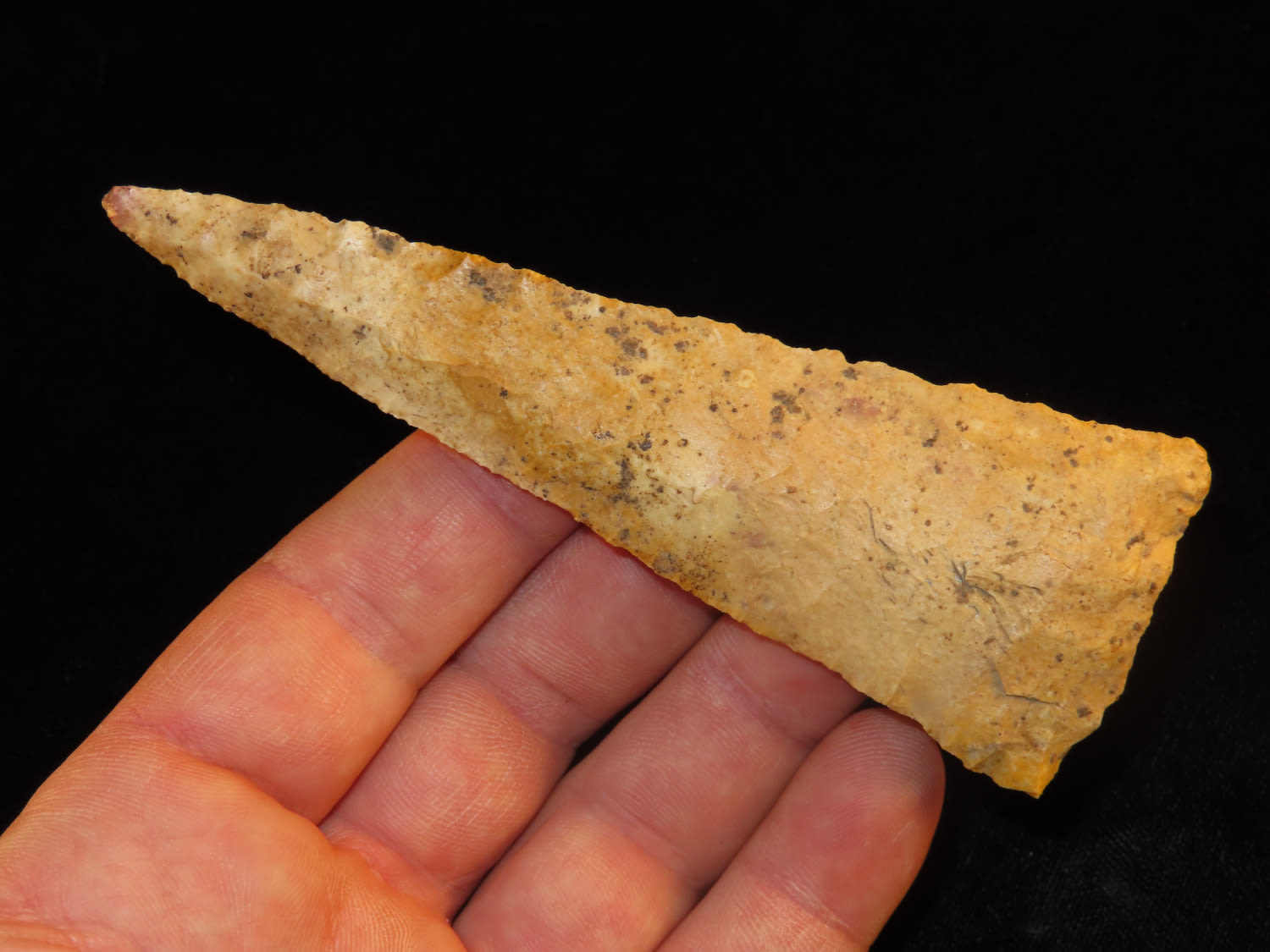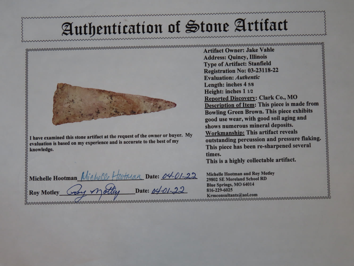 4 5/8″ Stanfield, Motley COA. Made from Bowling Green Brown, found in Clark Co Missouri-well flaked and nice beveling