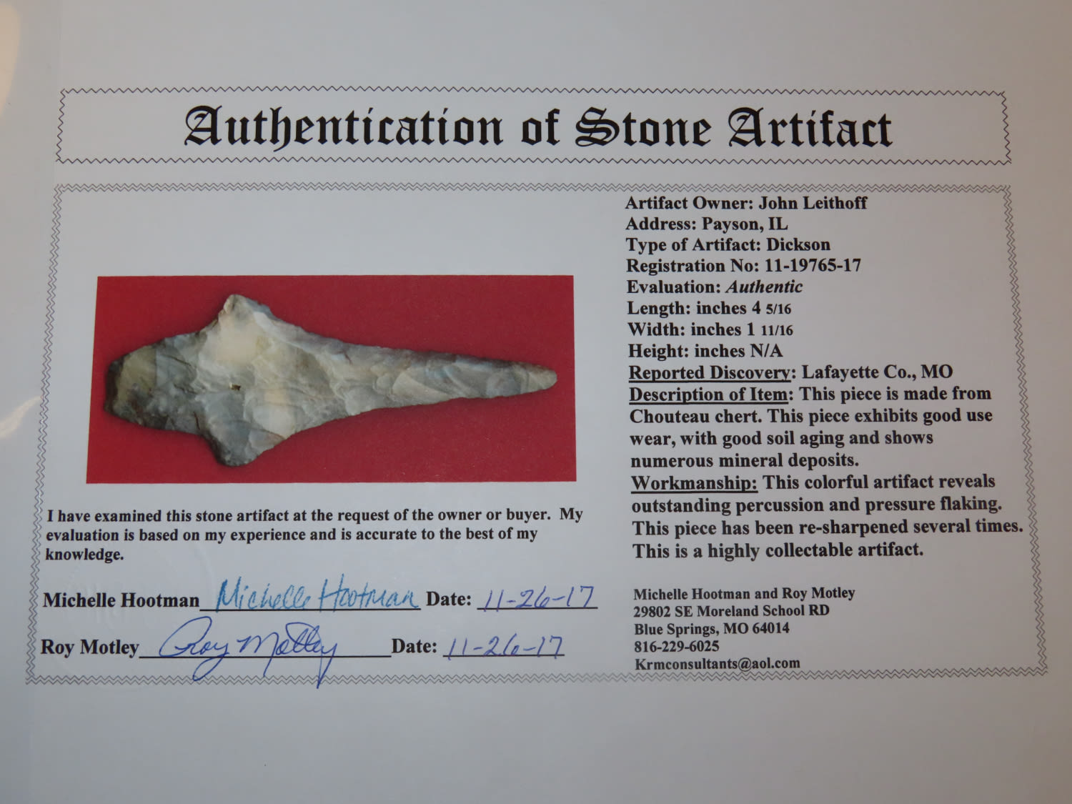 4 5/16″ Dickson, Motley COA, found in Lafayette Co Missouri, Make of Colorful Chouteau Chert Ex John Leithoff Collection