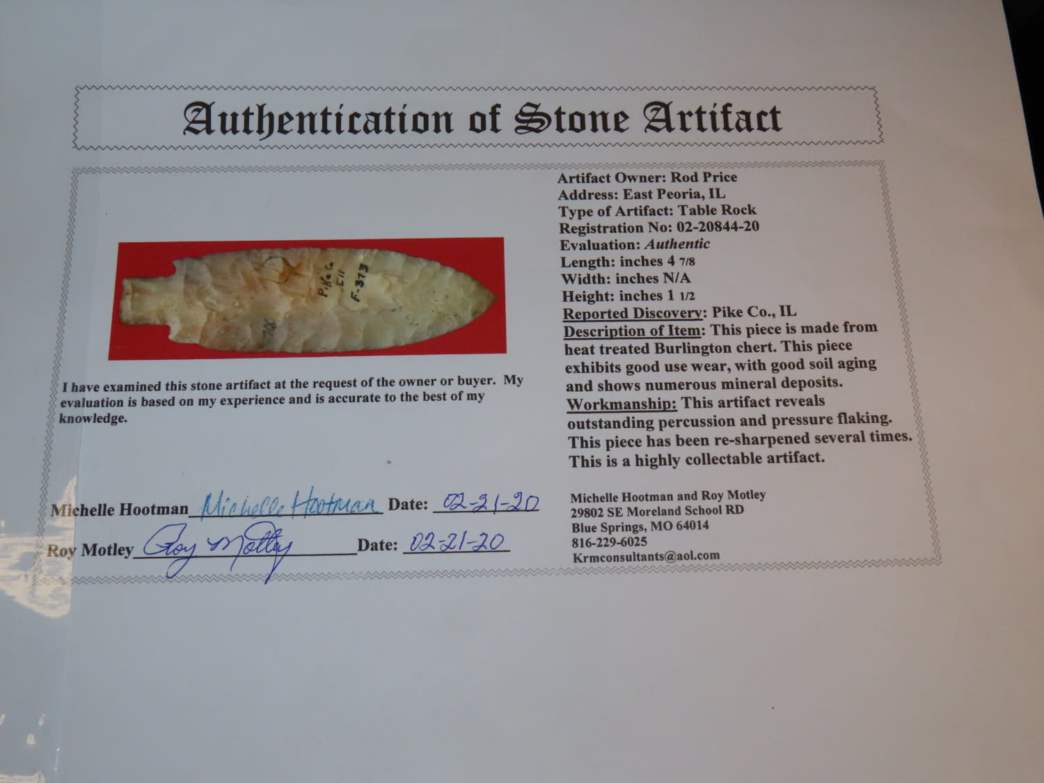 4 7/8″ Huge Table Rock, Motley COA, found in Pike Co Illinois, Ex Rod Price, Ex Herb Mangold Collection