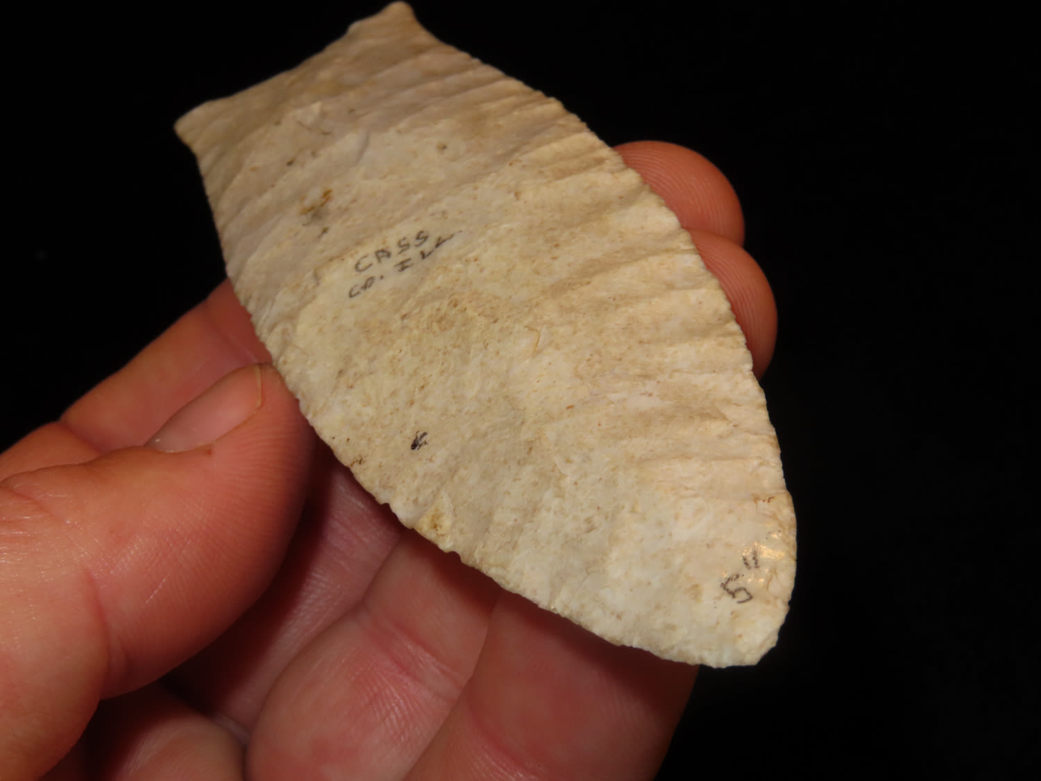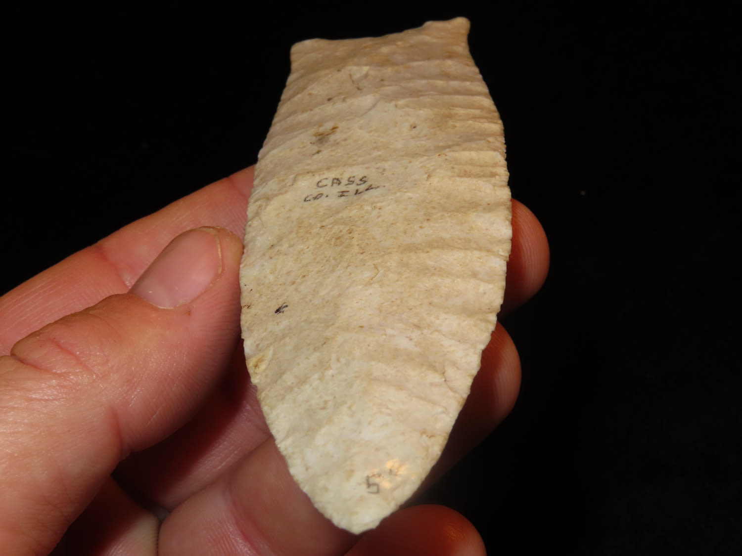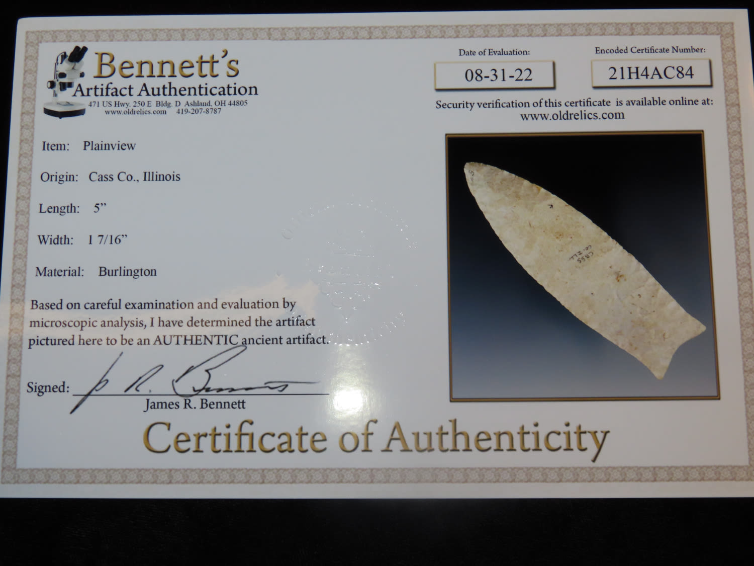 5″ Plainview, Bennett COA, made of Burlington Chert, found in Cass Co Illinois, Ex Mitch Lewis.