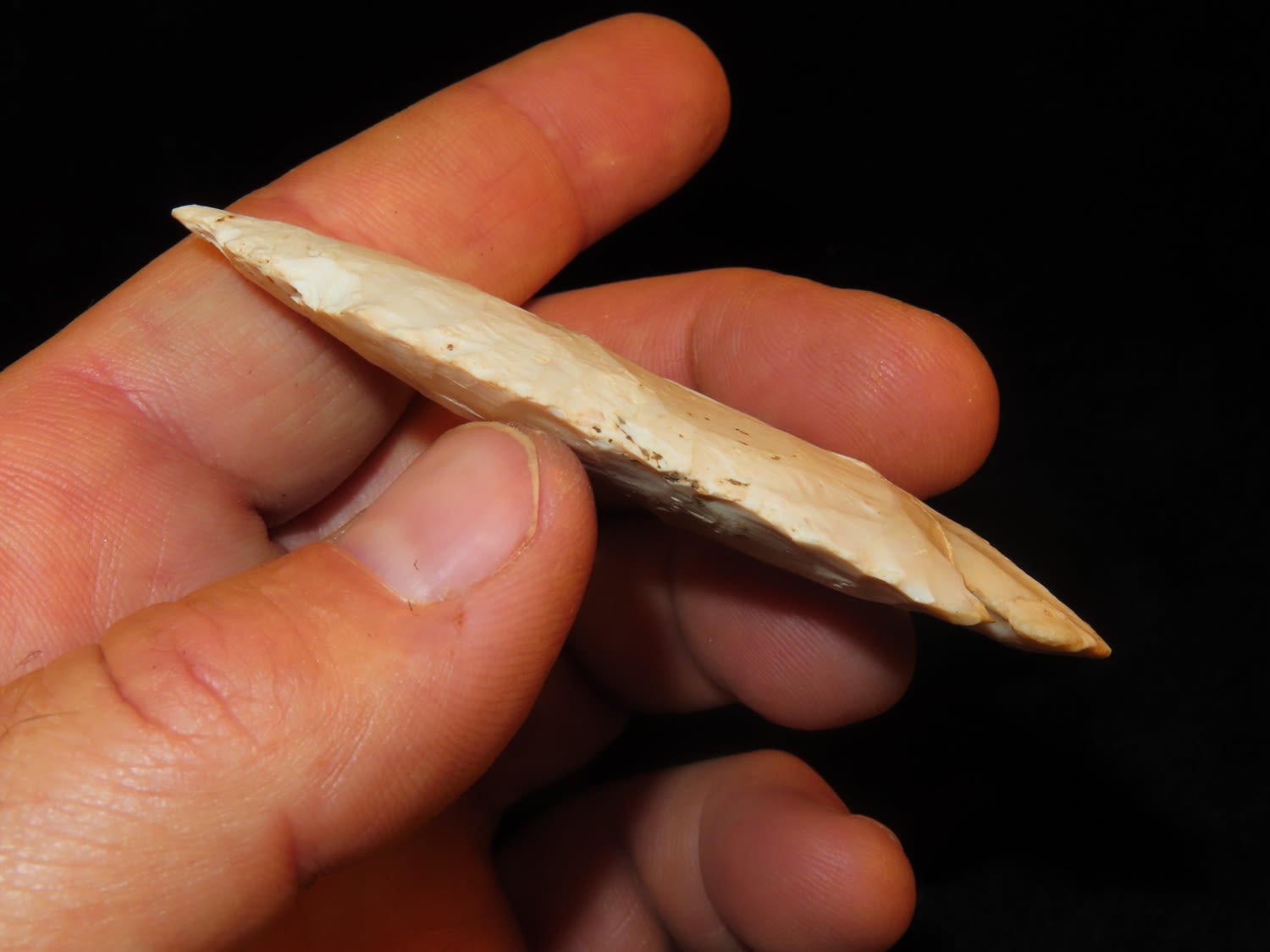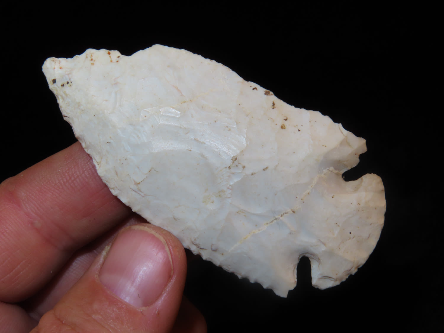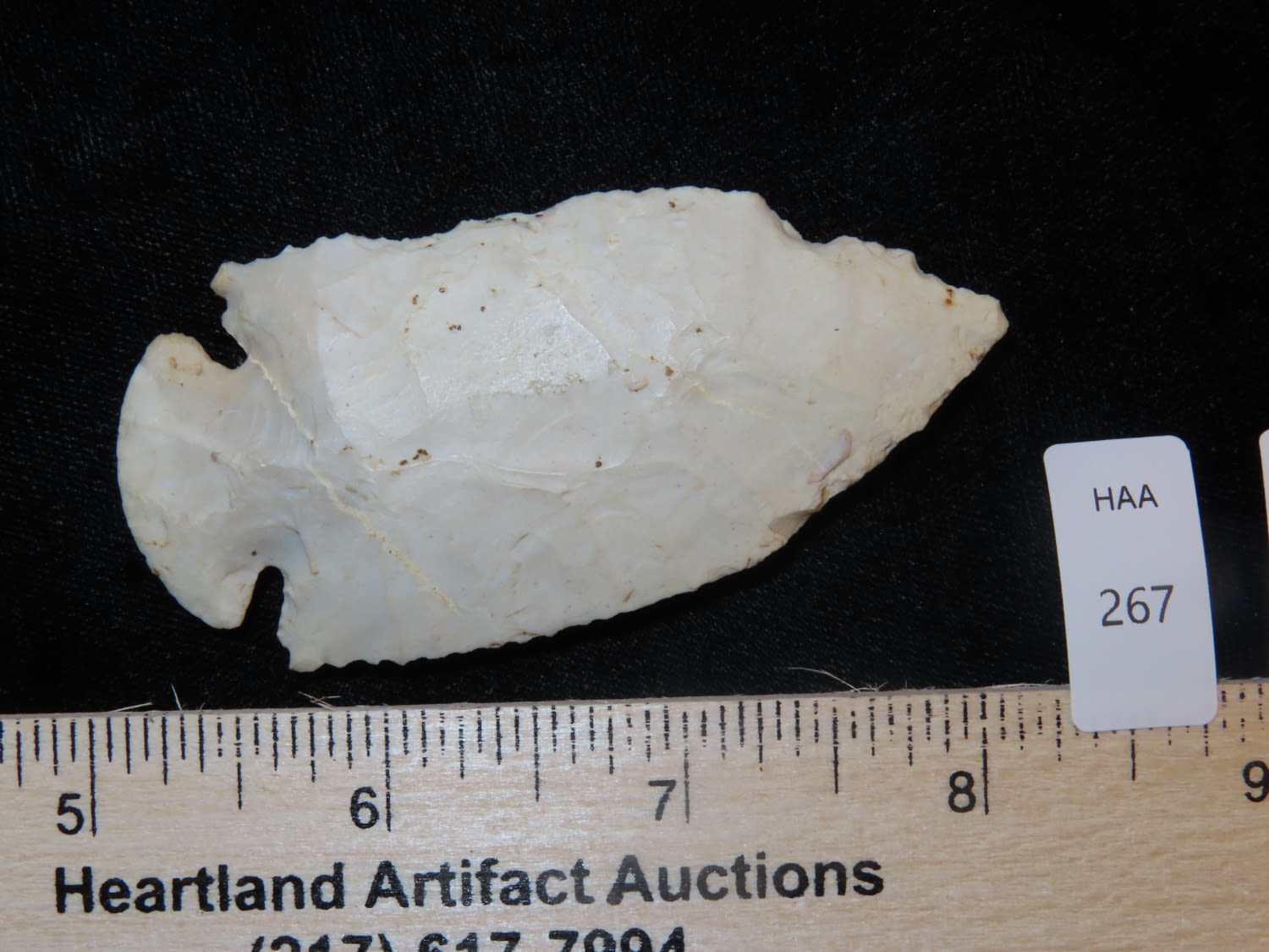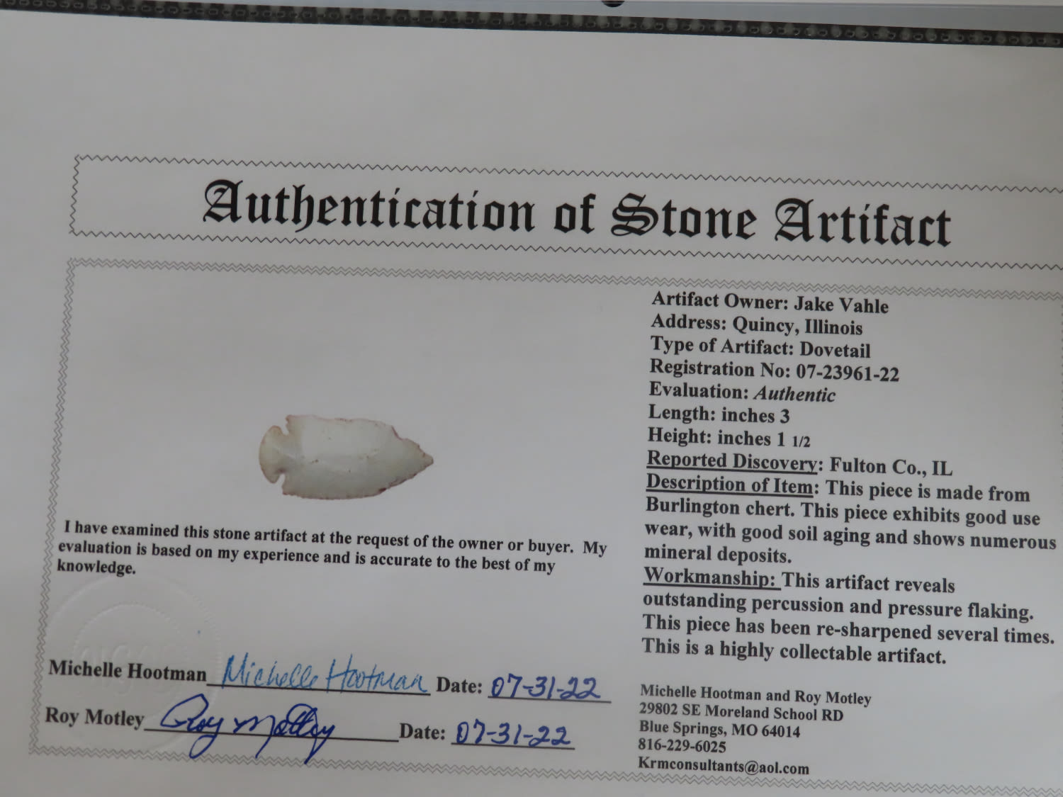 3″ Burlington Chert Dovetail, Motley COA, found in Fulton Co Illinois-Lots of history- re-sharpened several times, put to good use!