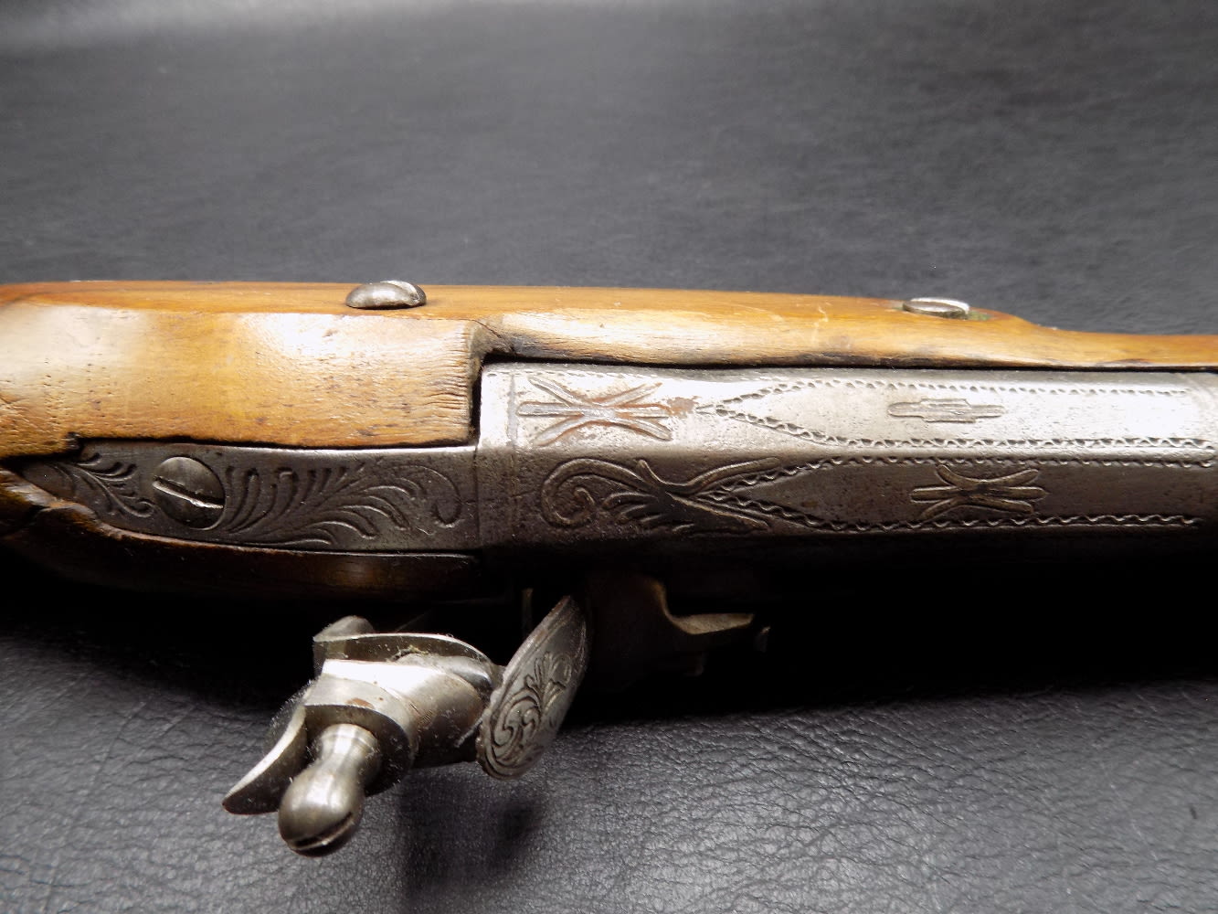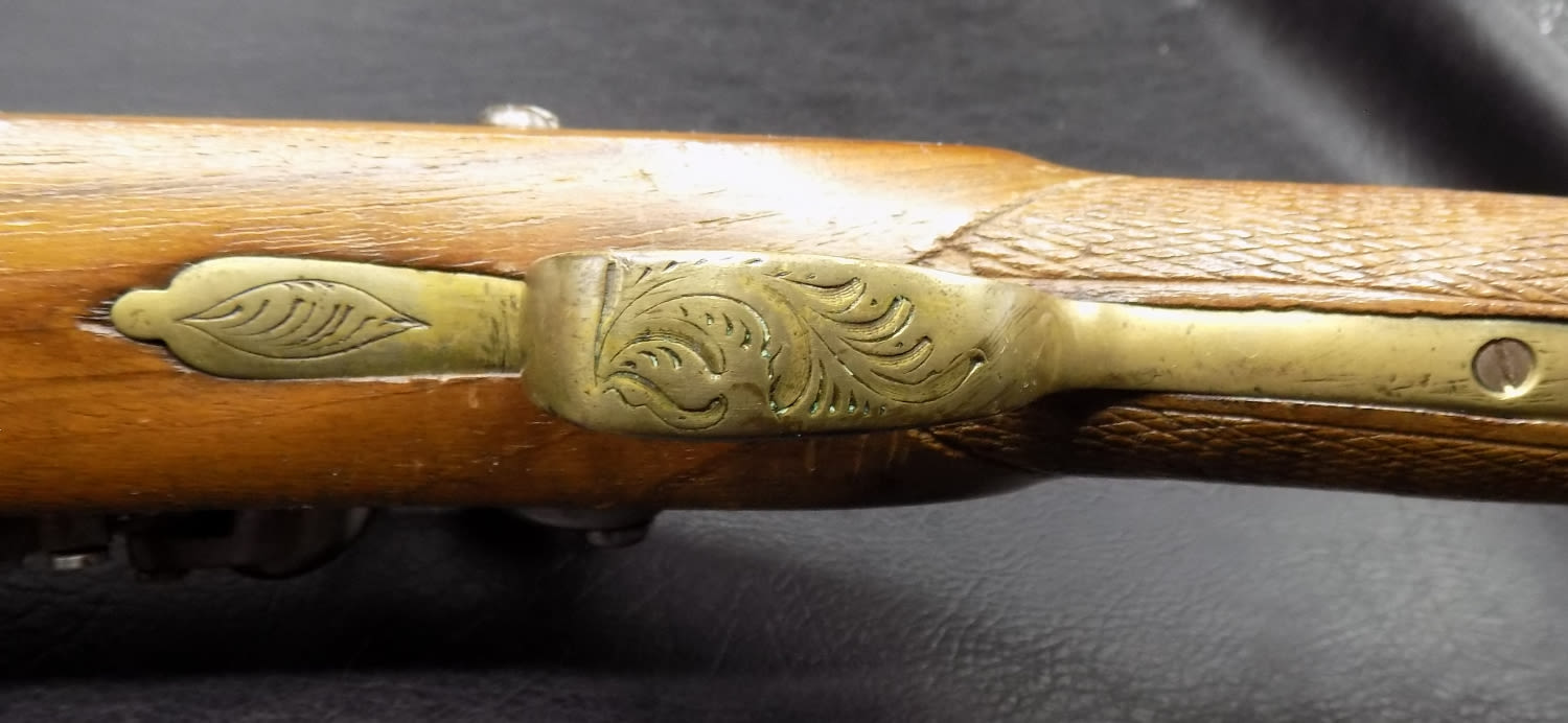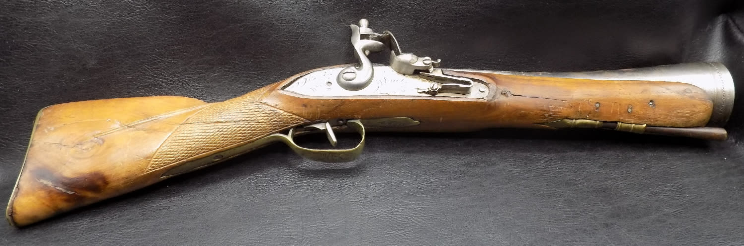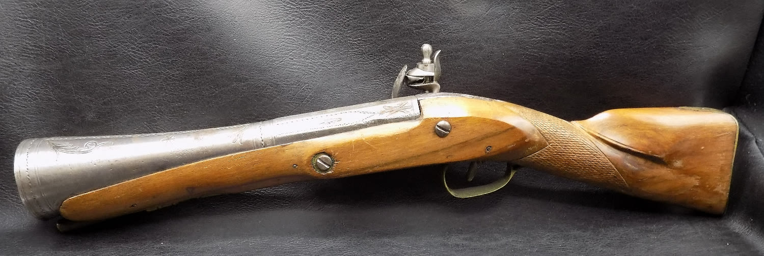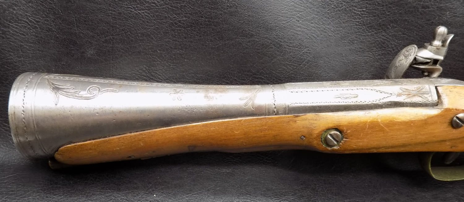 Antique 1775 to 1820 engraved flintlock blunderbuss pistol. Could be a pirate pistol. Not working. Measures 19 inches long.
