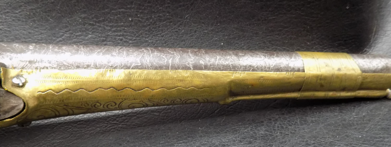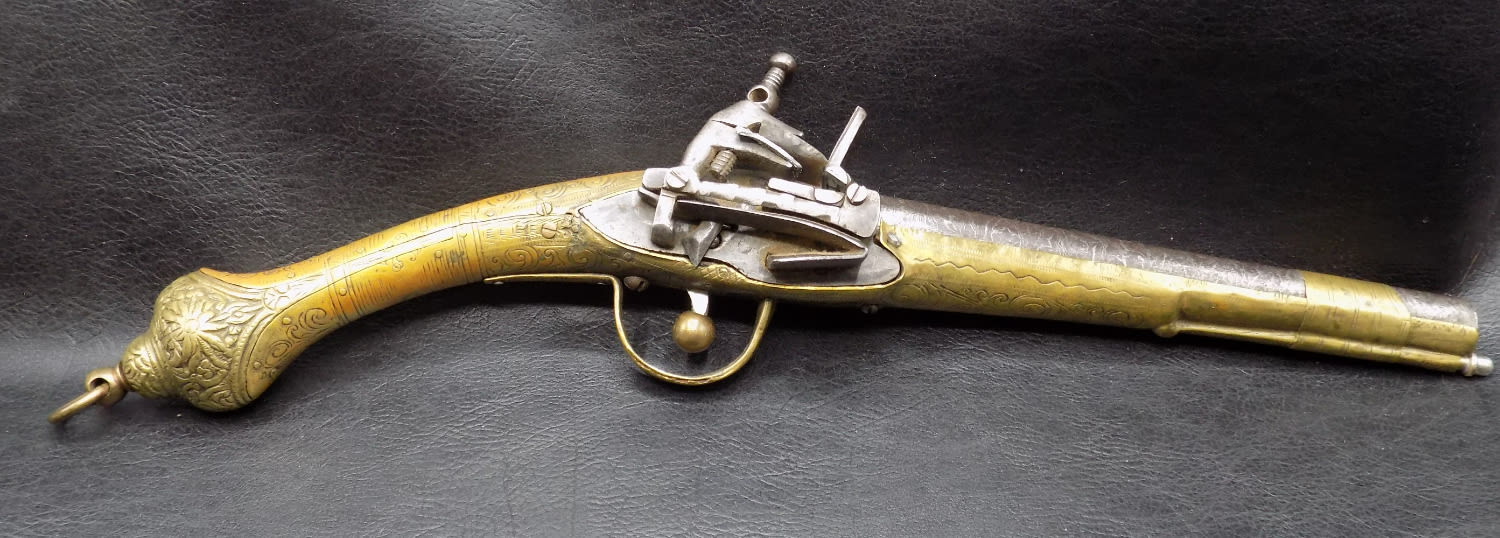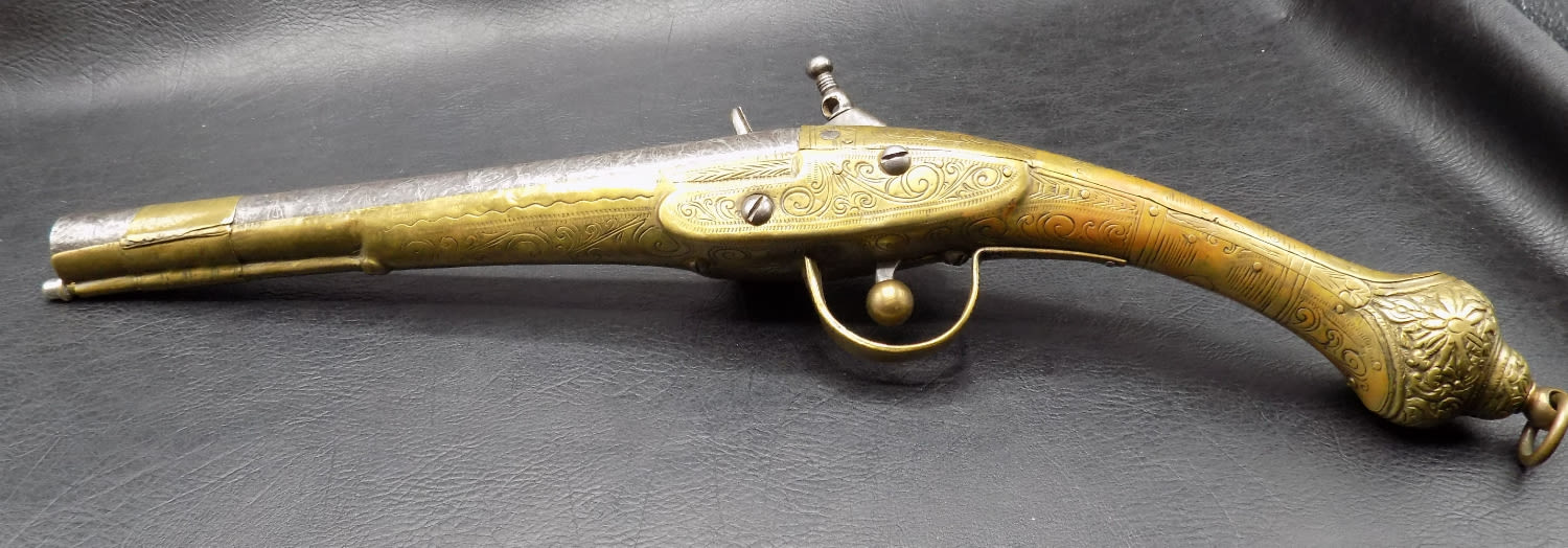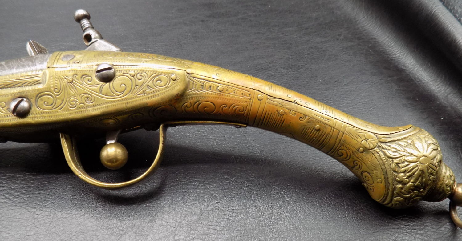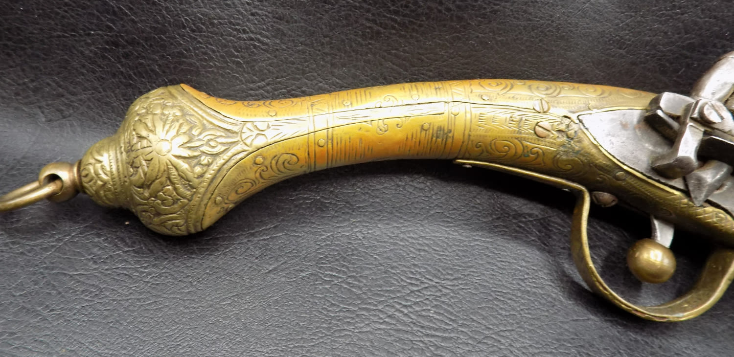 Very ornate antique rattail flintlock Miquelet pistol 1775 to 1825. 60 Gauge and 8 ½ inch barrel. In very good as found working condition. Elaborately engraved brass. Measures 16 inches long.