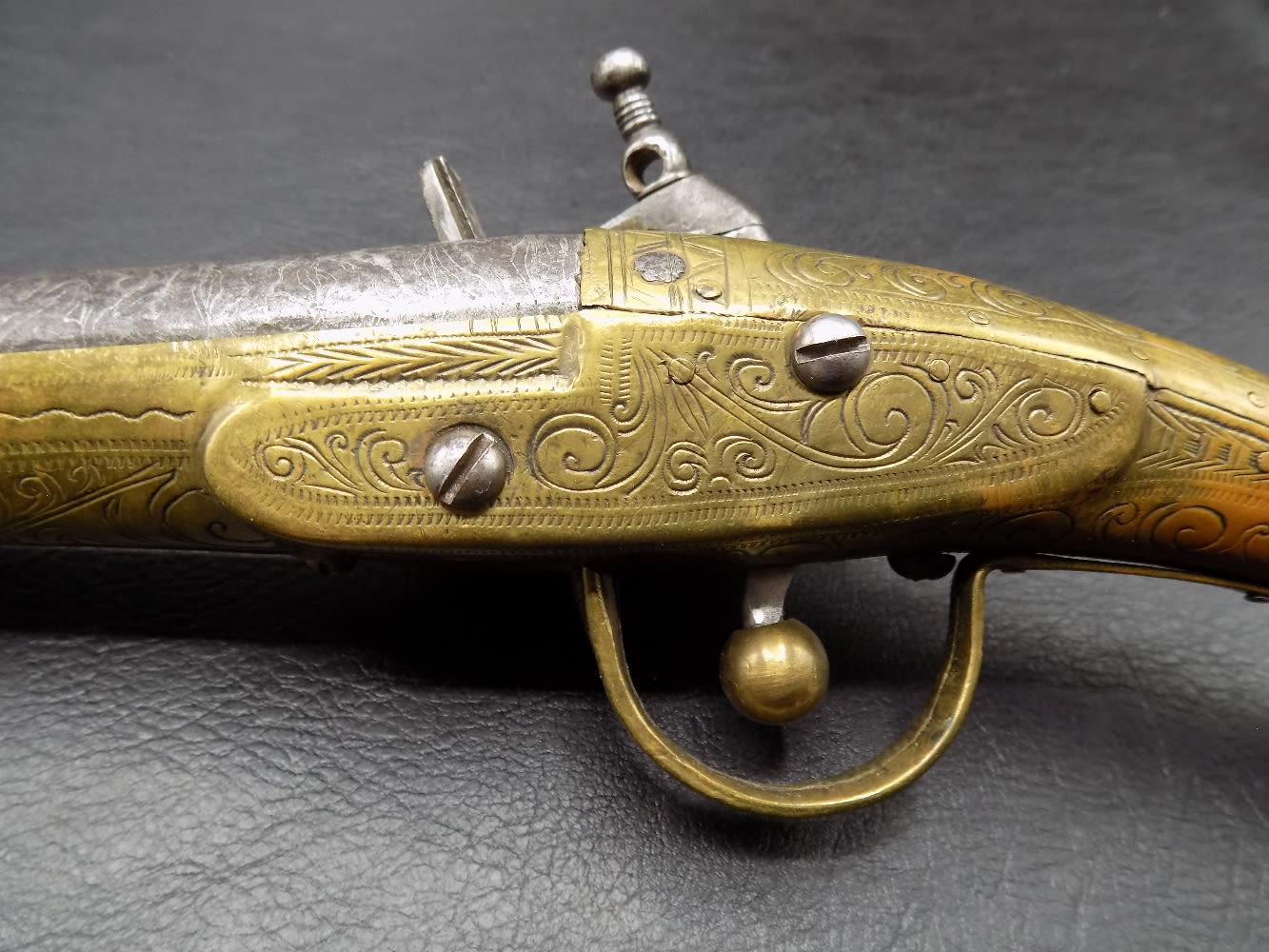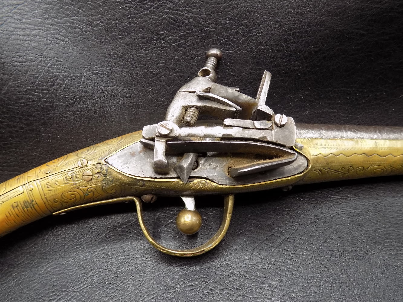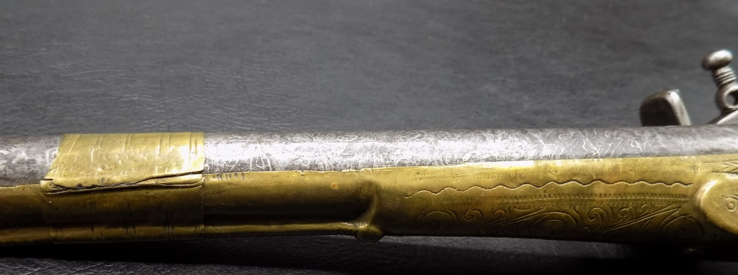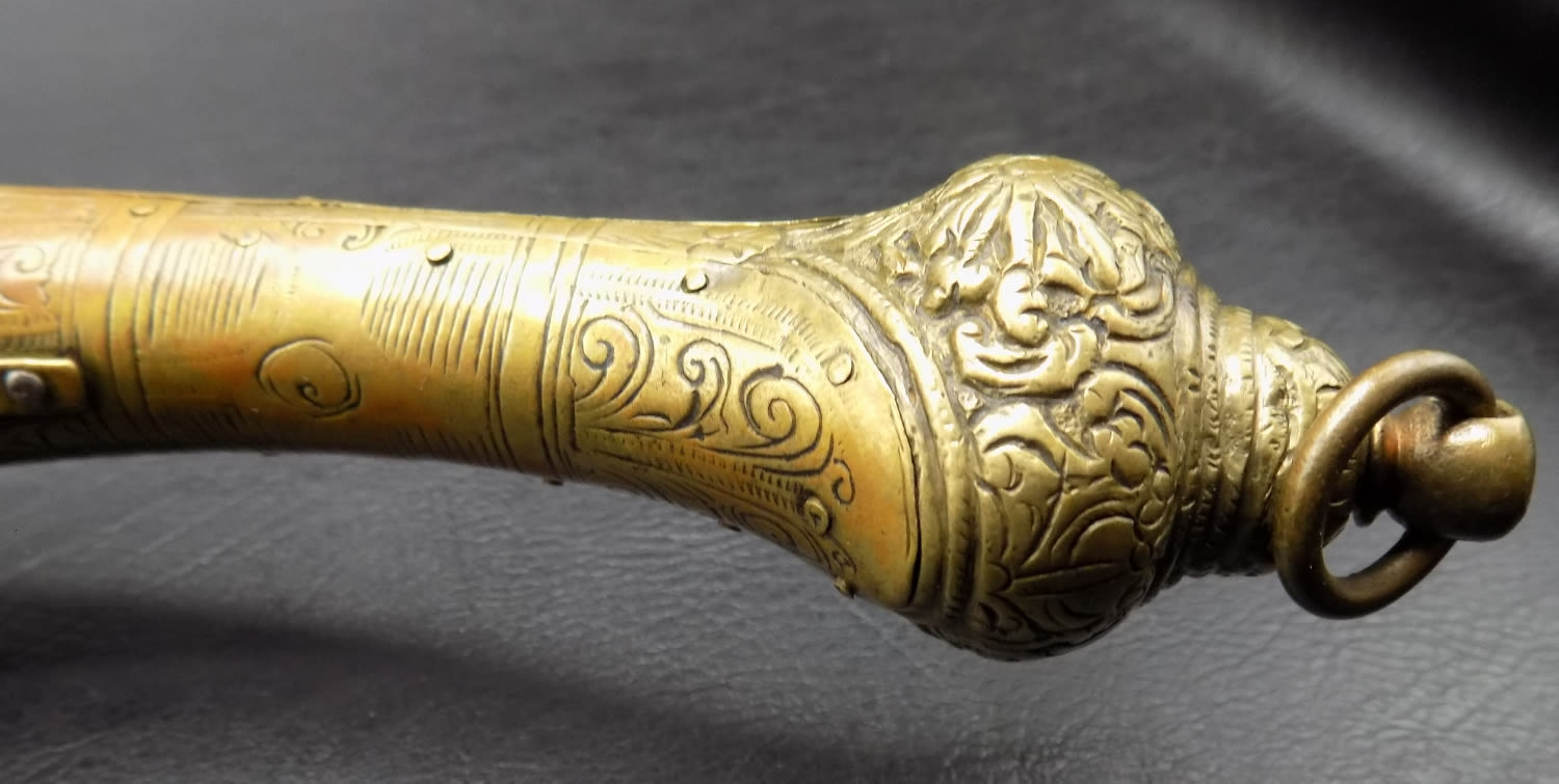 Very ornate antique rattail flintlock Miquelet pistol 1775 to 1825. 60 Gauge and 8 ½ inch barrel. In very good as found working condition. Elaborately engraved brass. Measures 16 inches long.