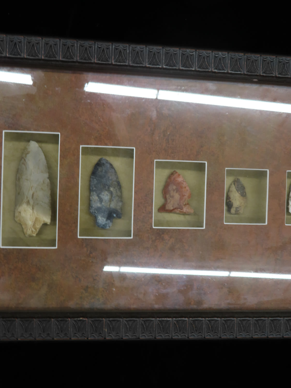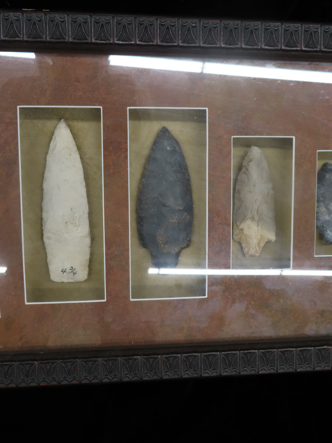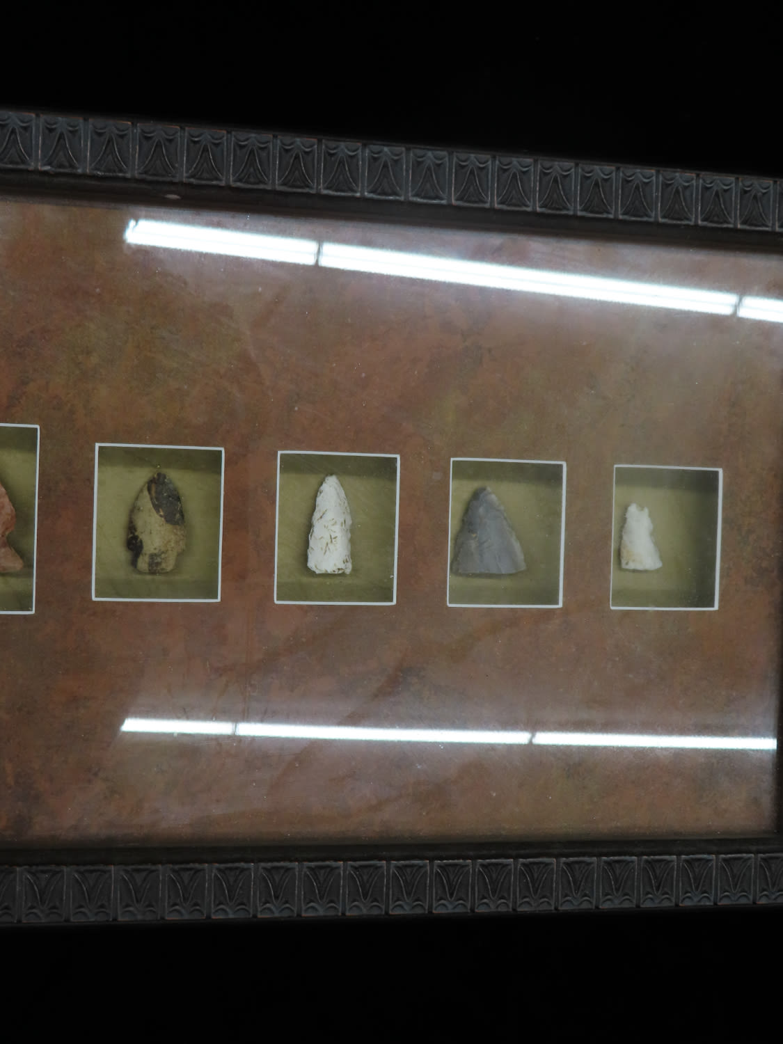 29″ x 10″ Shadow Box containing Arrowheads, found in Brown Co Illinois, Ex Richard Johnson Collection-some appear to have modern reworking