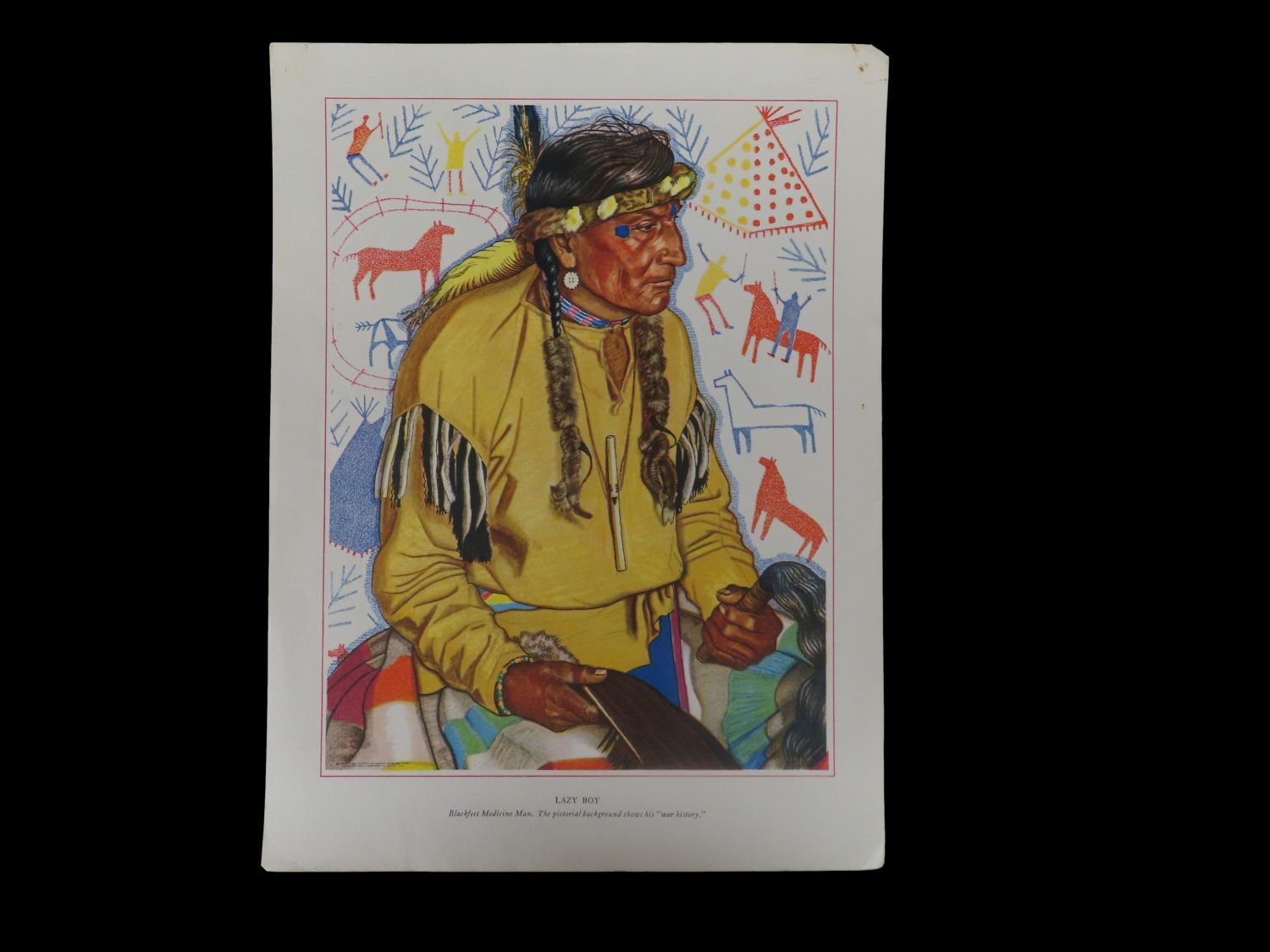 “Lazy Boy” – 9″ x 12″ by Winold Reiss – collection of Native American portraits (lithographs) Reiss immigrated to America in 1913 and was captivated by Native Americans. It was an interest and subject matter throughout his entire career. He was a success very early, lecturing before the Art Students League and even founding a publication, Modern Art Collector. He made over 250 paintings of Native Americans, especially the Blackfeet, publishing portfolios of his subjects.