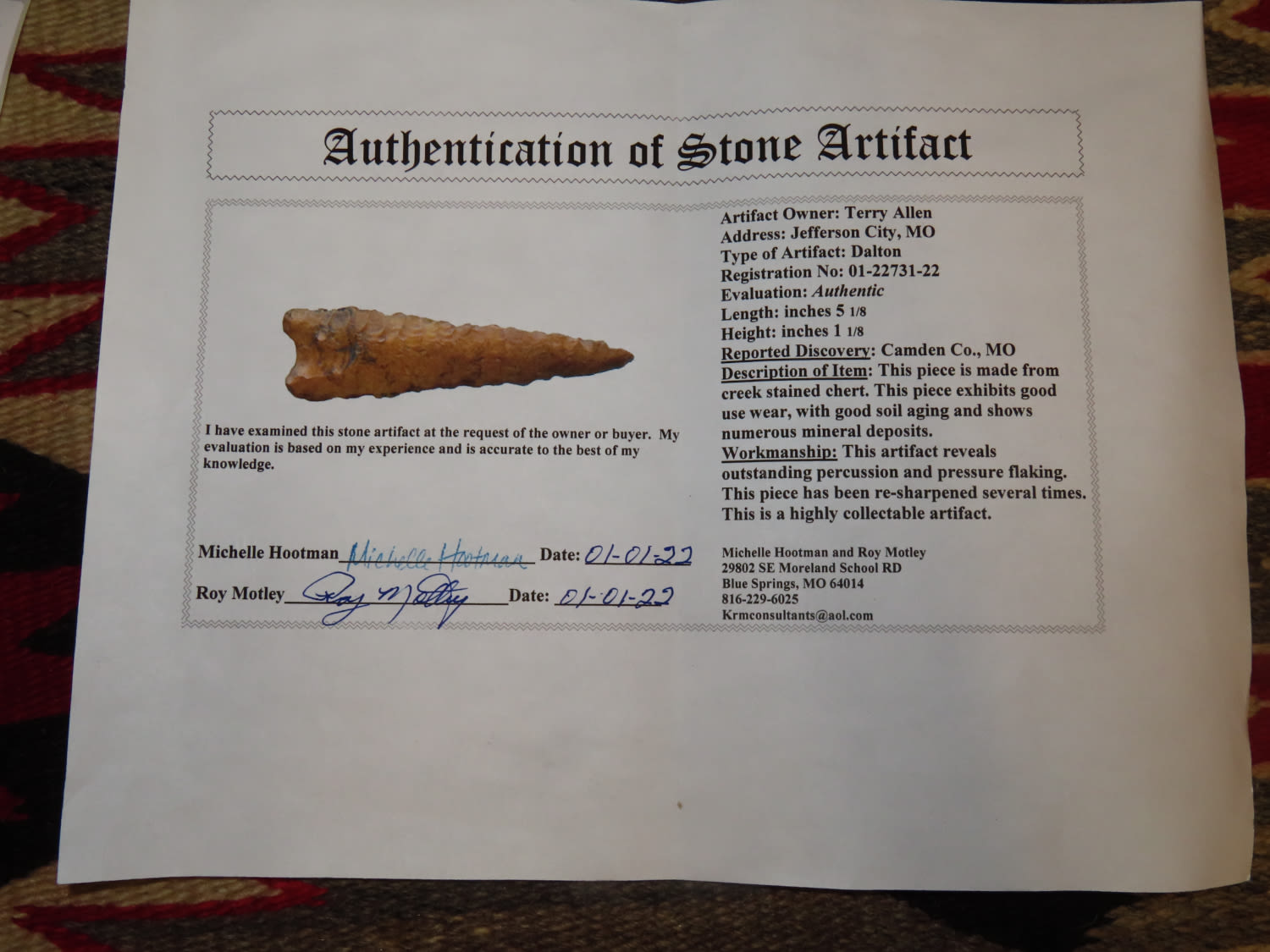 5 1/8″ Dalton Motley COA found in Camden County, Missouri