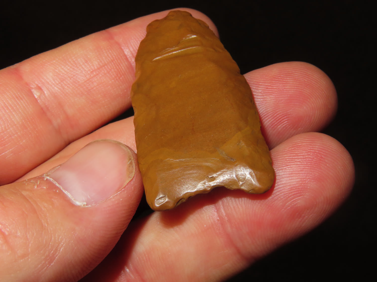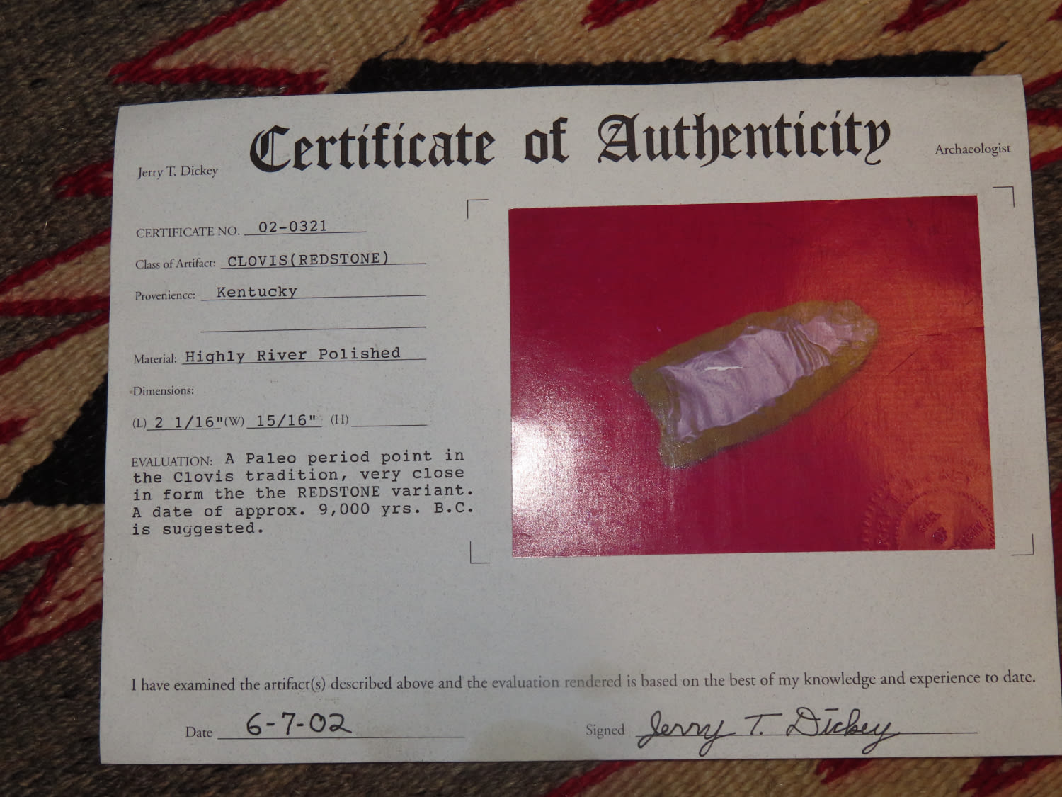 2 1/16″ Red Stone Clovis Well Fluted Dickey COA found in Kentucky