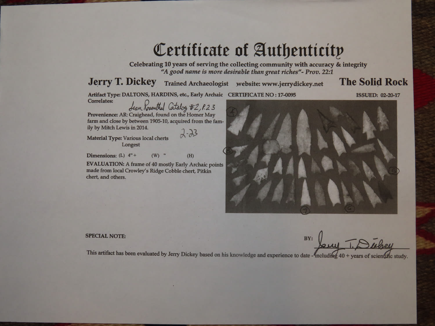 2 1/2" Beveled Dalton, Dickey COA copy from a grouping he papered, found in Craighead County, Arkansas by Homer May between 1905-1910, ex Sean Rosenthal