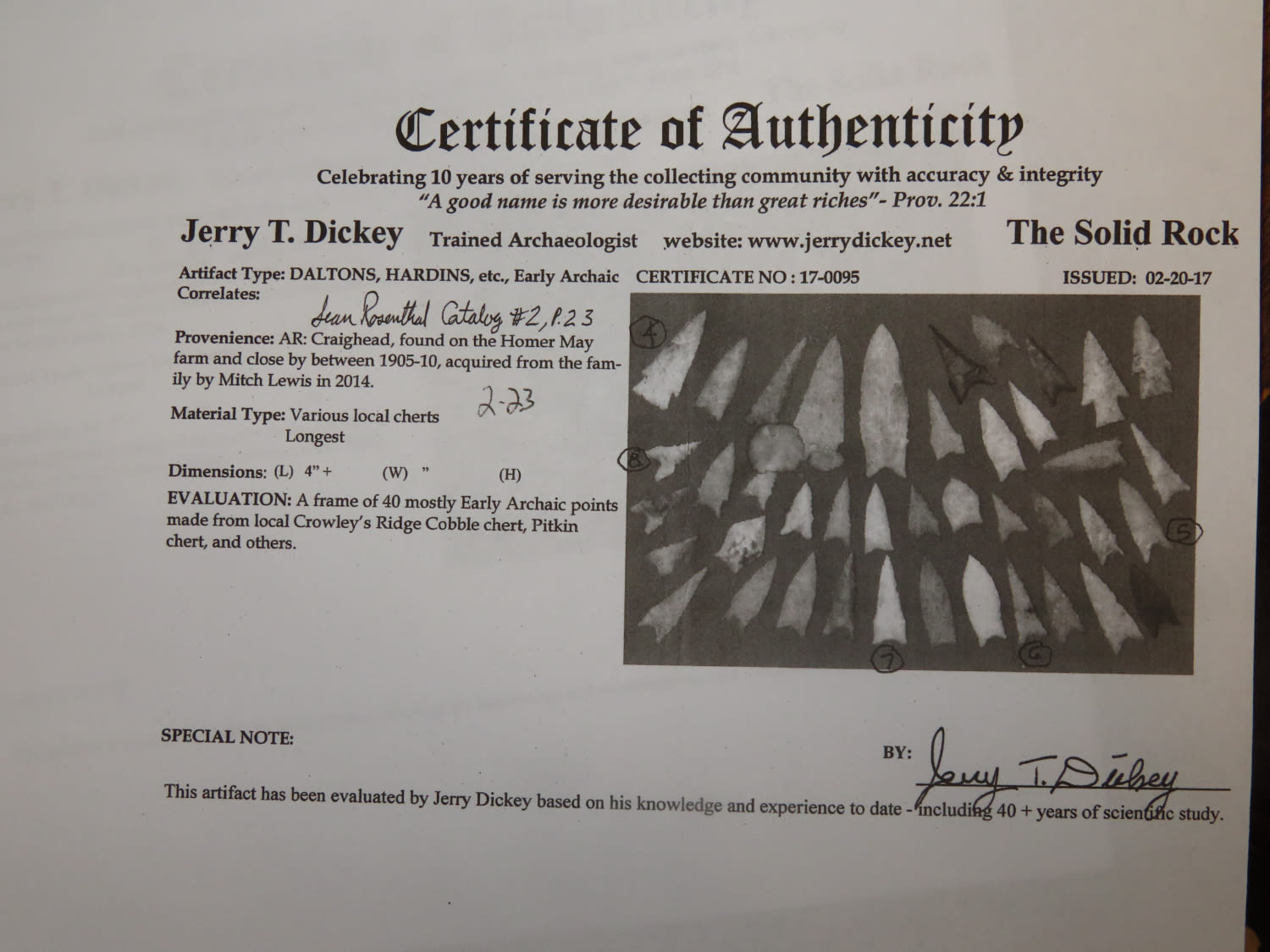 1 3/4″ Dalton, Dickey COA copy from a grouping he papered, found in Craighead County, Arkansas by Homer May between 1905-1910, ex Sean Rosenthal