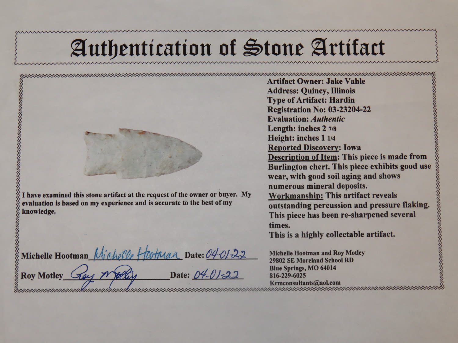 2 7/8″ Fishtail Hardin, Motely COA, found in Iowa, made of Burlington Chert and finely developed