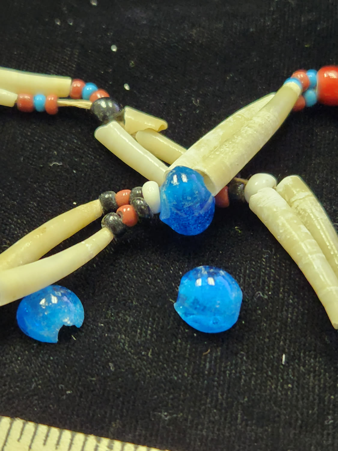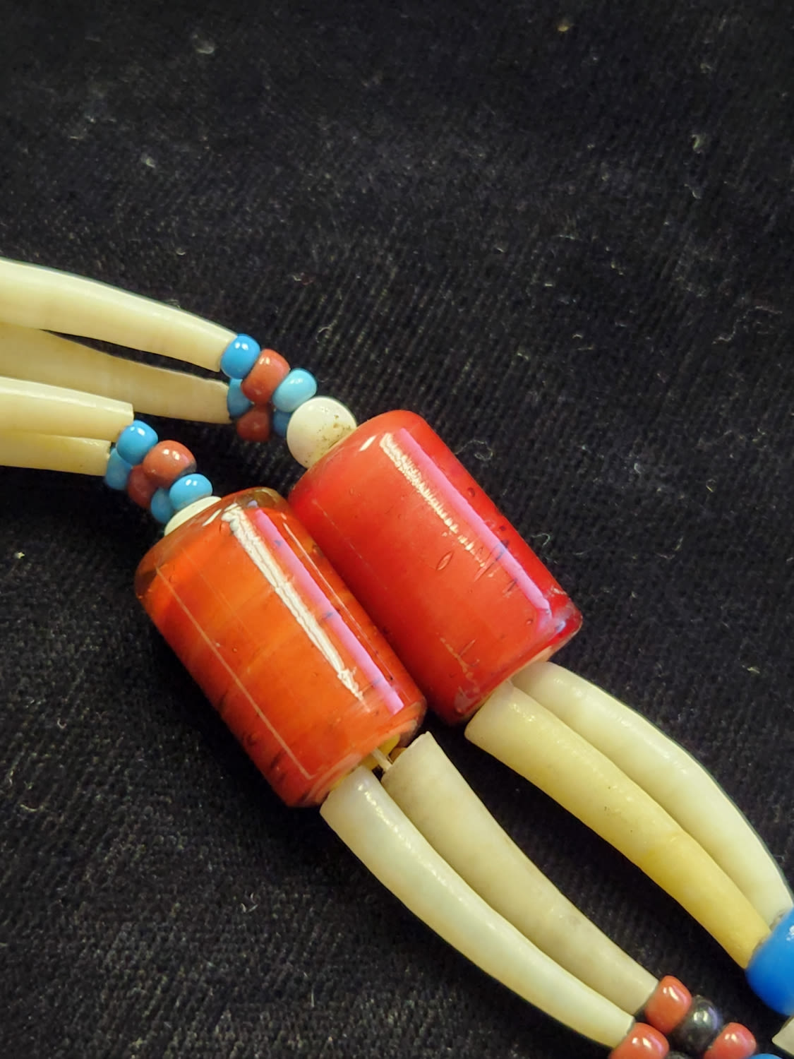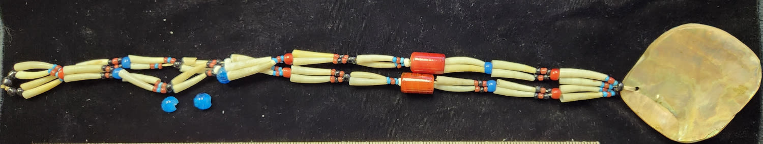 Dentalium, as commonly used by Native American artists and anthropologists, refers to tooth shells or tusk shells used in indigenous jewelry, adornment, and commerce in western Canada and the United States. These tusk shells are a kind of seashell, specifically the shells of scaphopod mollusks. Peoples of the Northwest Pacific Coast would trade dentalium into the Great Plains, Great Basin, Central Canada, Northern Plateau and Alaska for other items